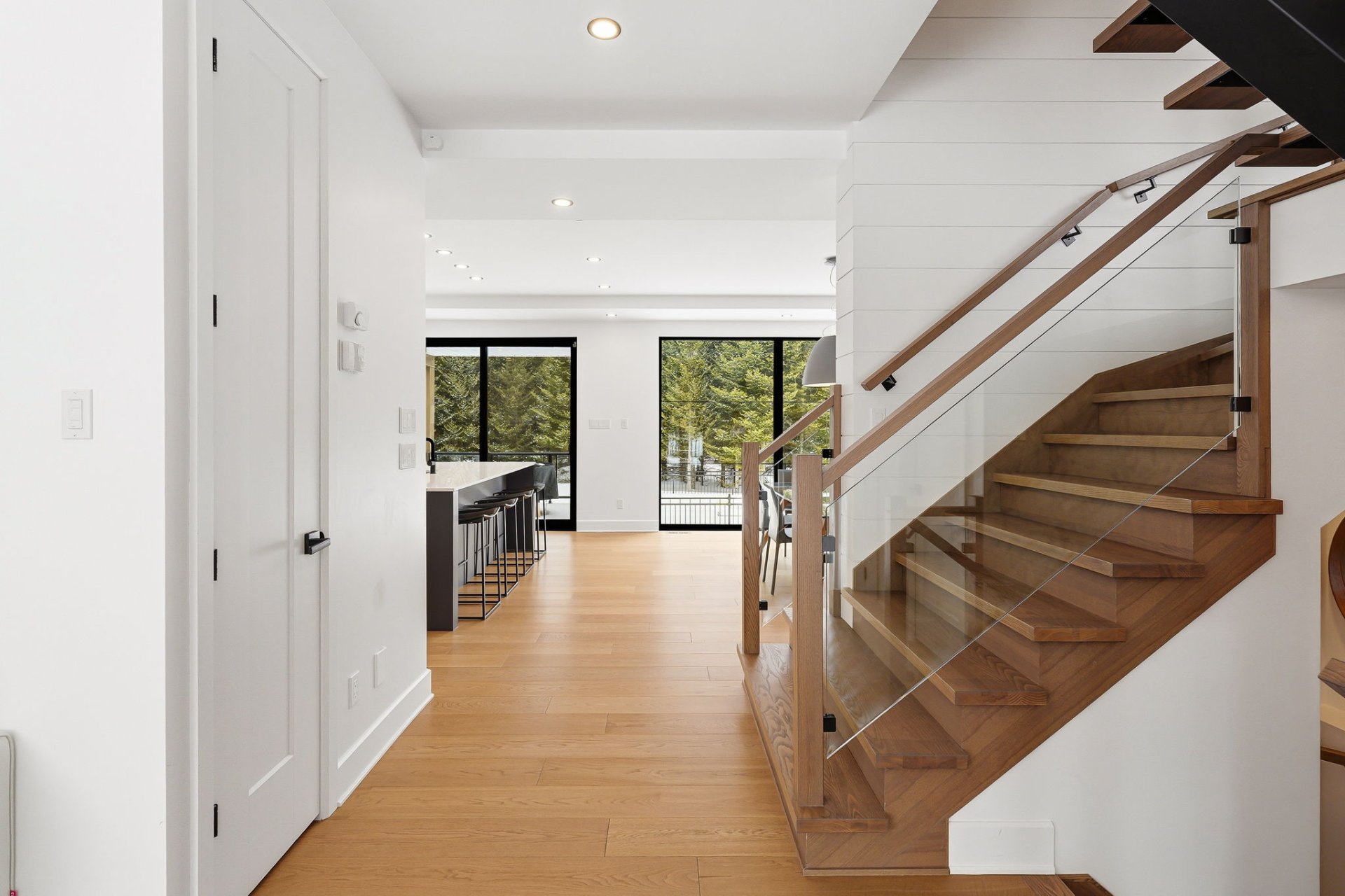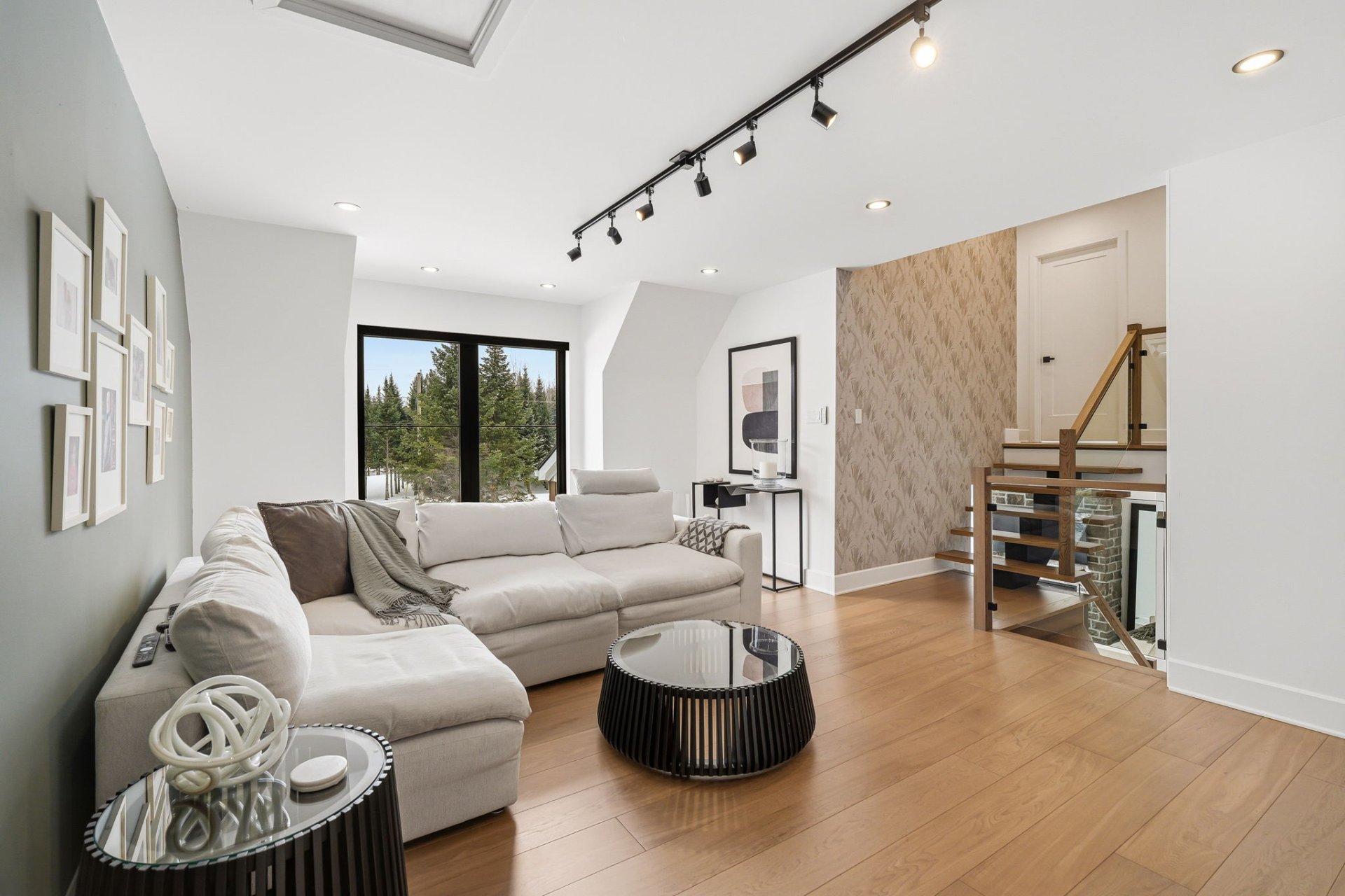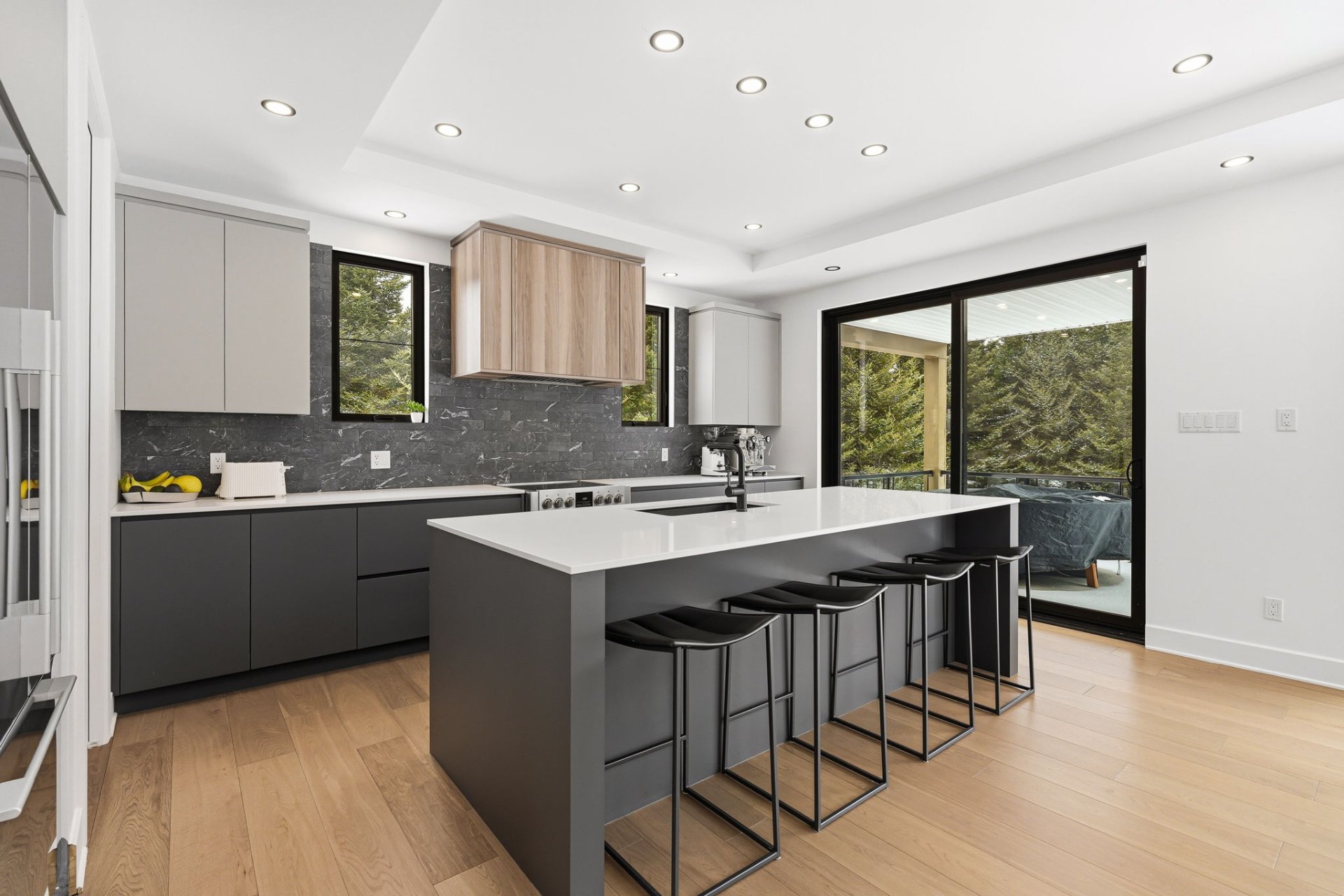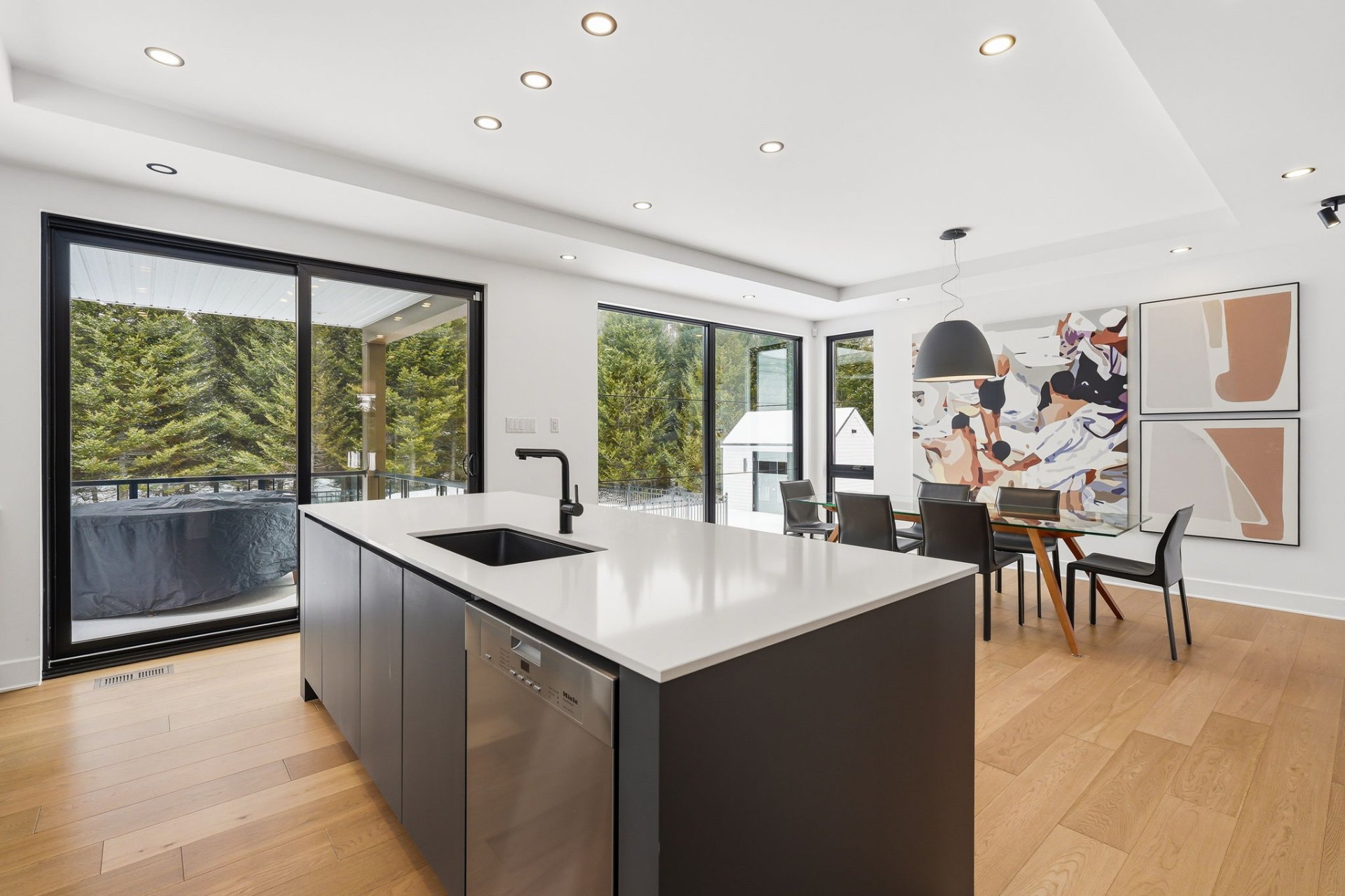 À l'intérieur, les espaces sont baignés de lumière grâce à une fenestration abondante qui laisse entrer une luminosité naturelle généreuse tout au long de la journée, créant une atmosphère à la fois vivante et apaisante. Le rez-de-chaussée propose une aire de vie ouverte où le salon s'articule autour d'un foyer habillé de pierre. La cuisine, au design chic et moderne, marie fonctionnalité et esthétisme avec son îlot central surdimensionné et ses finitions haut de gamme. Elle s'ouvre naturellement sur la salle à manger, créant un espace convivial idéal pour recevoir. Une salle d'eau complète ce niveau.