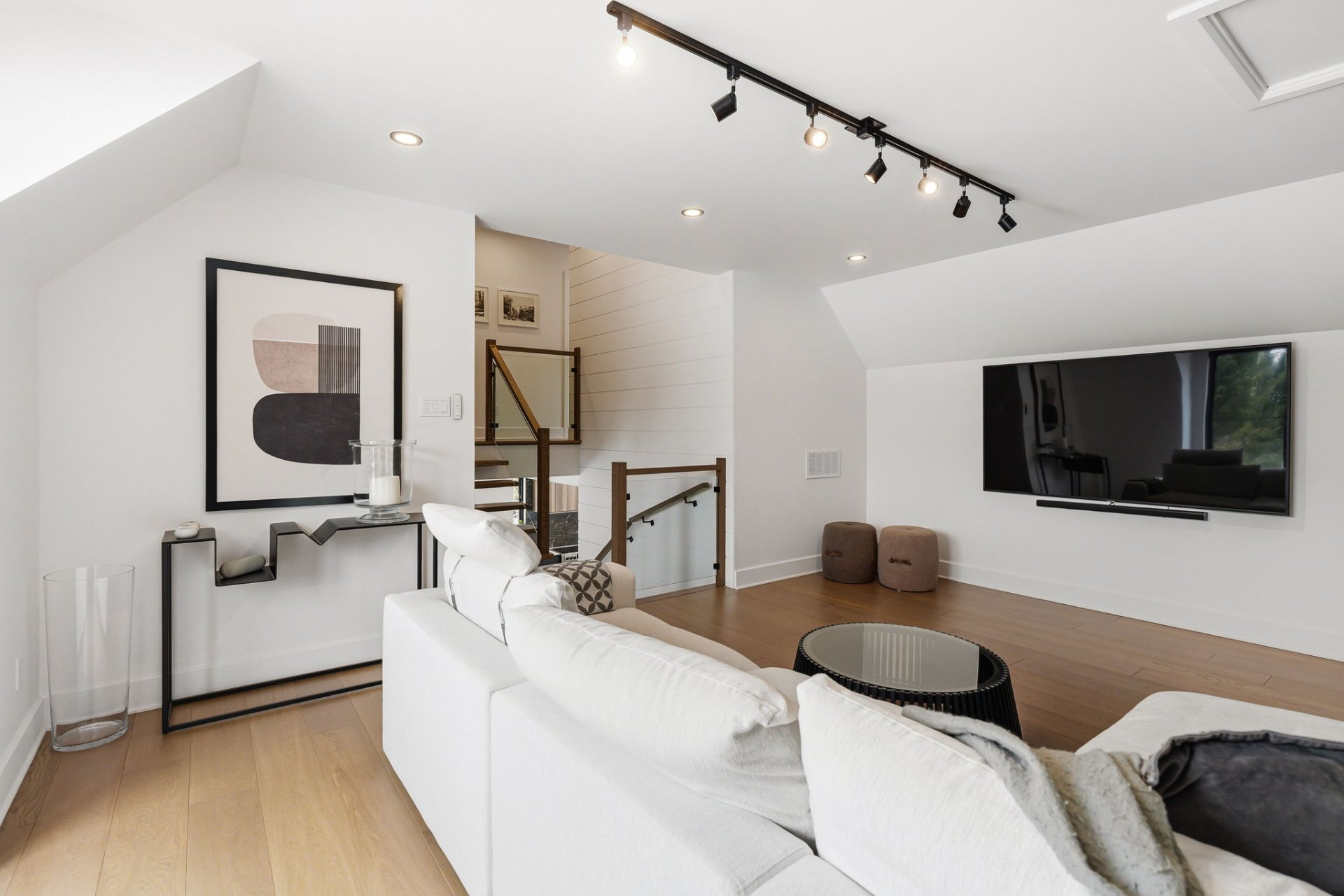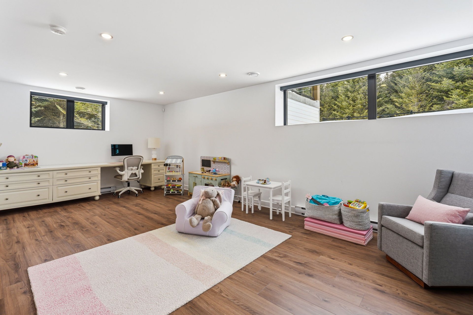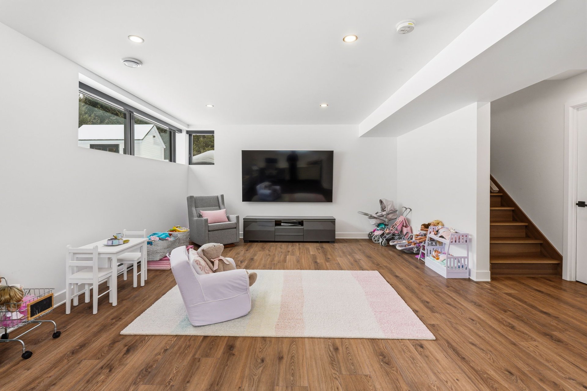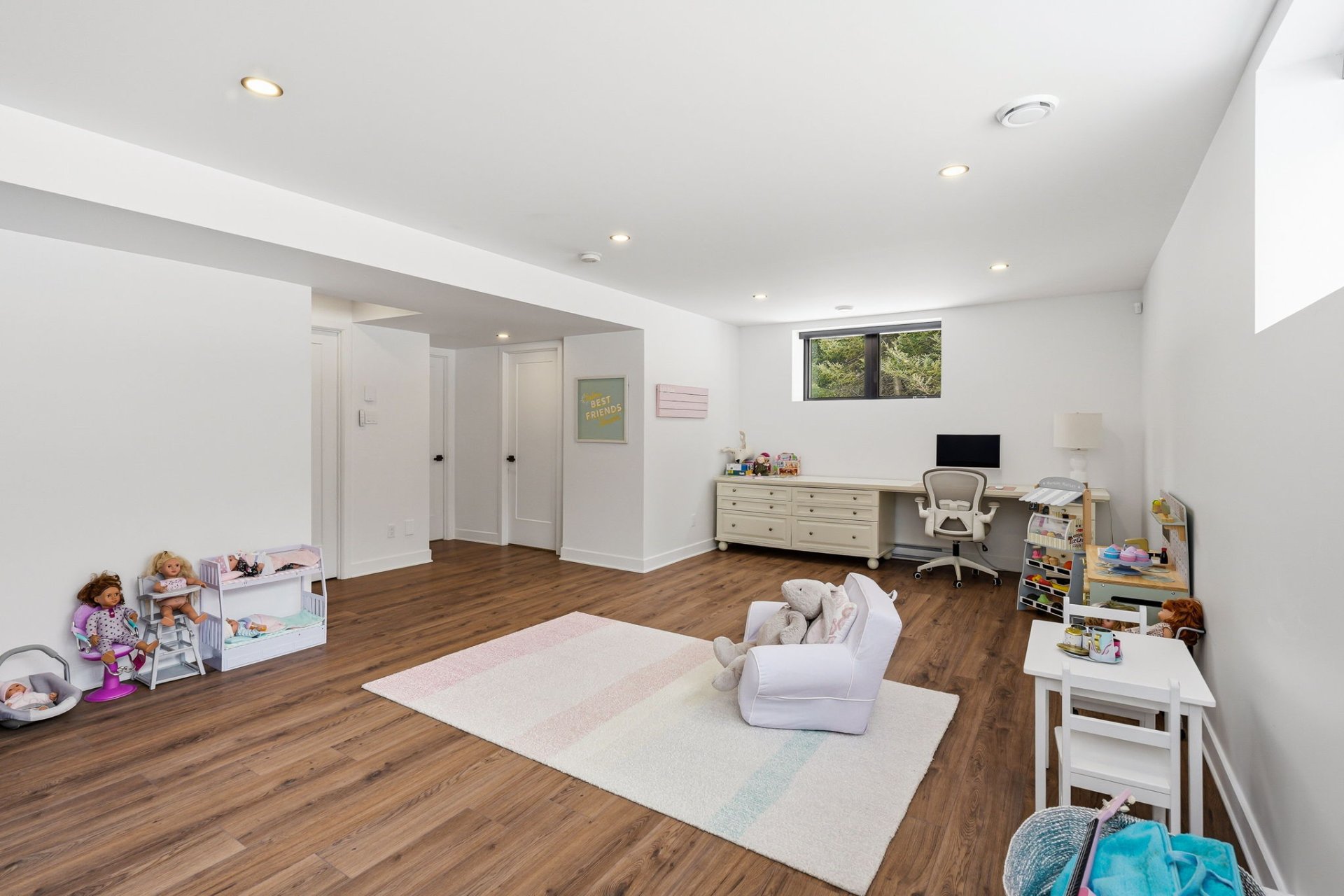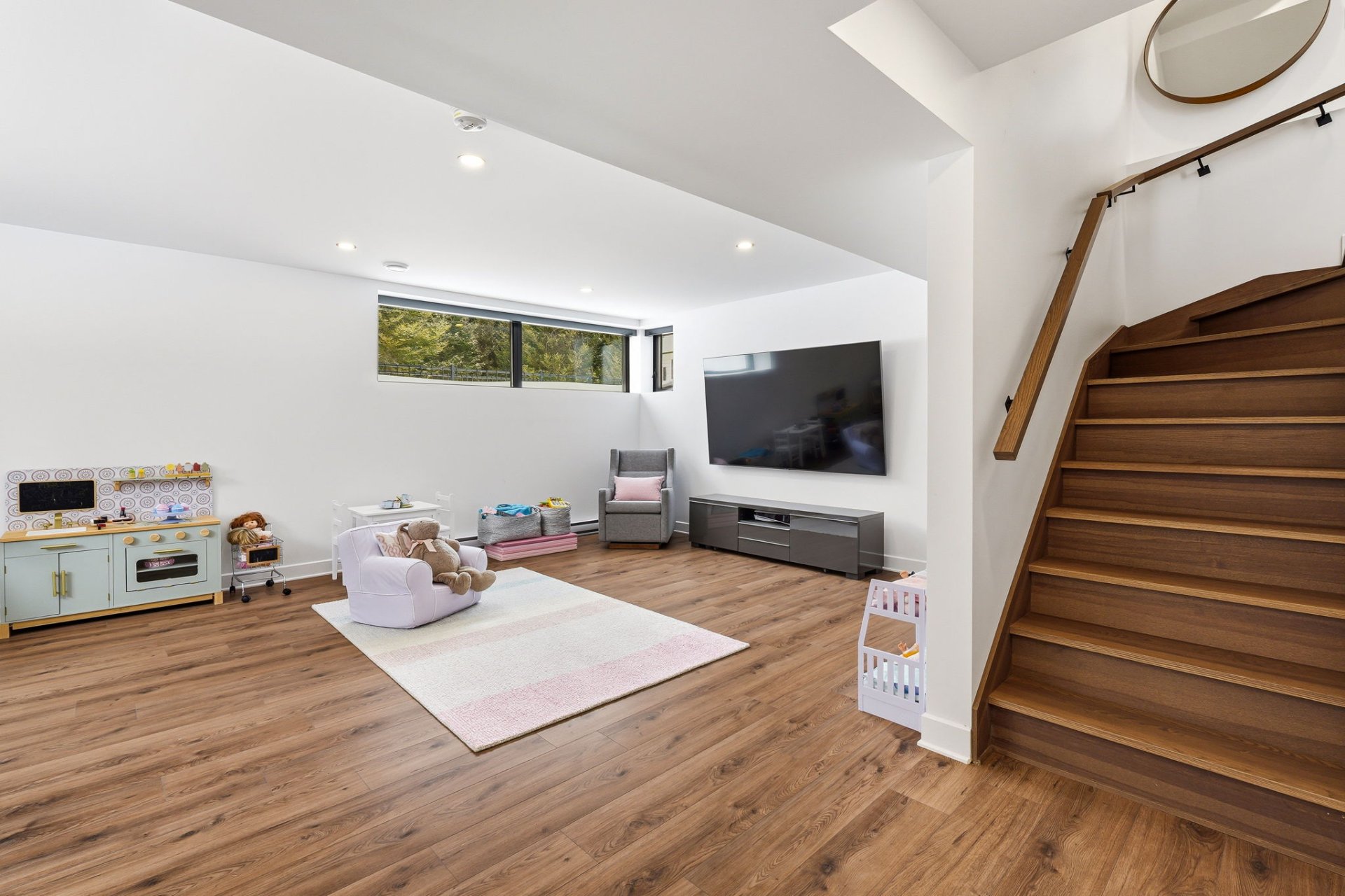 Le niveau inférieur propose une vaste salle familiale polyvalente, parfaite pour s'adapter aux besoins d'une vie active : espace détente, salle de jeux ou cinéma maison. Une quatrième chambre et une troisième salle de bain complète s'y ajoutent.
