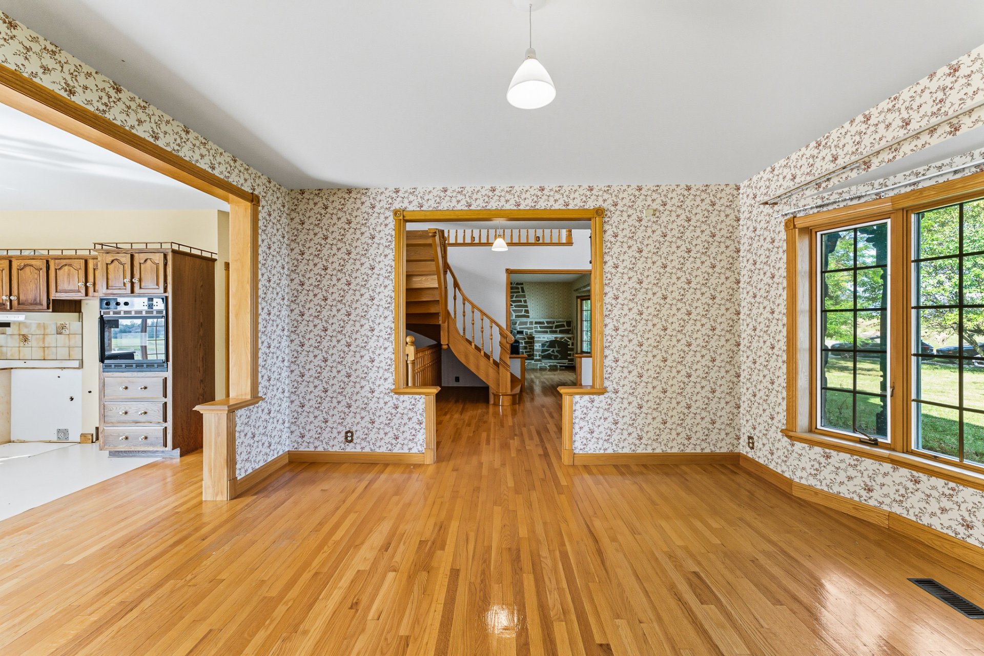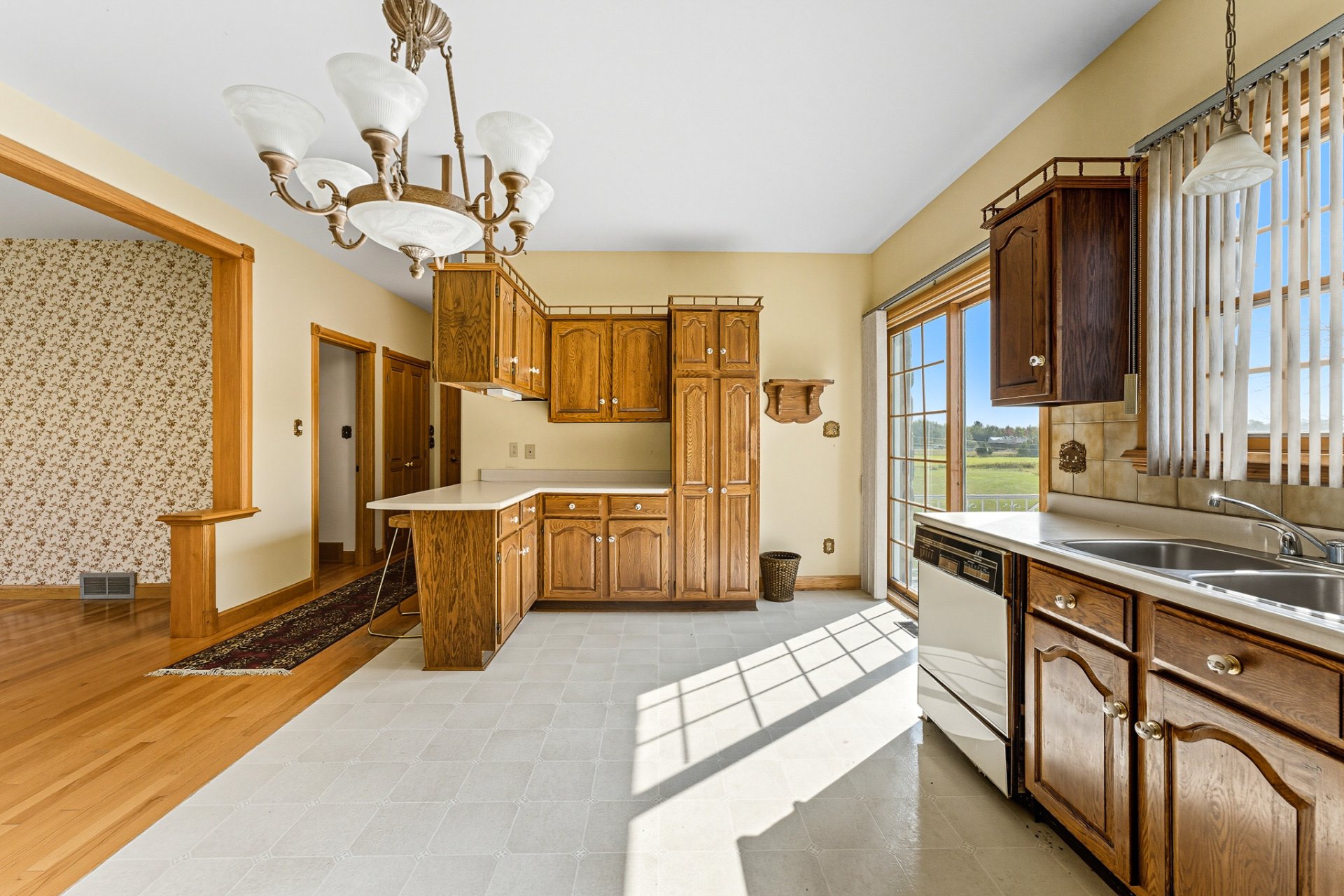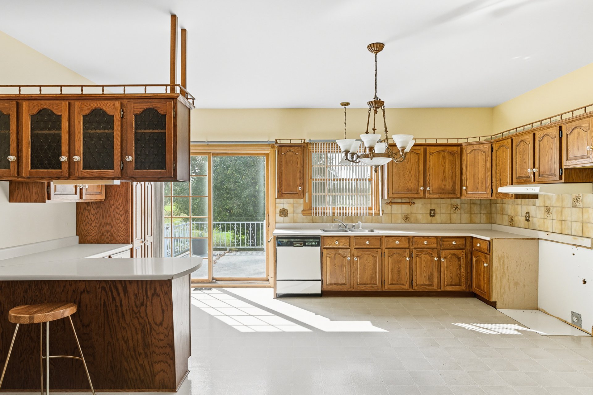 Au salon, le foyer en pierre constitue le coeur de la pièce, invitant aux rassemblements. La fenestration abondante, notamment les grandes baies vitrées, encadre des vues apaisantes sur la campagne environnante, transformant chaque saison en spectacle. La salle à manger et la cuisine, ouvertes et baignées de soleil, offrent un espace convivial qui n'attend qu'une mise à jour selon vos goûts pour retrouver toute sa modernité.