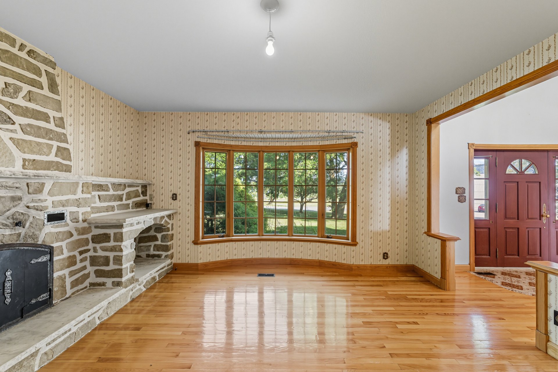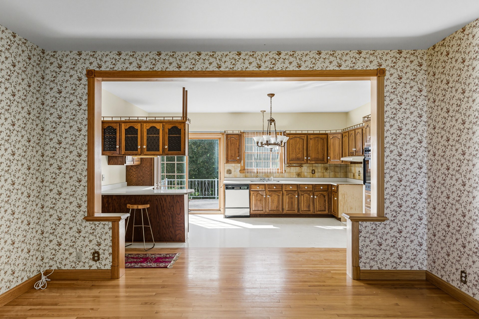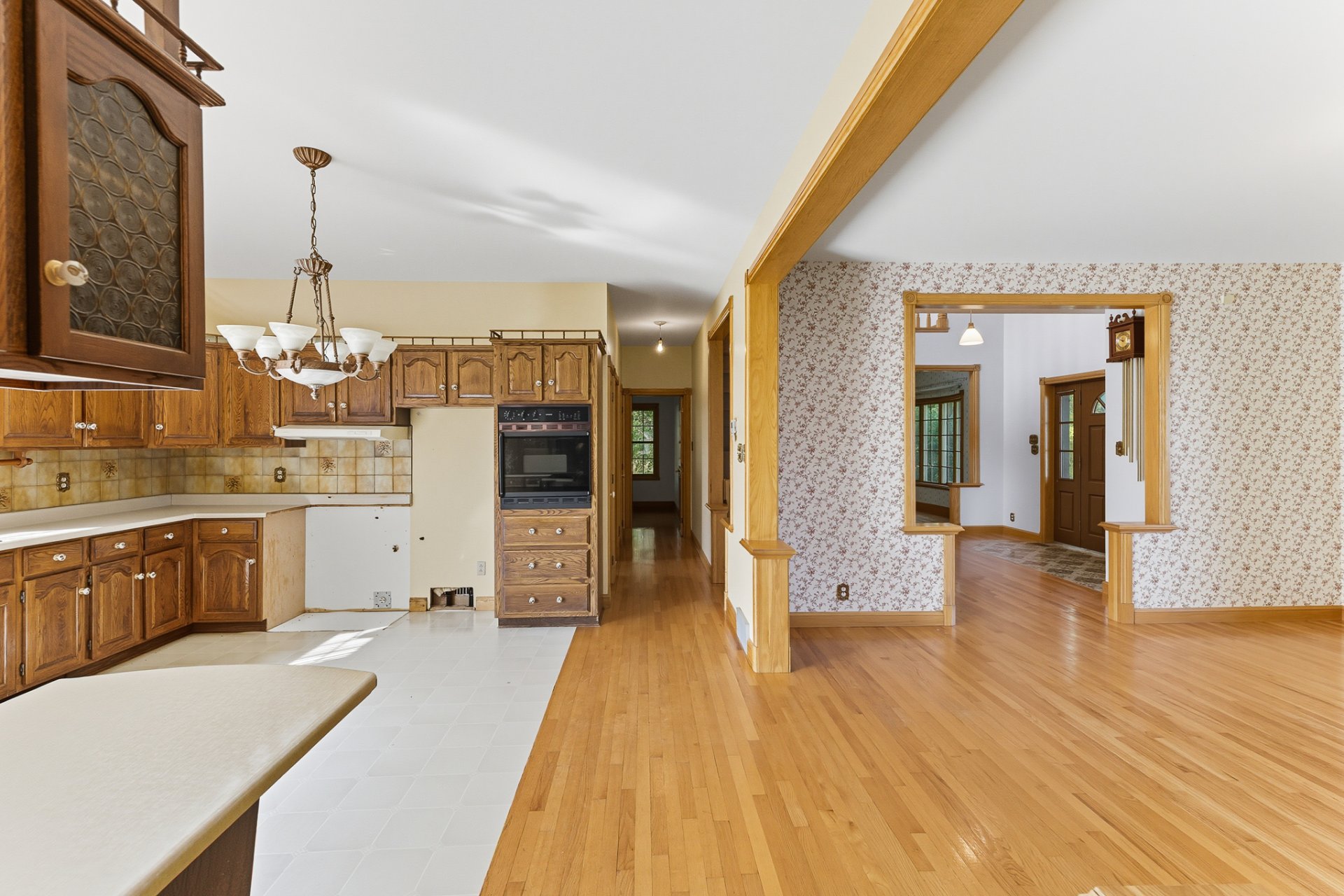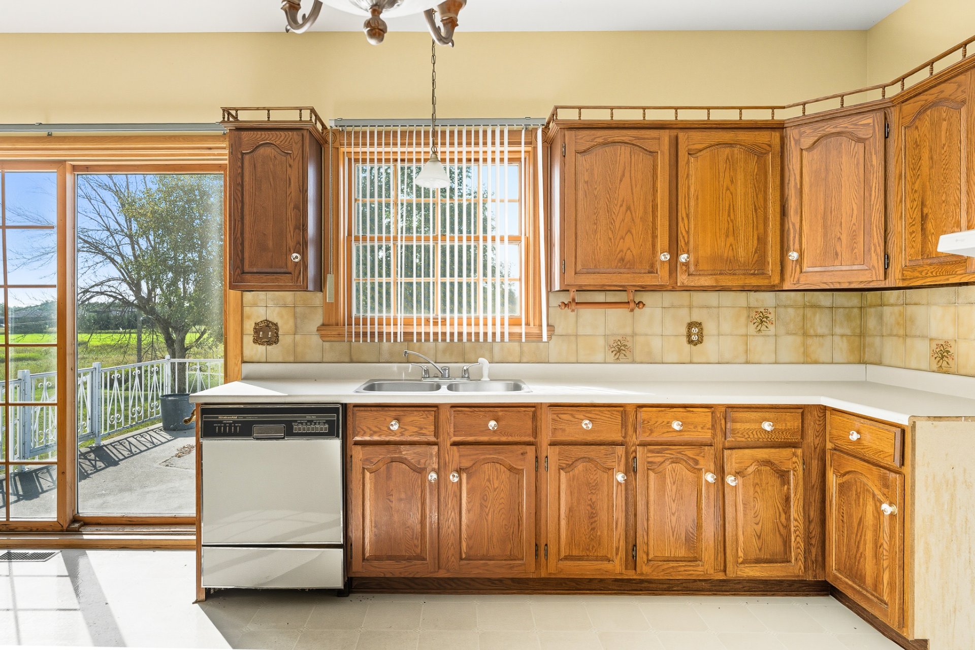 Au salon, le foyer en pierre constitue le coeur de la pièce, invitant aux rassemblements. La fenestration abondante, notamment les grandes baies vitrées, encadre des vues apaisantes sur la campagne environnante, transformant chaque saison en spectacle. La salle à manger et la cuisine, ouvertes et baignées de soleil, offrent un espace convivial qui n'attend qu'une mise à jour selon vos goûts pour retrouver toute sa modernité.