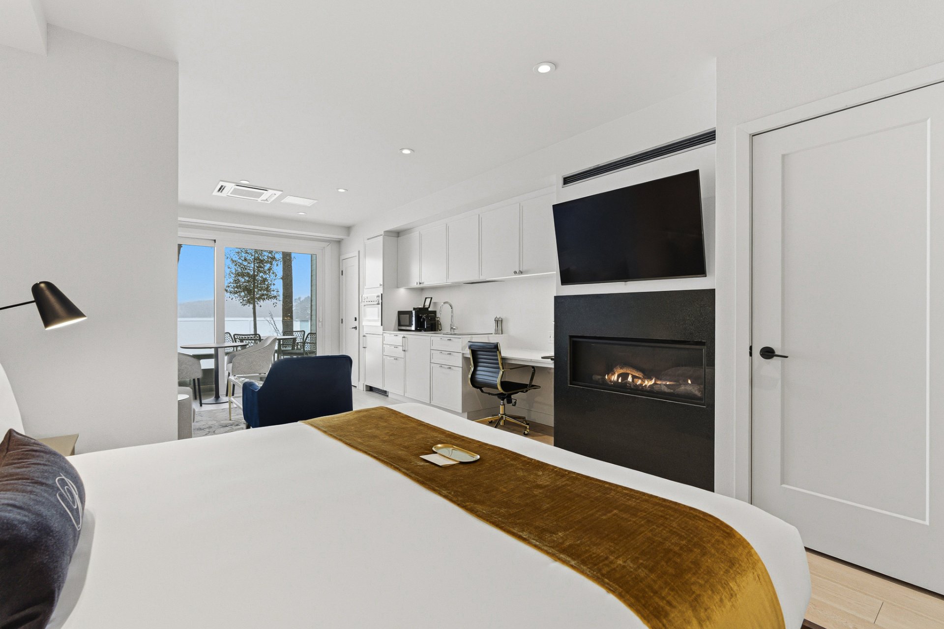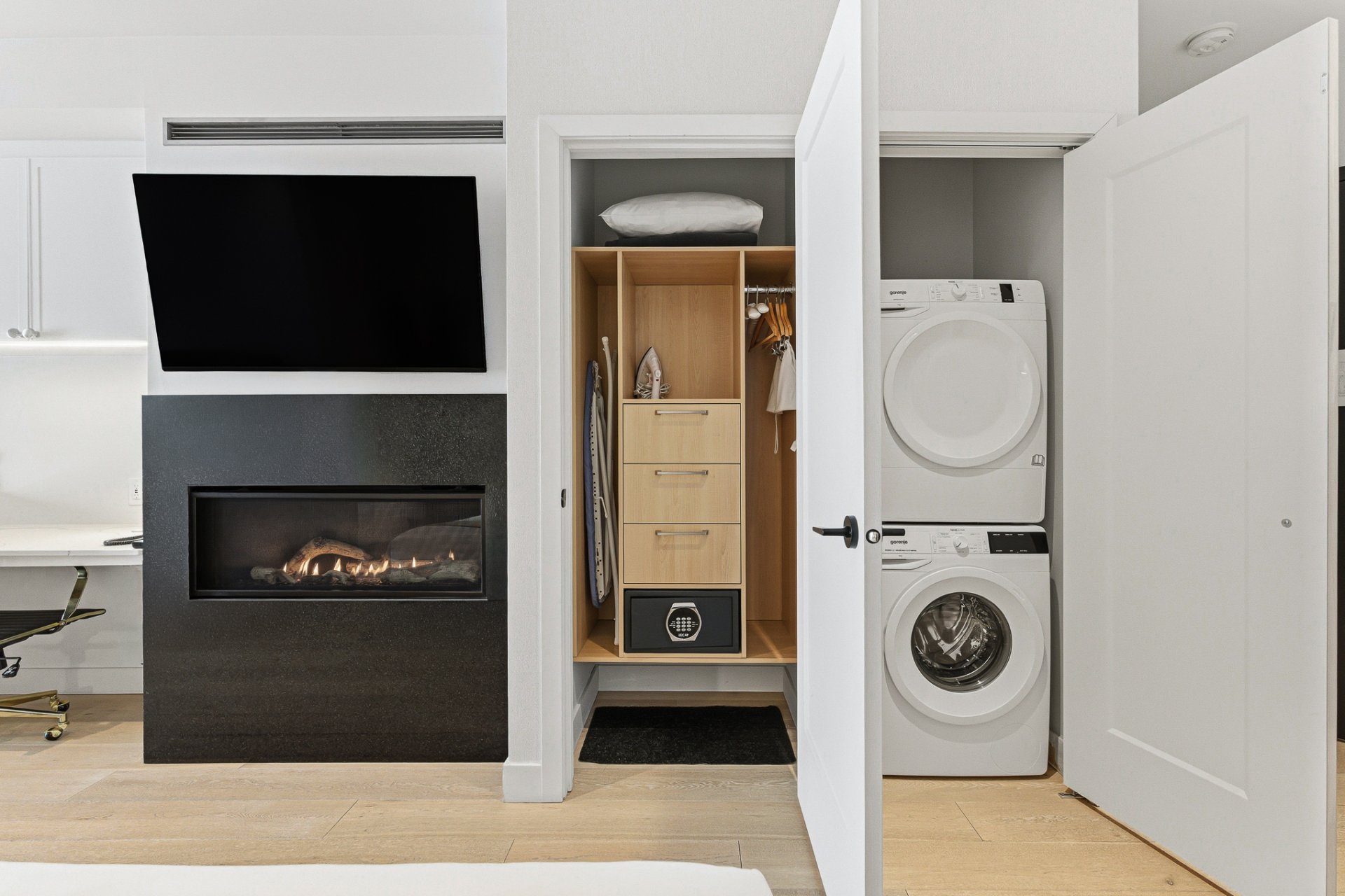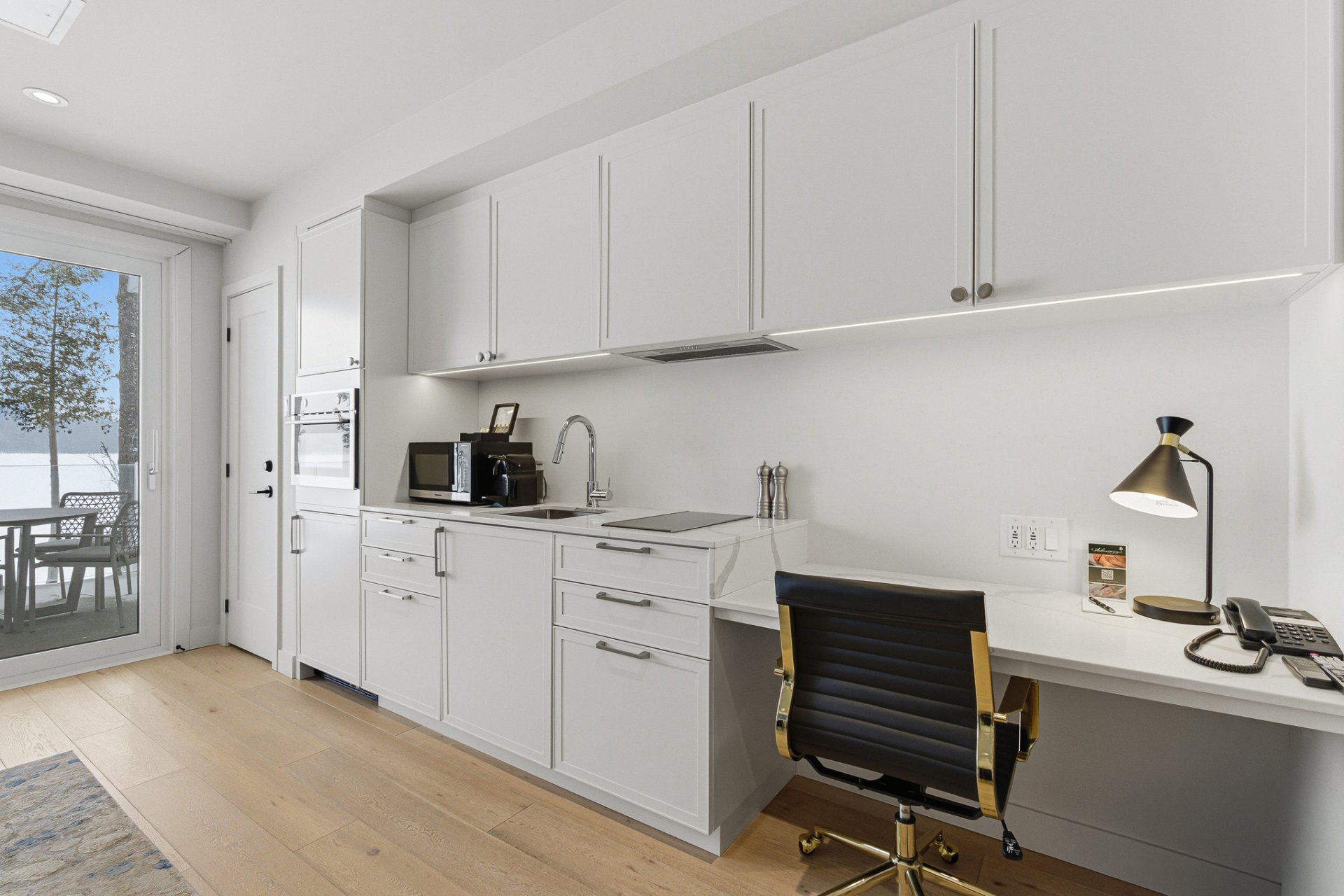 L'unité se distingue par son design contemporain à aire ouverte, ses matériaux de qualité et sa grande fenestration laissant entrer une abondante lumière naturelle. L'espace de vie comprend un foyer moderne créant une ambiance chaleureuse en toute saison, une cuisine, un coin bureau parfaitement adapté au télétravail, ainsi qu'une salle de bains haut de gamme au style épuré.