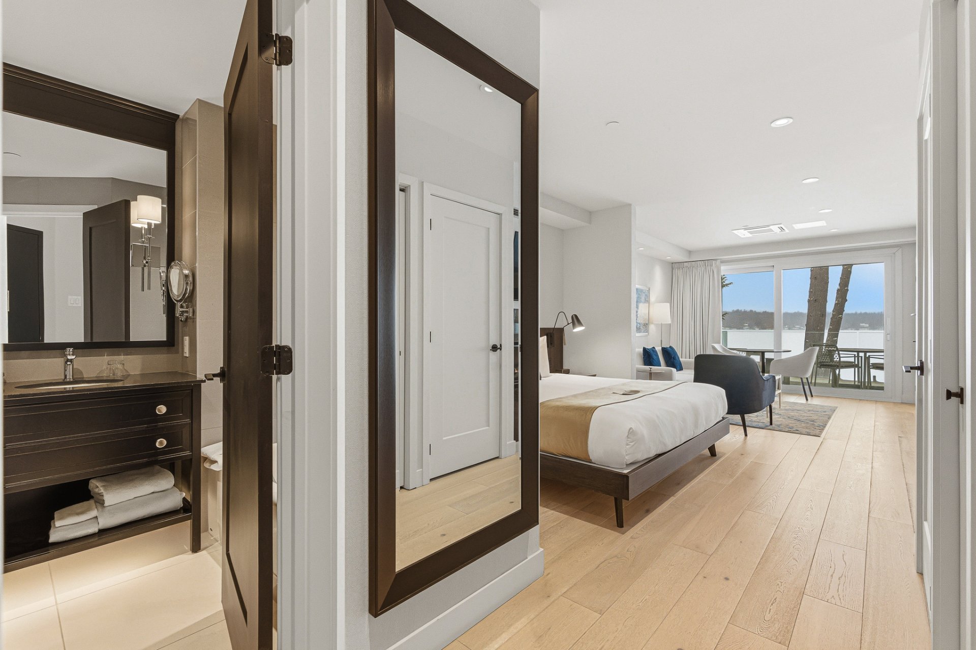 La chambre offre un confort hôtelier avec lit king et rangements bien intégrés. À l'extérieur, la superbe terrasse aménagée couverte constitue un véritable prolongement de l'espace de vie, offrant une vue imprenable et apaisante sur le lac, idéale pour profiter du paysage en toute saison.