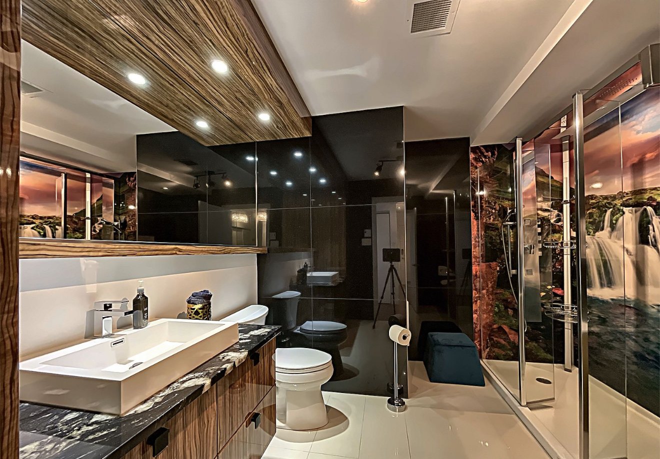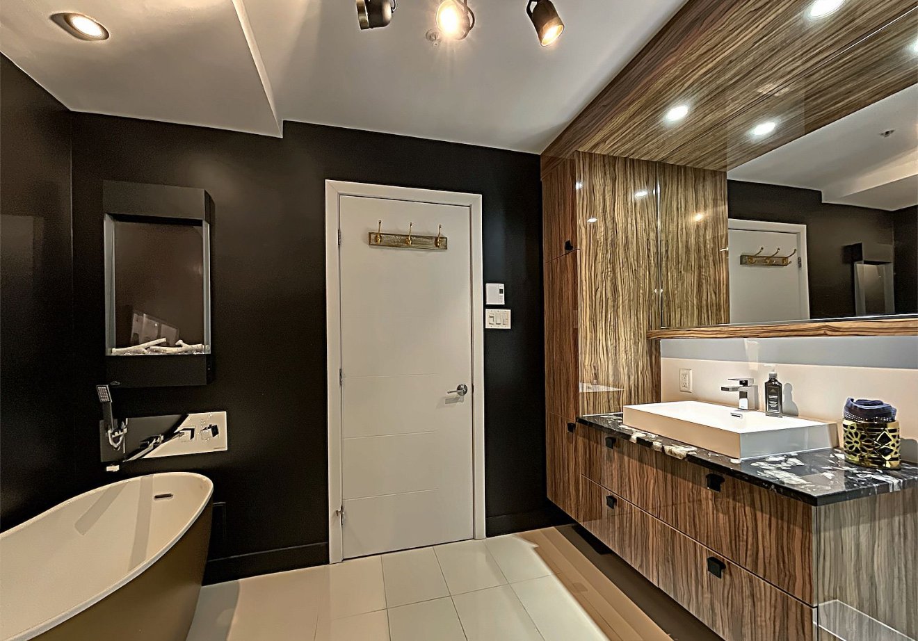 -Des planchers d'ingénierie et en céramique dont un mur dans la salle de bain.