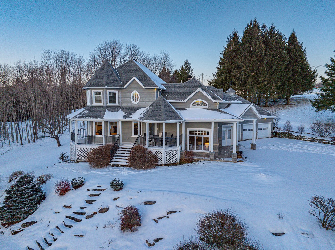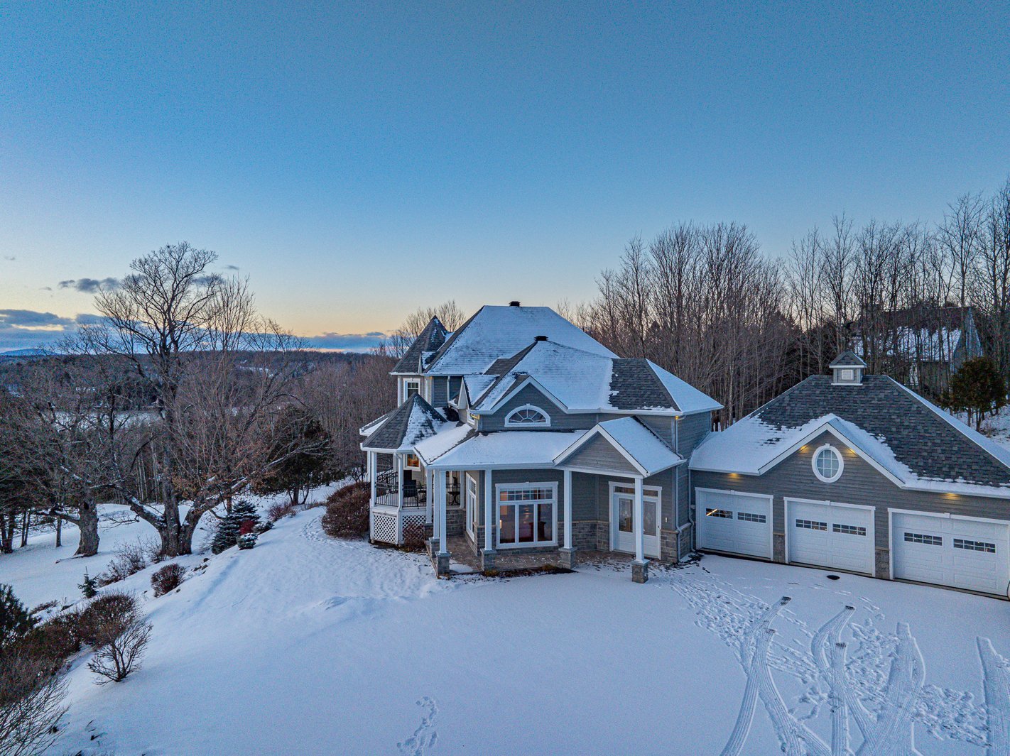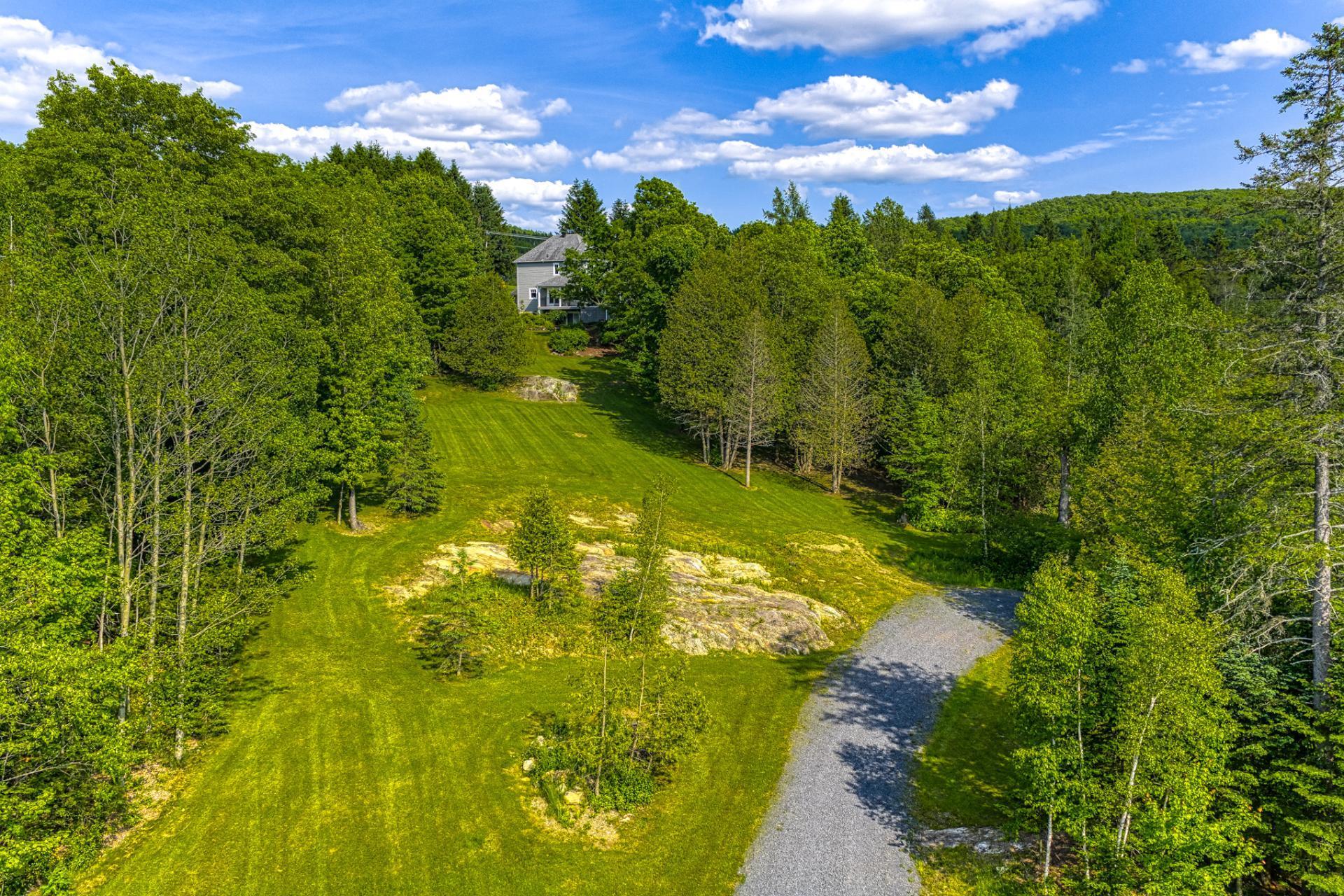La résidence principale, située au 9 chemin Drew, a été entièrement rénovée et agrandie avec soin. Elle propose 4 chambres et 2 salles de bains modernes. Les espaces de vie se distinguent par un salon spectaculaire avec plafond cathédrale de 17 pieds, planchers radiants et abondante fenestration. La cuisine haut de gamme, dotée de comptoirs en granite, d'un vaste îlot central, d'électroménagers de qualité et d'un cellier vitré, répond aux attentes d'une clientèle exigeante.