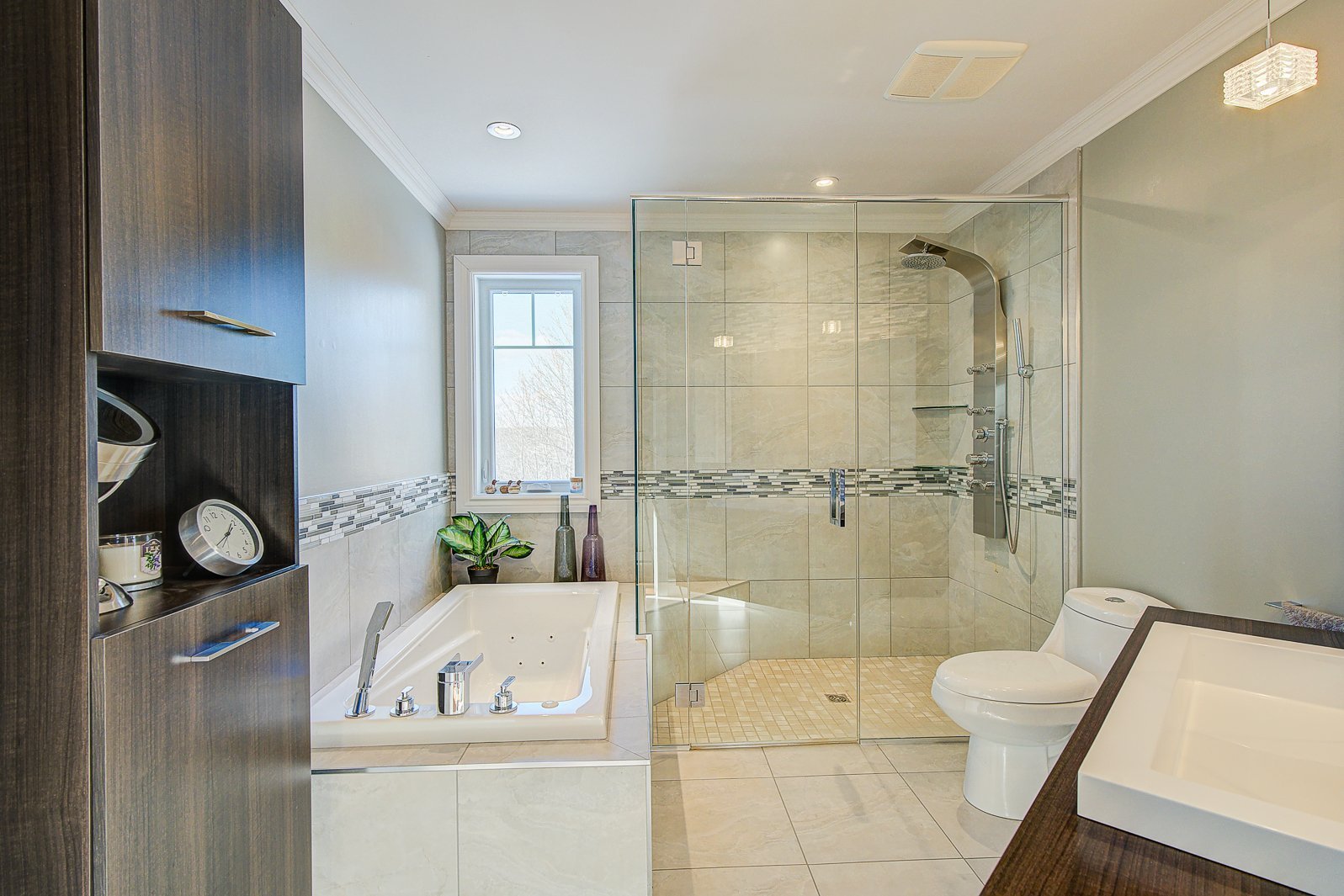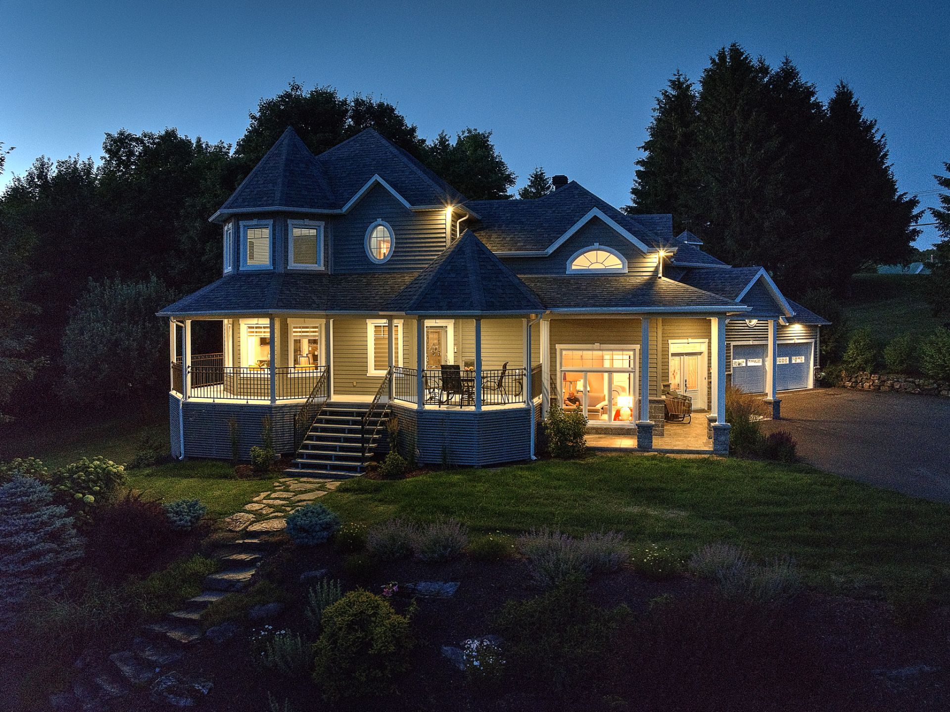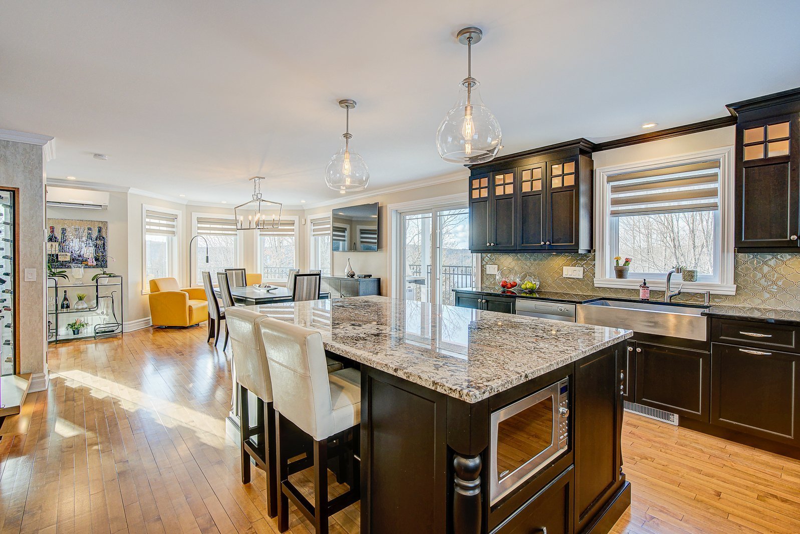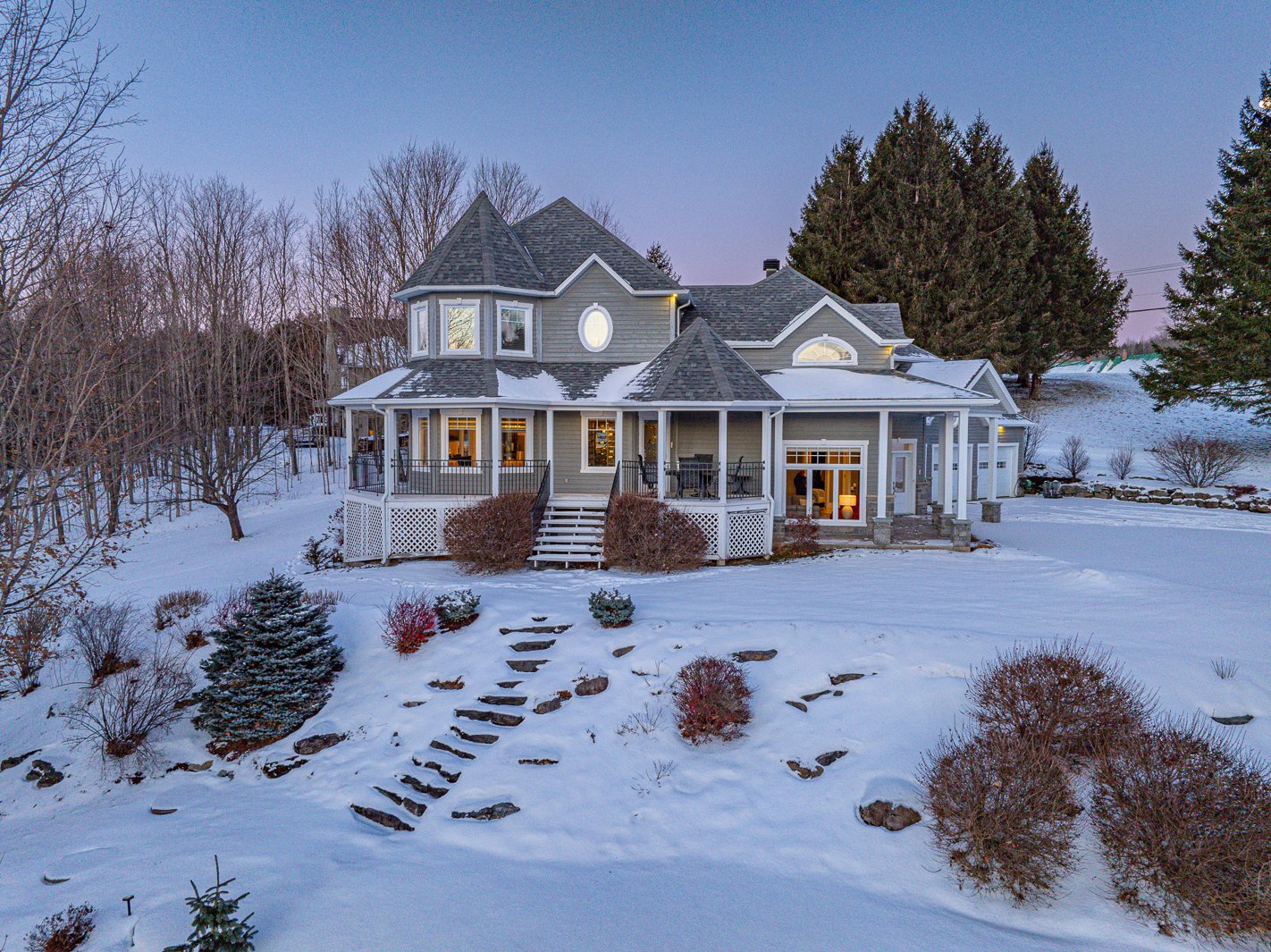 La résidence principale, située au 9 chemin Drew, a été entièrement rénovée et agrandie avec soin. Elle propose 4 chambres et 2 salles de bains modernes. Les espaces de vie se distinguent par un salon spectaculaire avec plafond cathédrale de 17 pieds, planchers radiants et abondante fenestration. La cuisine haut de gamme, dotée de comptoirs en granite, d'un vaste îlot central, d'électroménagers de qualité et d'un cellier vitré, répond aux attentes d'une clientèle exigeante.