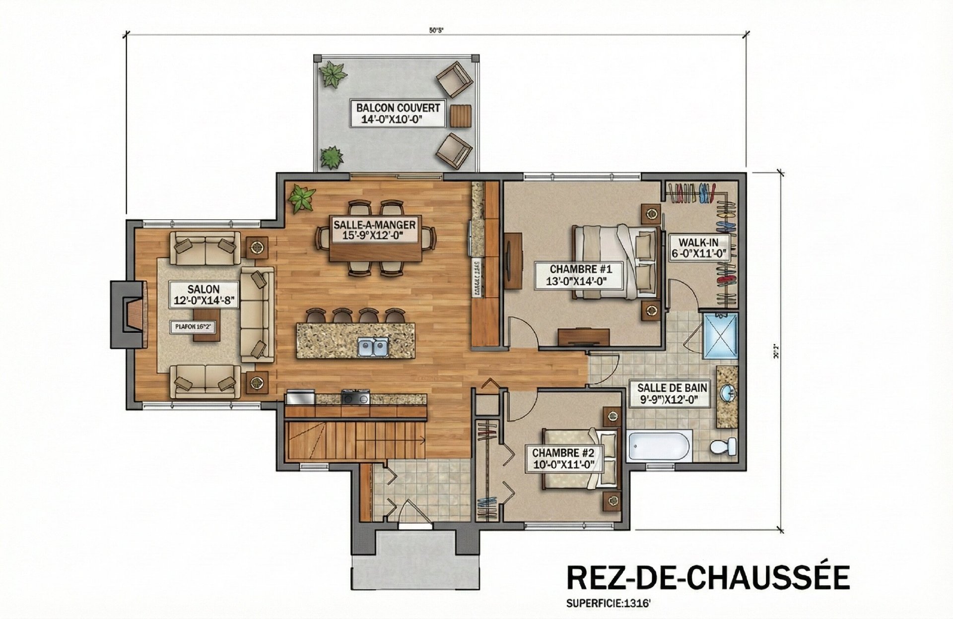 Dès l'entrée, un hall accueillant mène vers une aire de vie ouverte où le salon, doté d'un plafond de 16 pieds, crée une atmosphère grandiose et chaleureuse. La cuisine, conviviale et élégante, propose un vaste îlot central, des comptoirs en quartz et un accès direct à la salle à manger, elle-même prolongée par un balcon couvert offrant une vue apaisante sur la nature.
