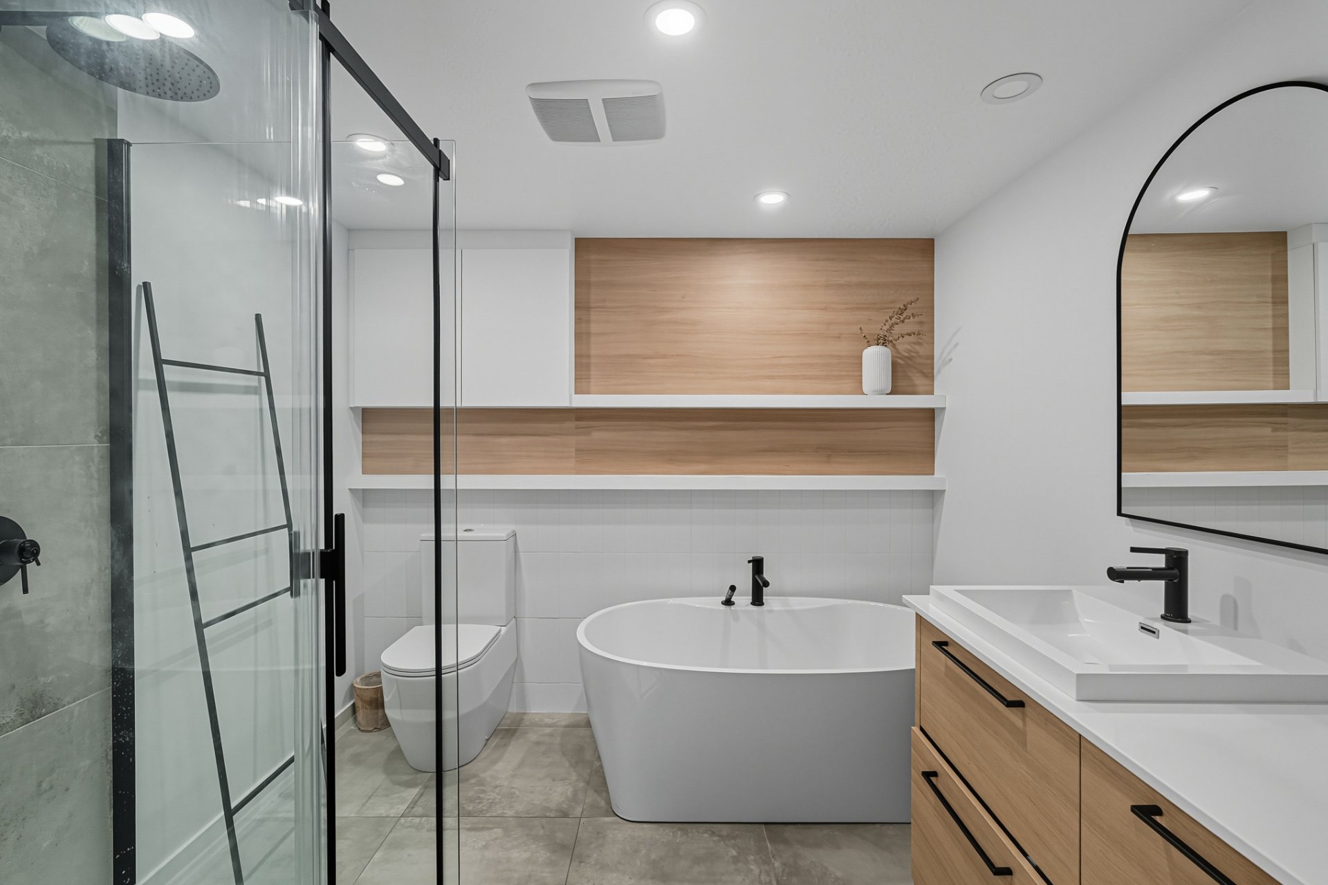 - Salle de bain principale entièrement rénovée au goût du jour, également dotée d'un plancher chauffant