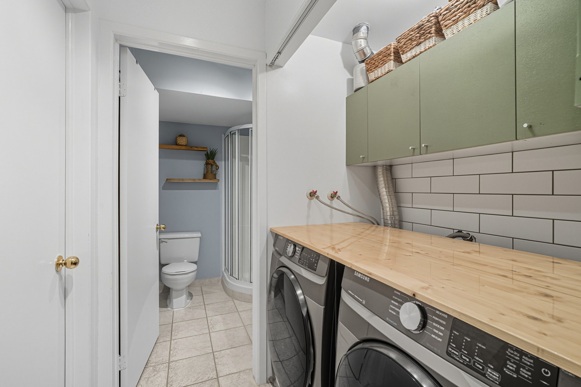 - Laveuse et sécheuse, luminaire de la salle à manger, tablettes de la salle de bain du sous-sol