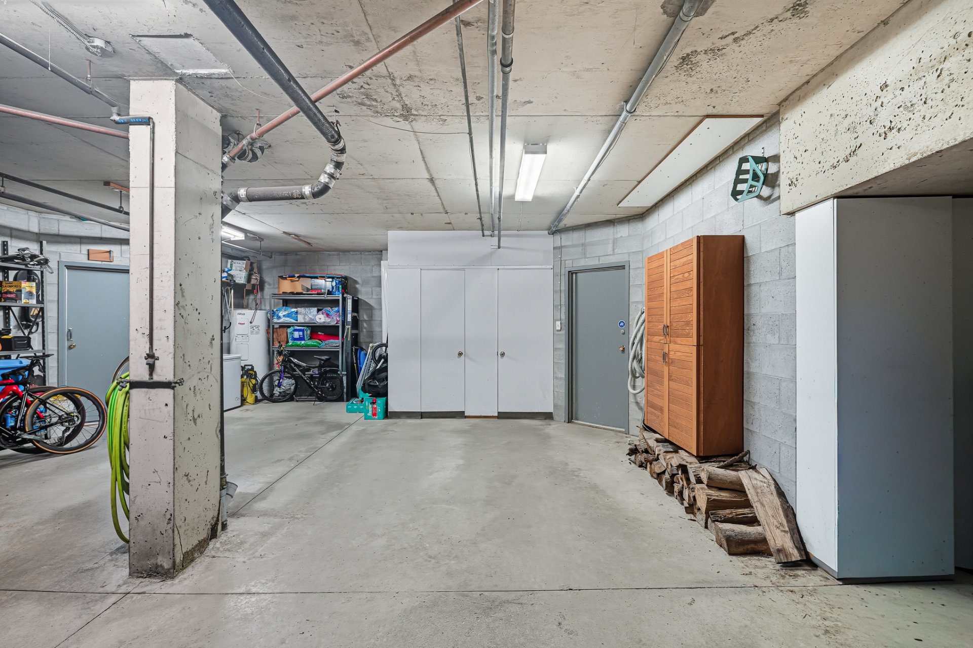 Au sous-sol, une pièce polyvalente pouvant servir d'une chambre d'invité, salle de jeux ou salle d'entraînement, avec salle de bain complète attenante. On y retrouve aussi l'espace laveuse/sécheuse, l'accès direct au stationnement intérieur et plusieurs espaces de 2 rangements additionnels.