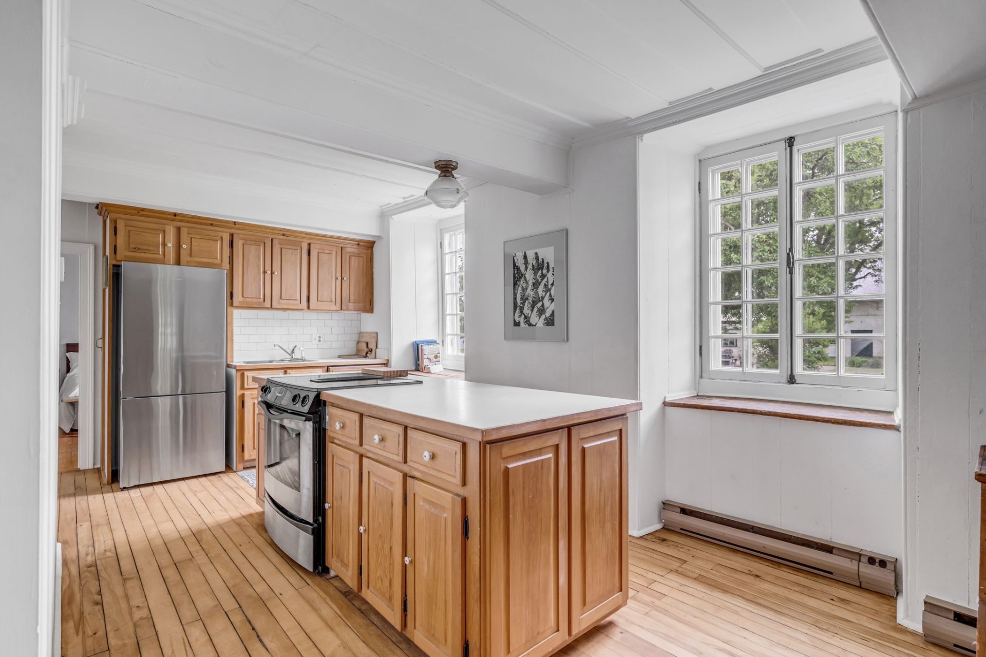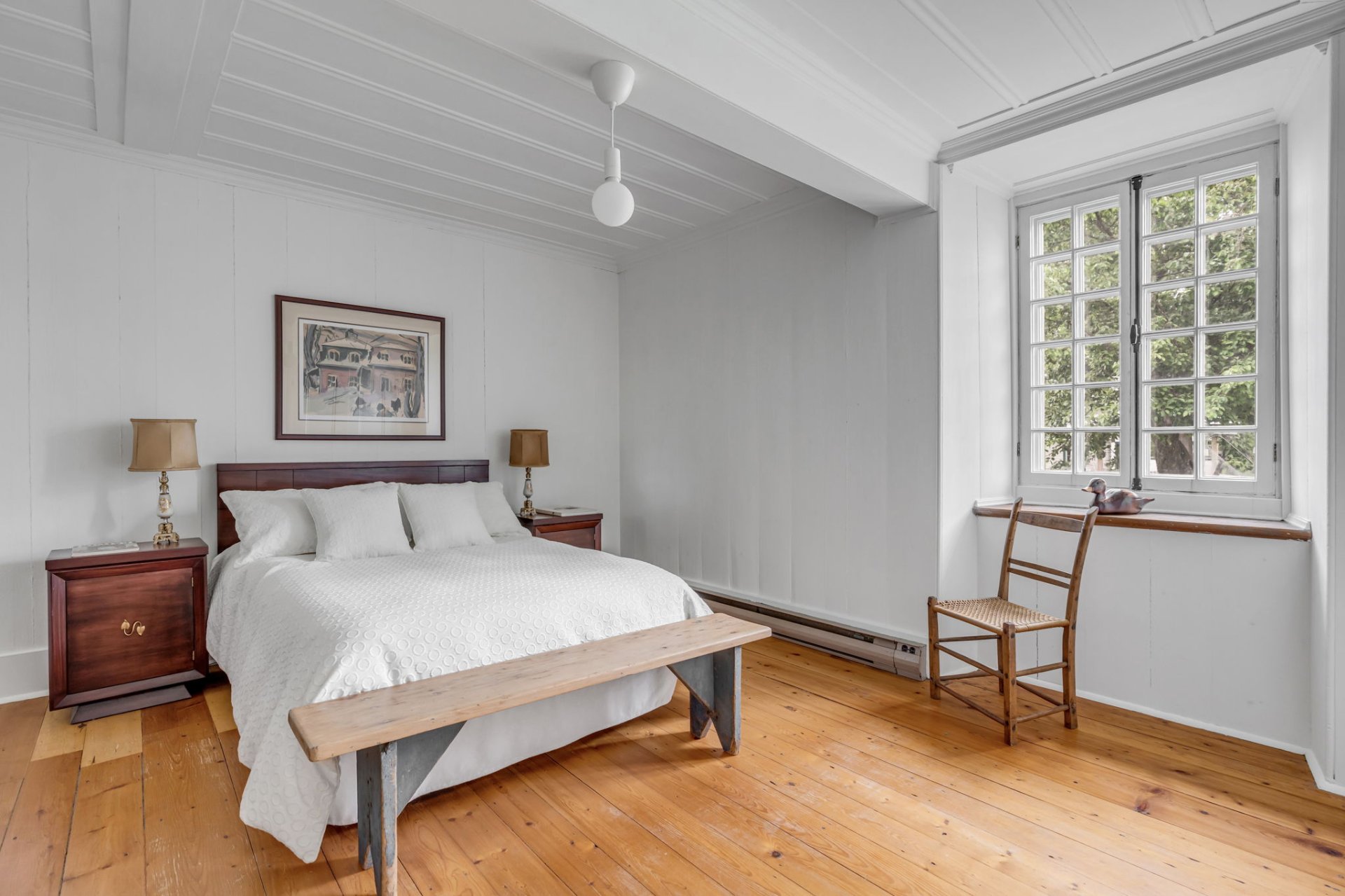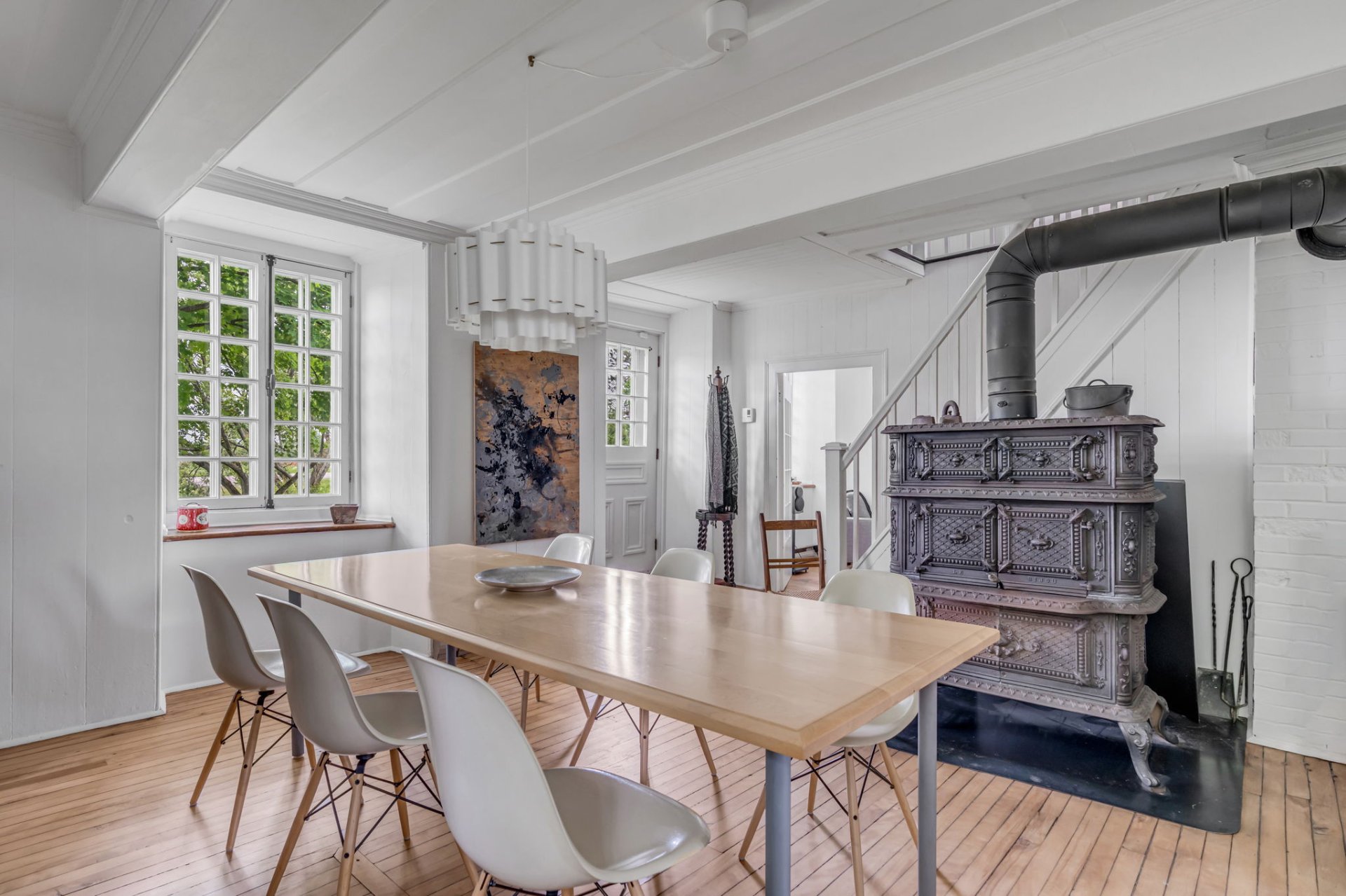 À l'intérieur, l'authenticité règne. Les murs de périmètre en madriers de pin révèlent le savoir-faire d'autrefois et dégagent une atmosphère enveloppante. Plusieurs éléments d'origine subsistent et affirment le caractère singulier de la demeure : les cloisons en planches à caissons, les plafonds à caissons ou à couvre-joints, les portes d'assemblage à panneaux, les poutres moulurées, sans oublier les planchers d'époque, patinés, vernis avec soin. Ces détails d'antan, préservés avec une rare fidélité, créent une ambiance feutrée et raffinée, propice à la contemplation, à la création ou à la villégiature.