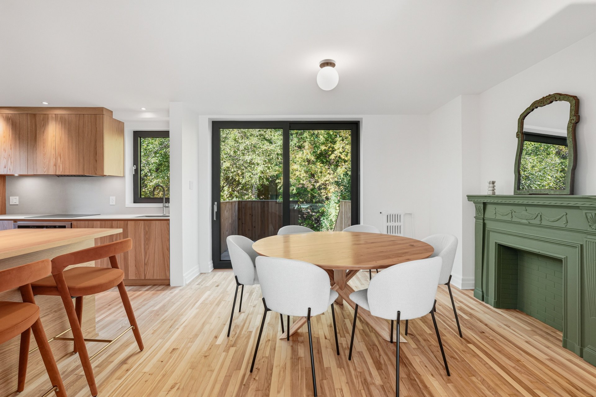 + Salle à manger avec foyer décoratif ouverte sur la cuisine