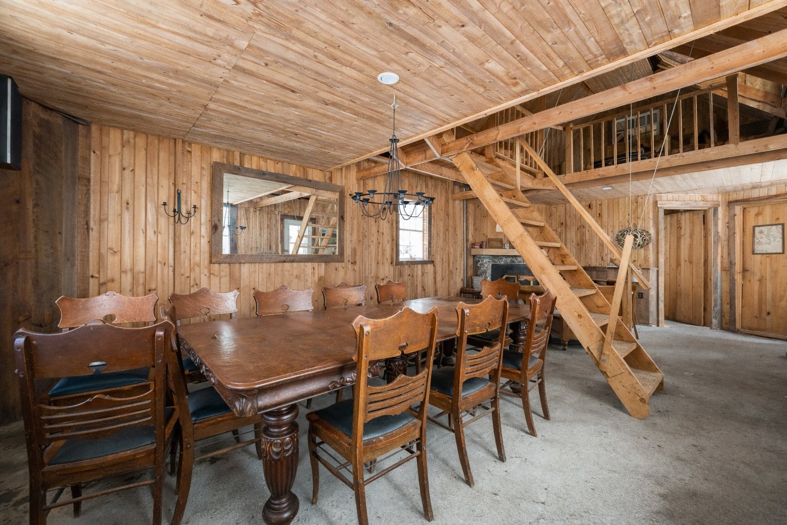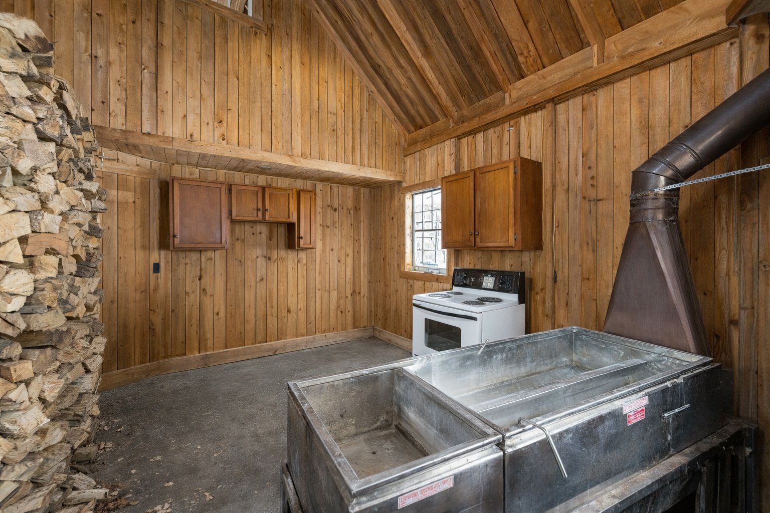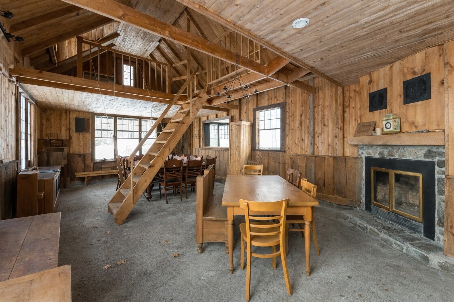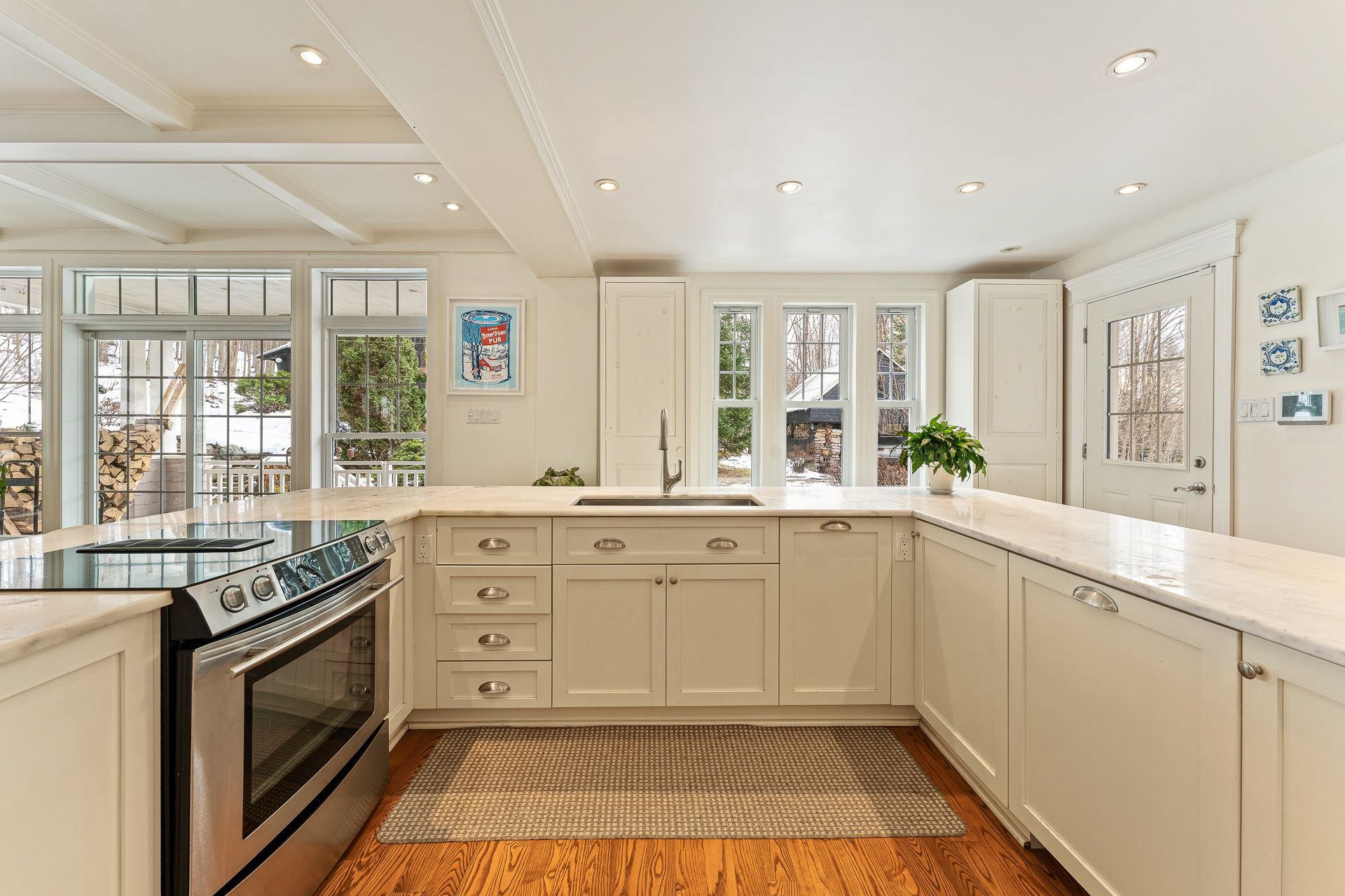 La cuisine moderne, digne des grands chefs, est un véritable coup de coeur avec son grand îlot central en L pouvant accueillir quatre places au comptoir, ses nombreuses armoires blanches et son ouverture sur la salle à manger. Cet espace convivial se prolonge vers la salle familiale, où trône un foyer au bois dans un magnifique manteau de pierres. Les plafonds avec poutres apparentes, les grandes fenêtres et les portes-patio accentuent l'impression de grandeur et offrent une vue apaisante sur la nature environnante.