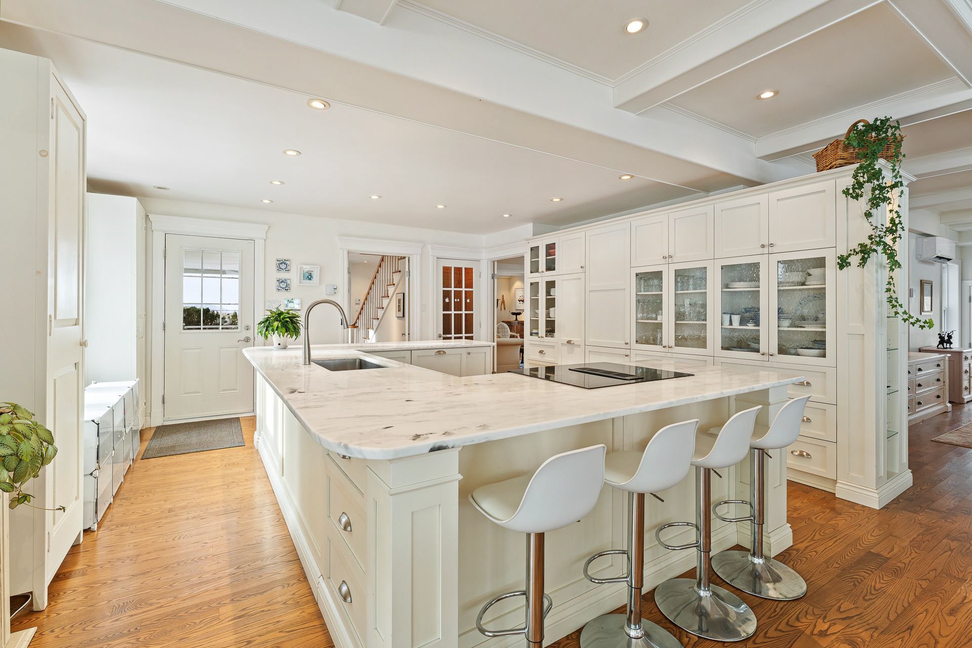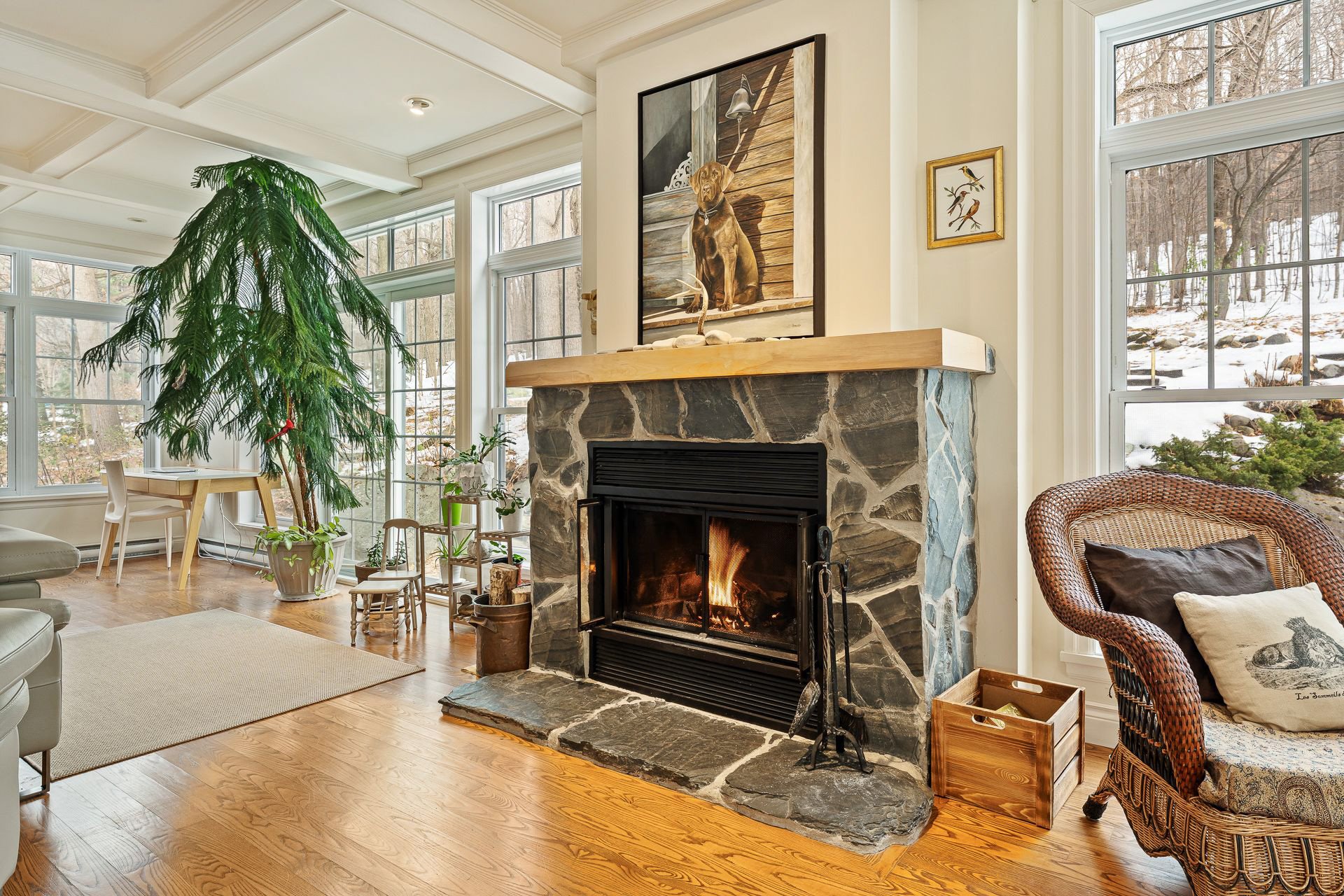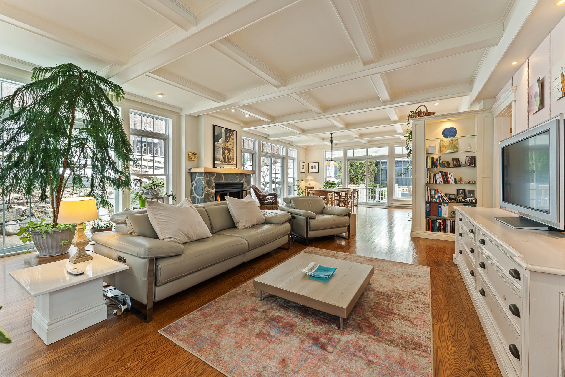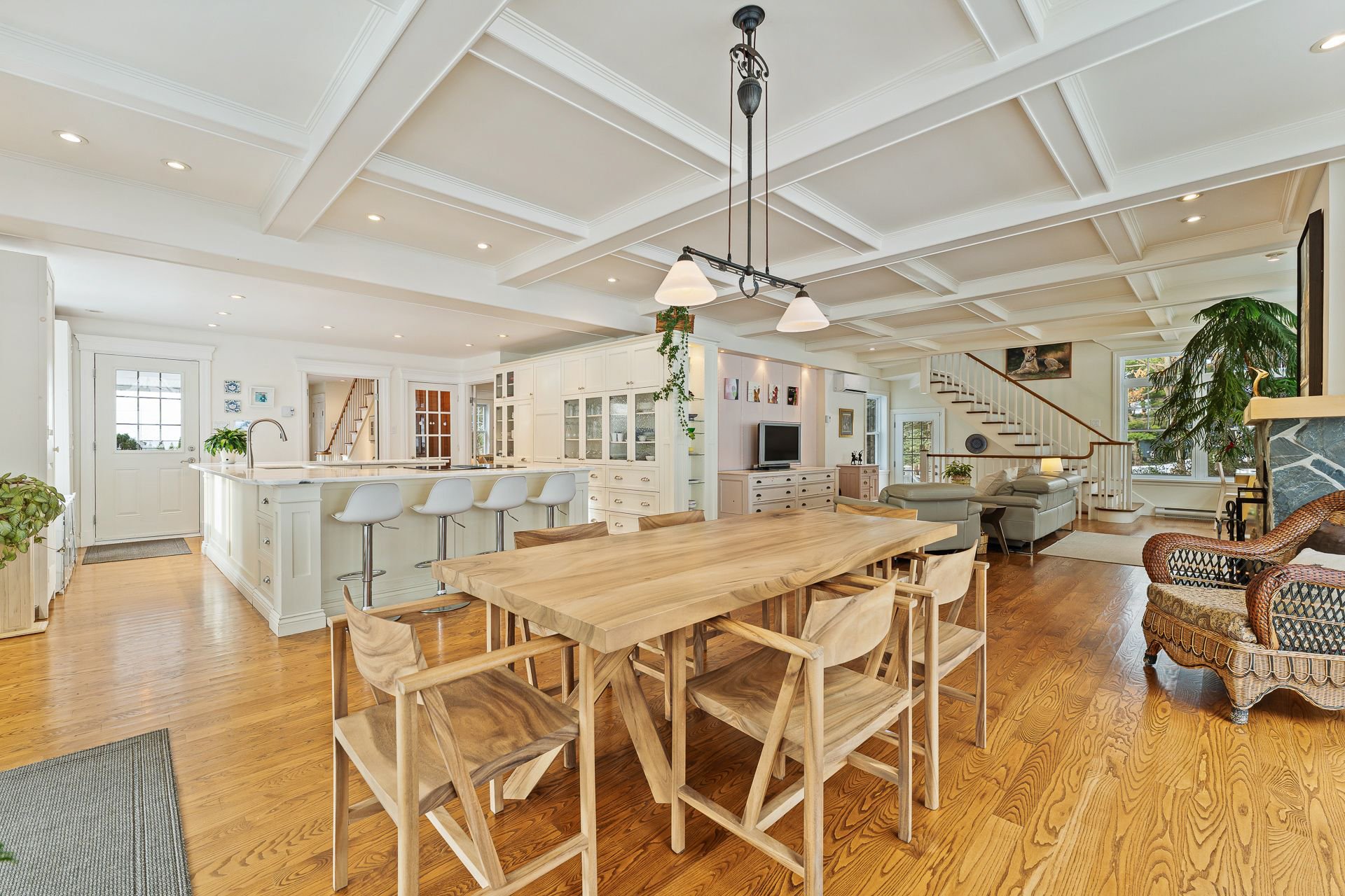 La cuisine moderne, digne des grands chefs, est un véritable coup de coeur avec son grand îlot central en L pouvant accueillir quatre places au comptoir, ses nombreuses armoires blanches et son ouverture sur la salle à manger. Cet espace convivial se prolonge vers la salle familiale, où trône un foyer au bois dans un magnifique manteau de pierres. Les plafonds avec poutres apparentes, les grandes fenêtres et les portes-patio accentuent l'impression de grandeur et offrent une vue apaisante sur la nature environnante.