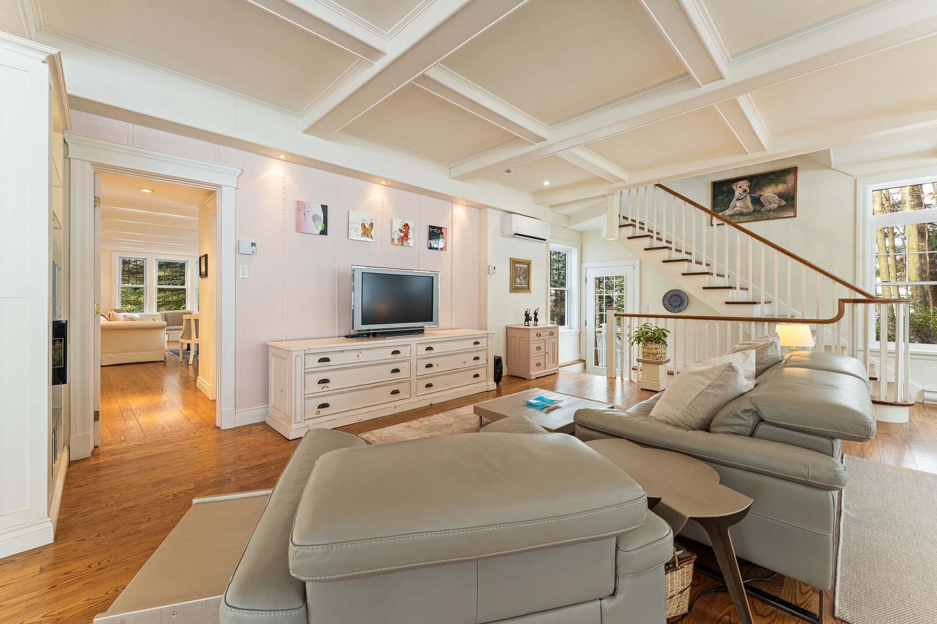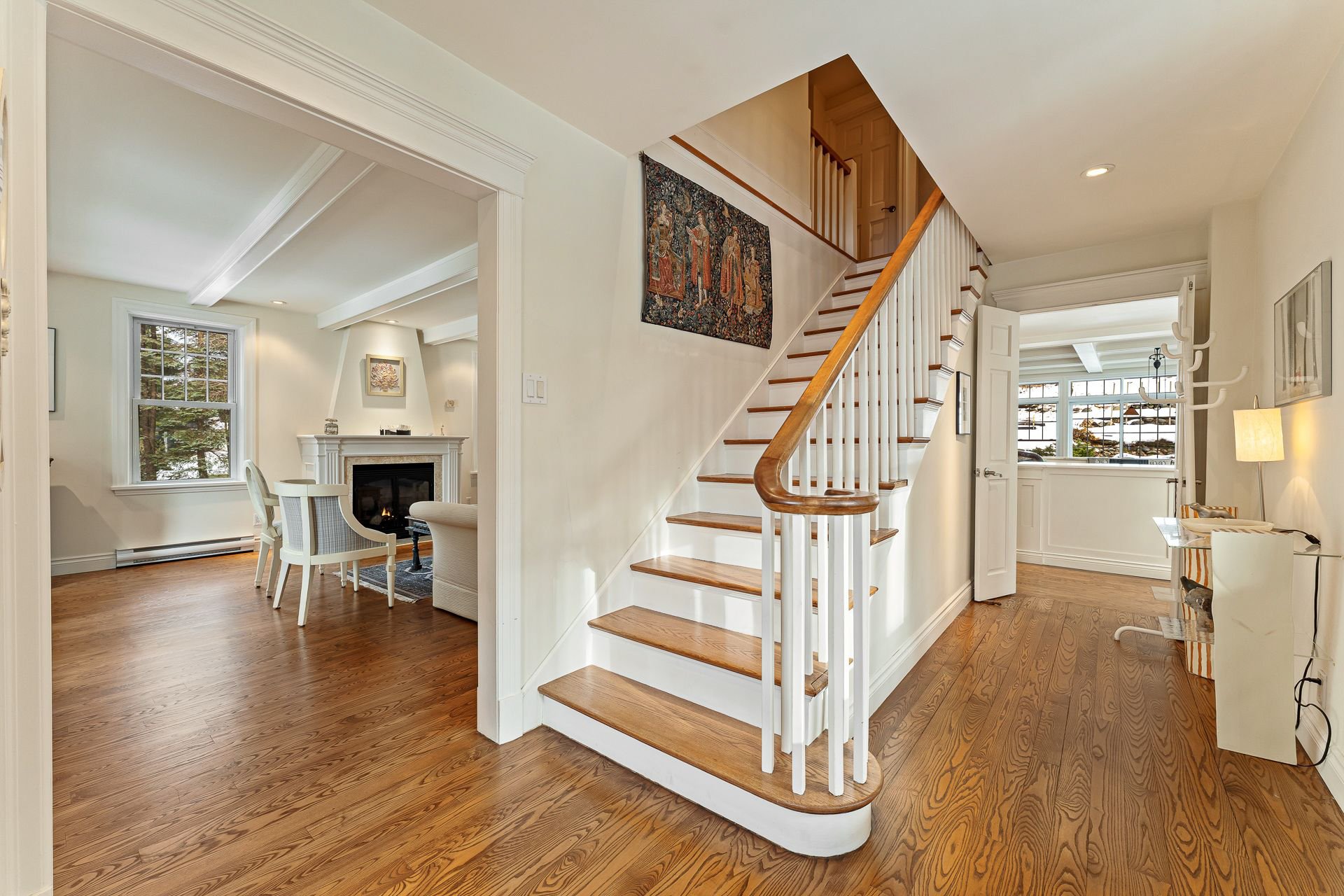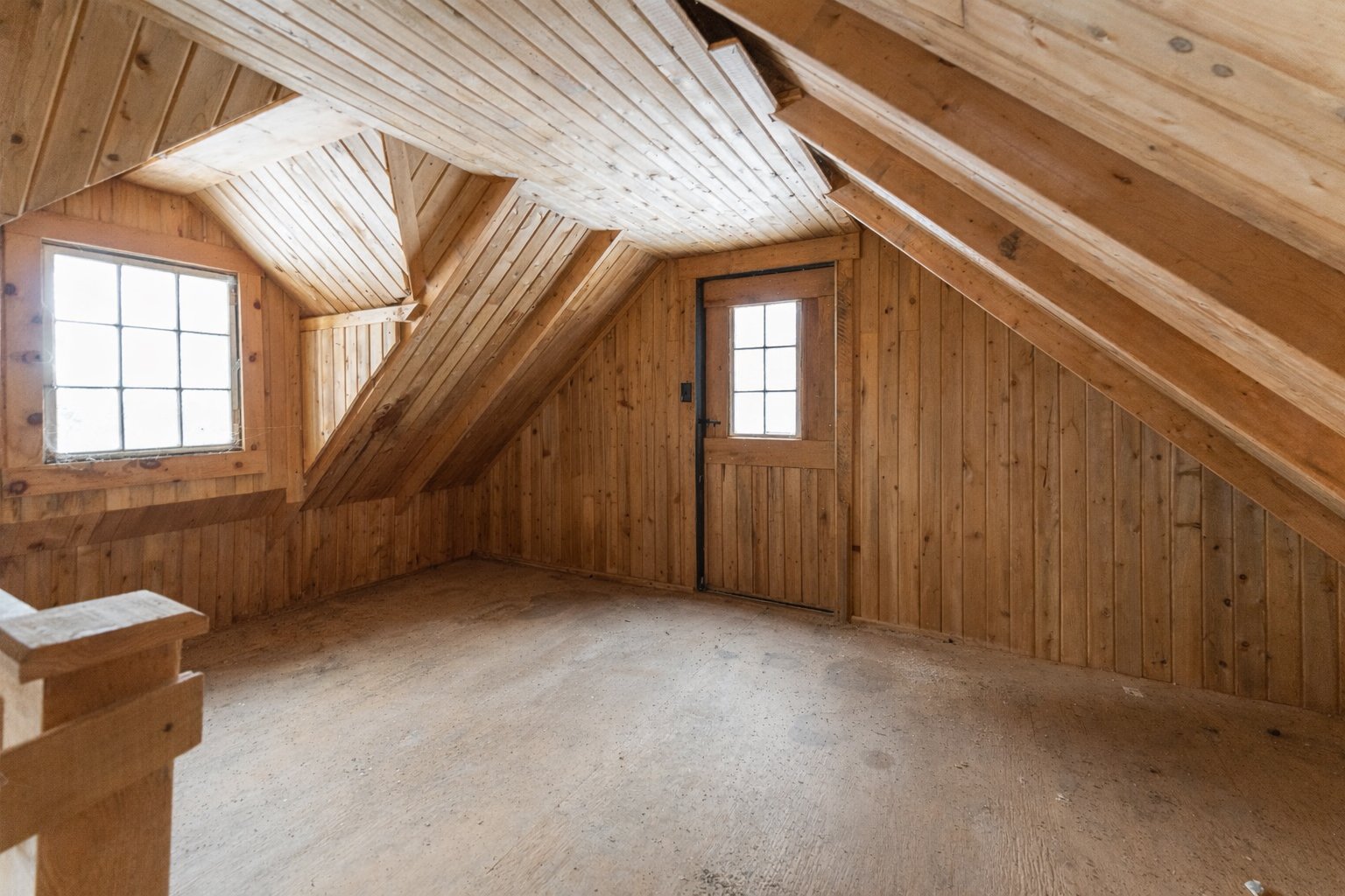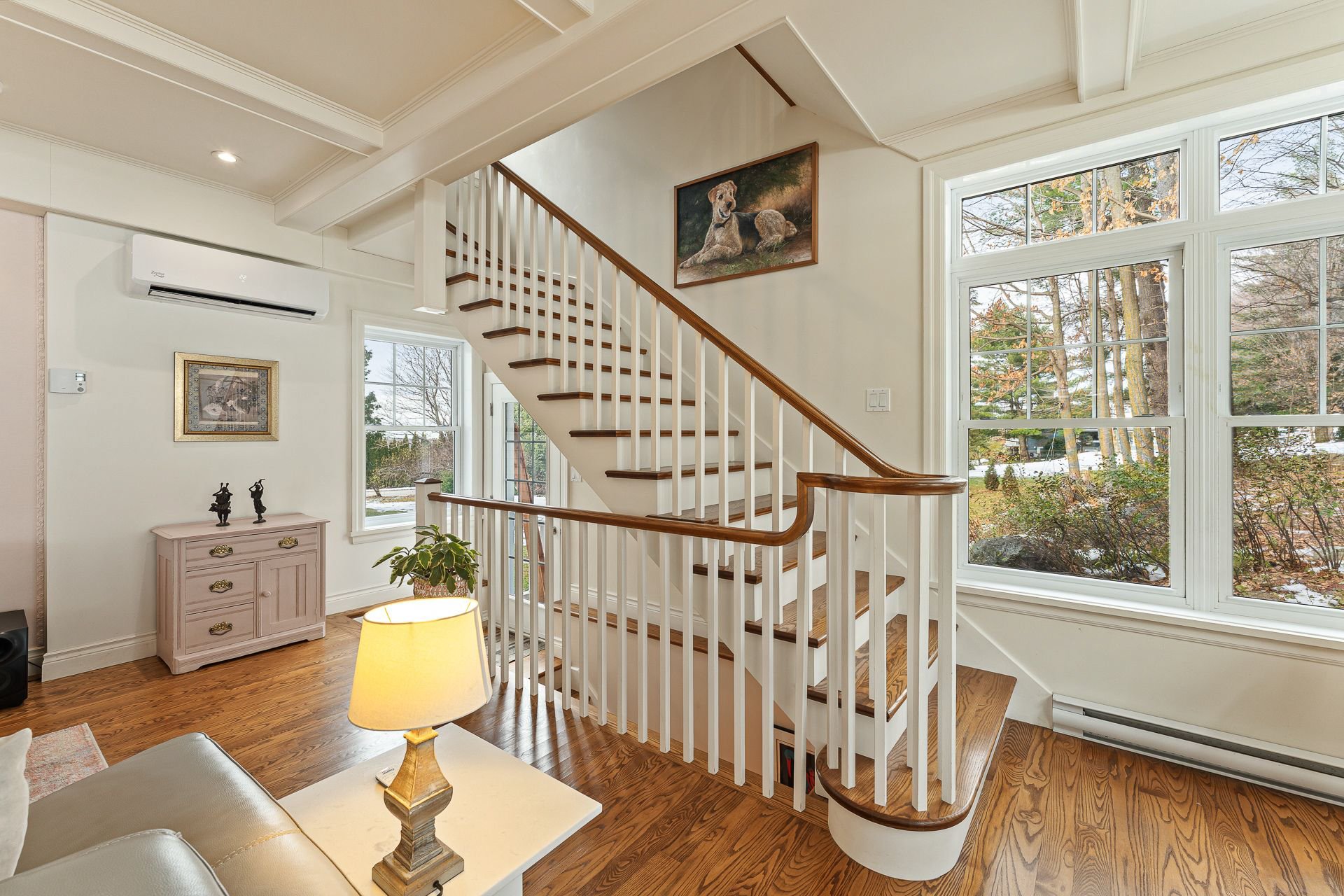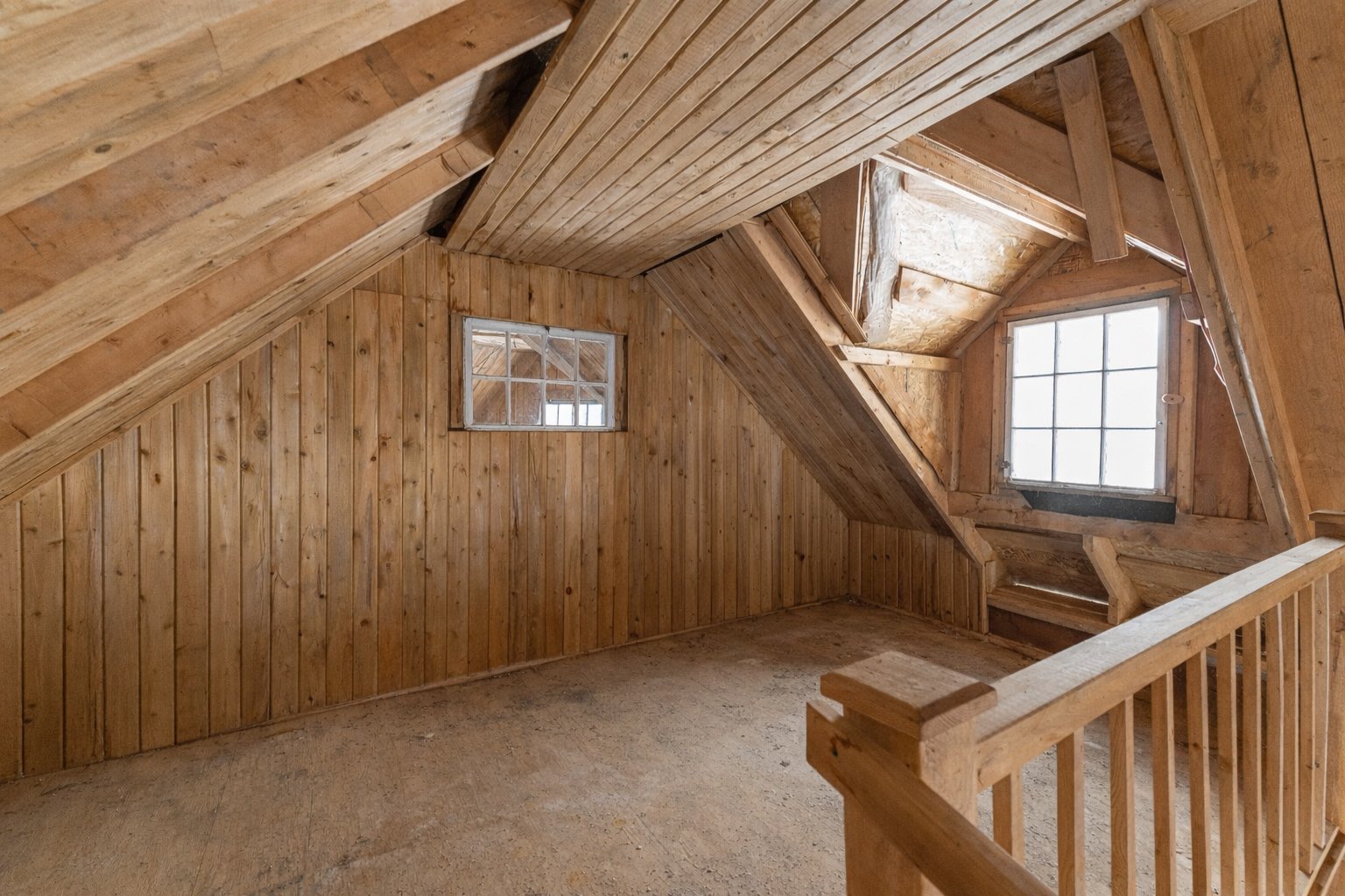 Dès l'entrée, le ton est donné avec un hall spacieux doté d'un garde-robe double et d'un élégant escalier menant à l'étage. Le salon, situé sur la gauche, séduit par son foyer au propane, ses poutres apparentes et son abondance de fenêtres qui inondent l'espace de lumière naturelle. Une salle d'eau est accessible à proximité, ajoutant au confort du rez-de-chaussée.