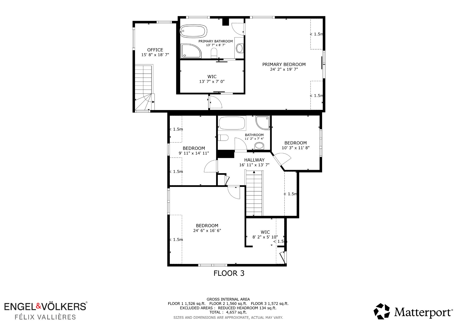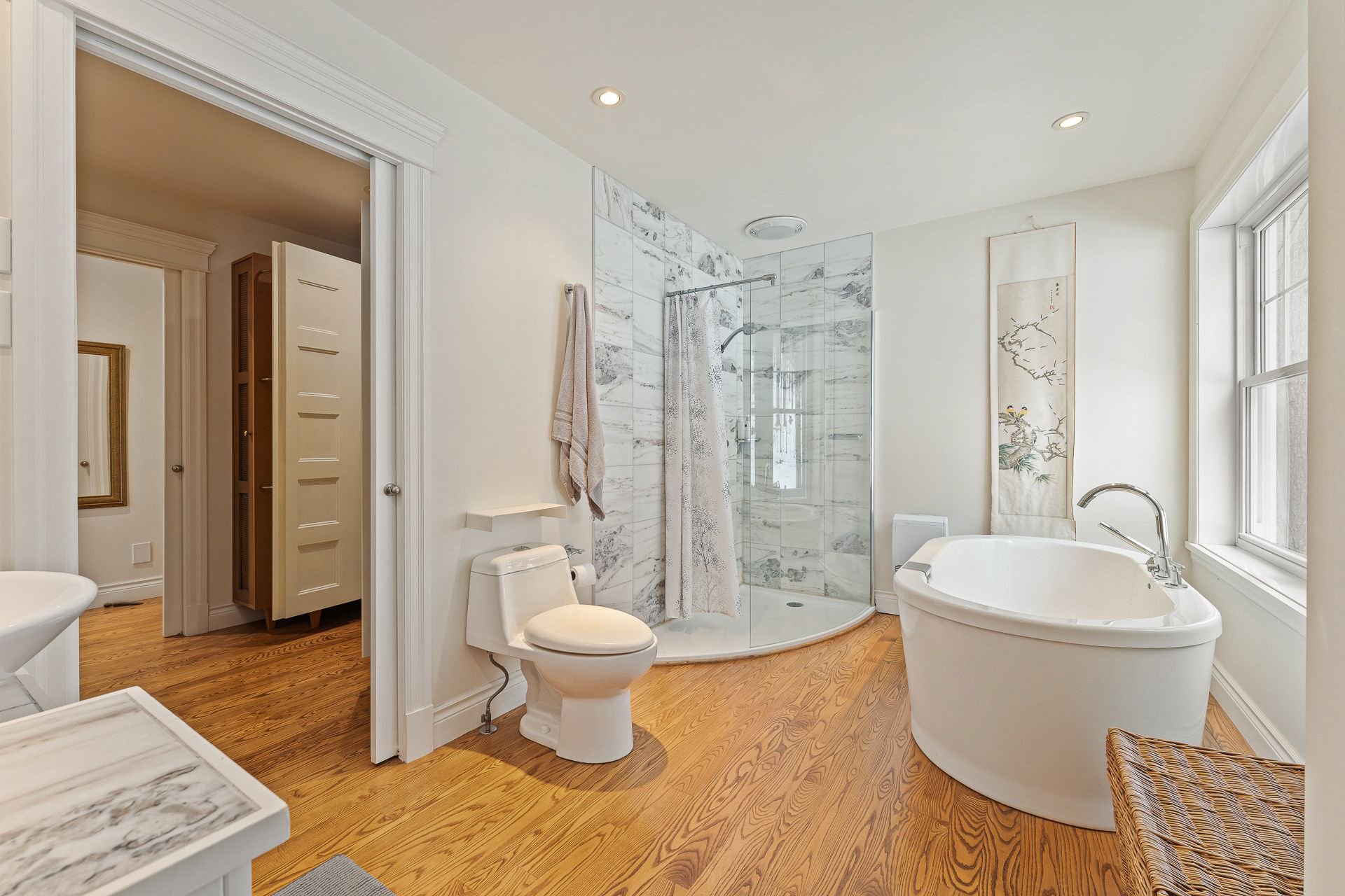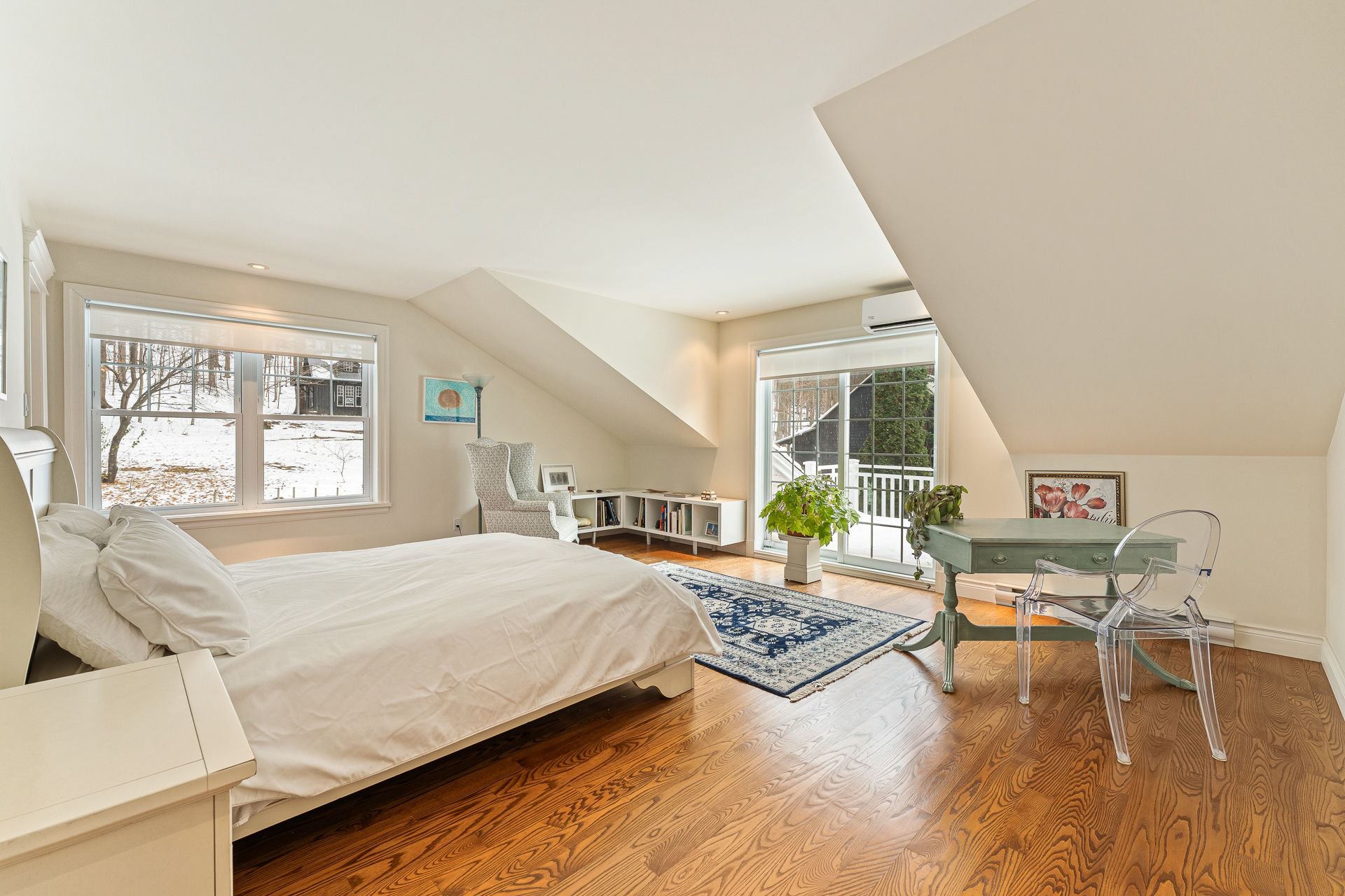 De la salle familiale, des escaliers mènent à l'étage supérieur ainsi qu'au sous-sol. À l'étage, la suite des maîtres impressionne par son concept intime et raffiné : un bureau ou boudoir précède la chambre principale au plafond mansardé, dotée d'une porte-patio donnant accès à un balcon privé. La salle de bain attenante, luxueuse, propose une grande douche vitrée en céramique et une baignoire autoportante, complétée par un vaste walk-in digne des plus beaux magazines.