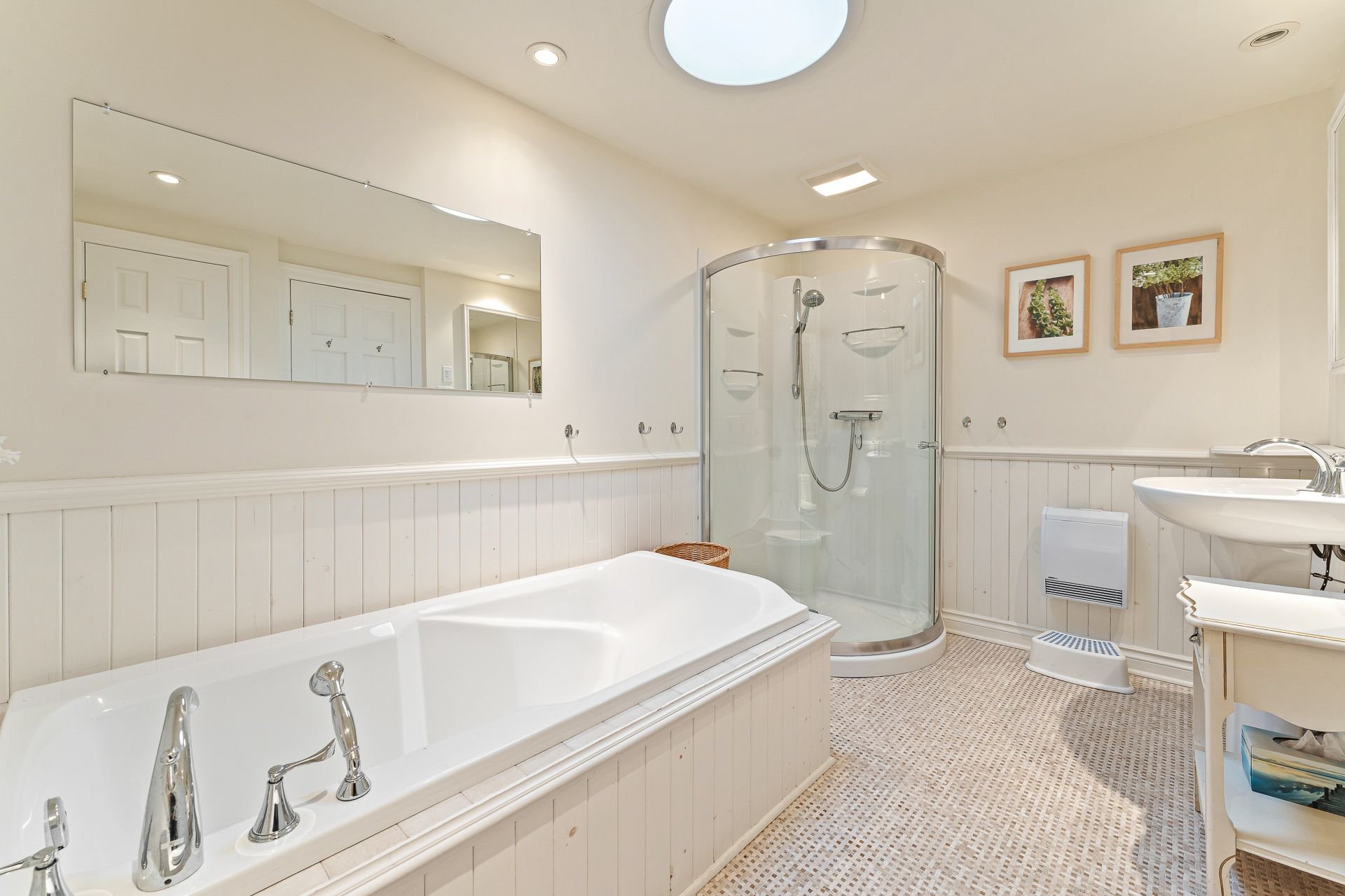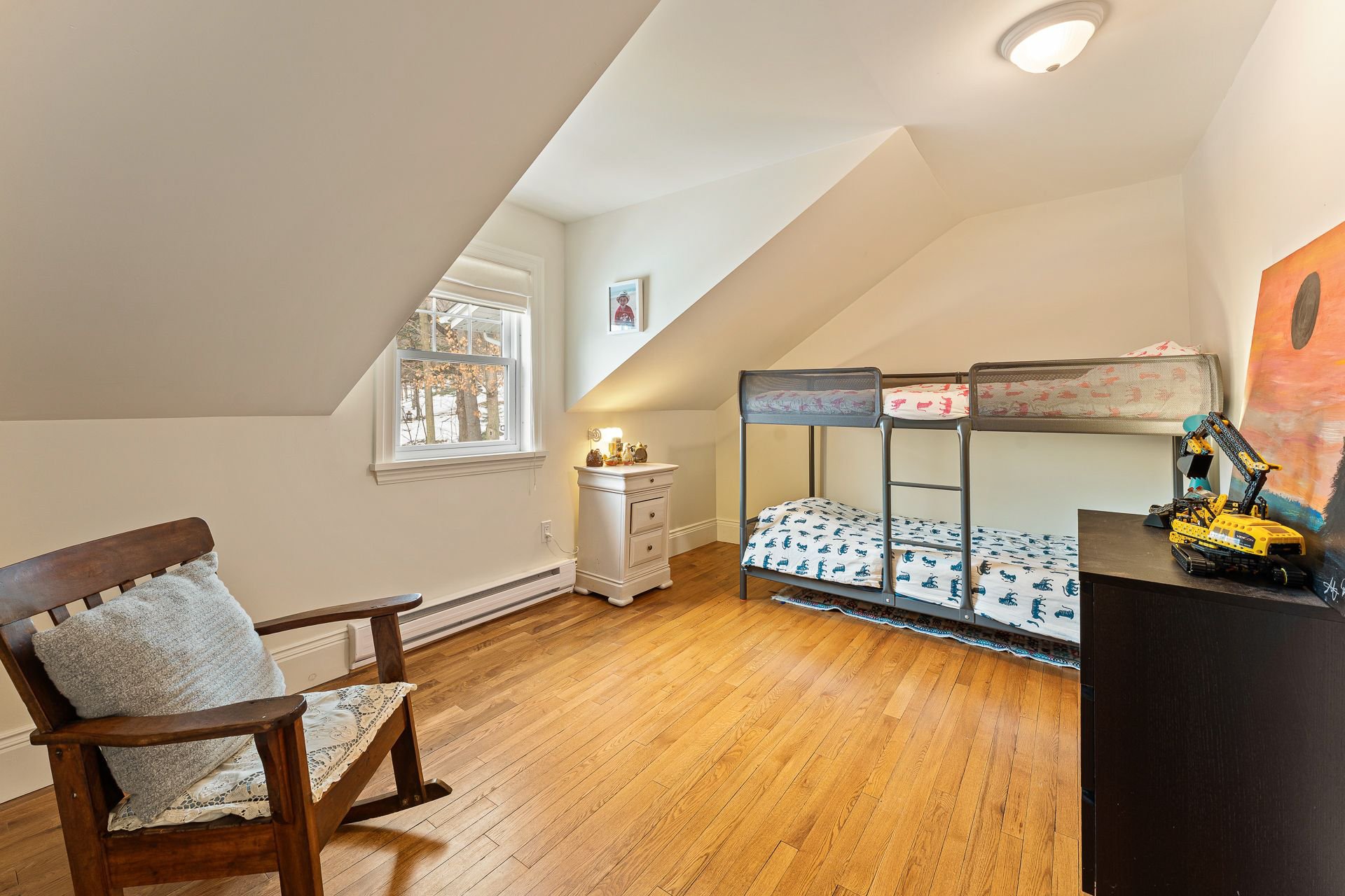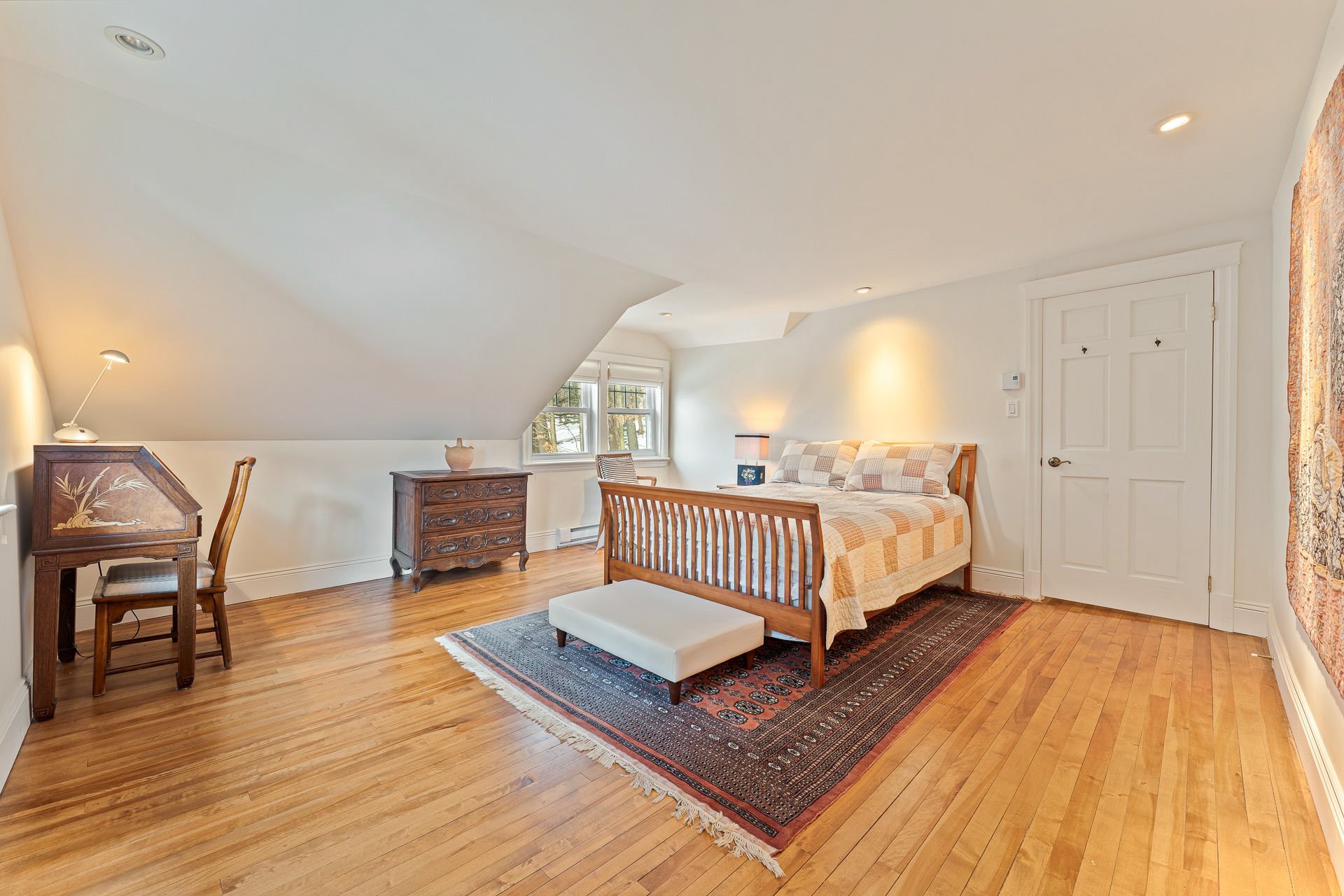 Le grand escalier du hall d'entrée mène également aux trois autres chambres à l'étage, toutes munies de plafonds mansardés, dont l'une dispose d'un walk-in. Une seconde salle de bain complète avec baignoire et douche y est également aménagée.