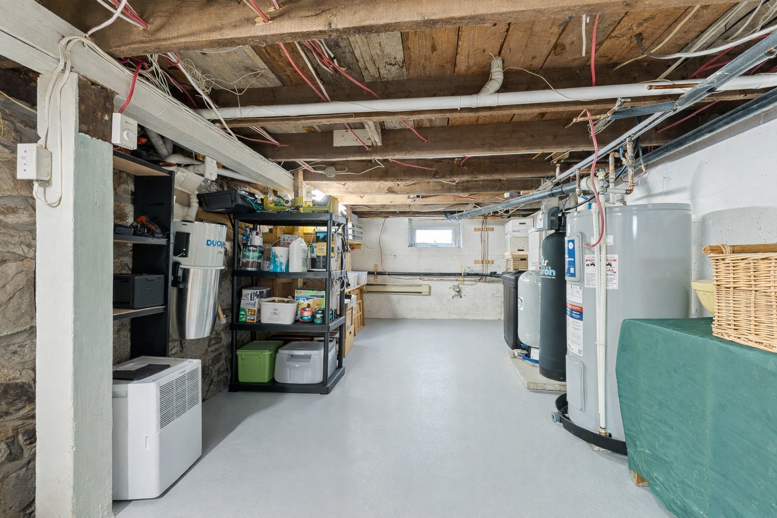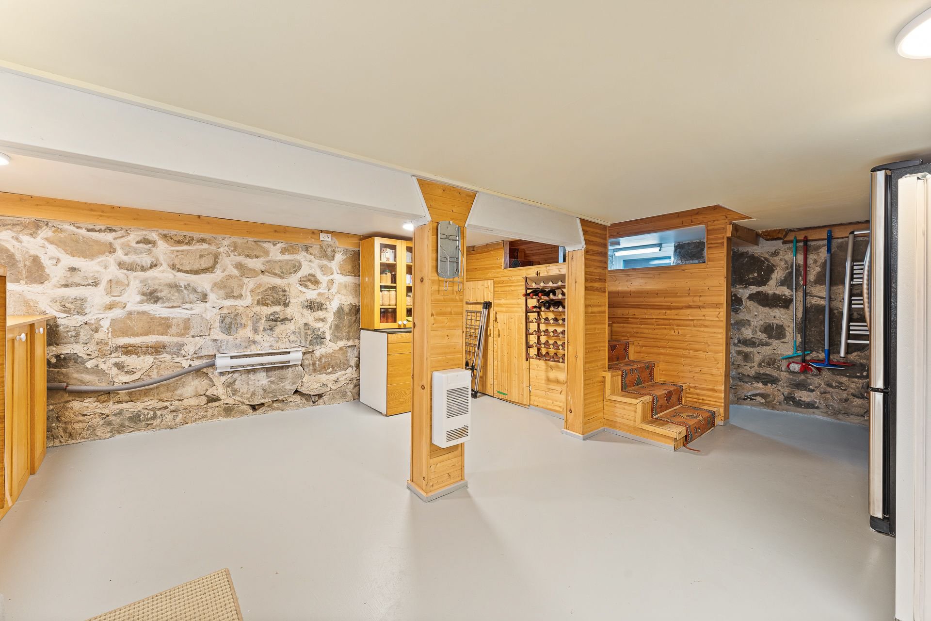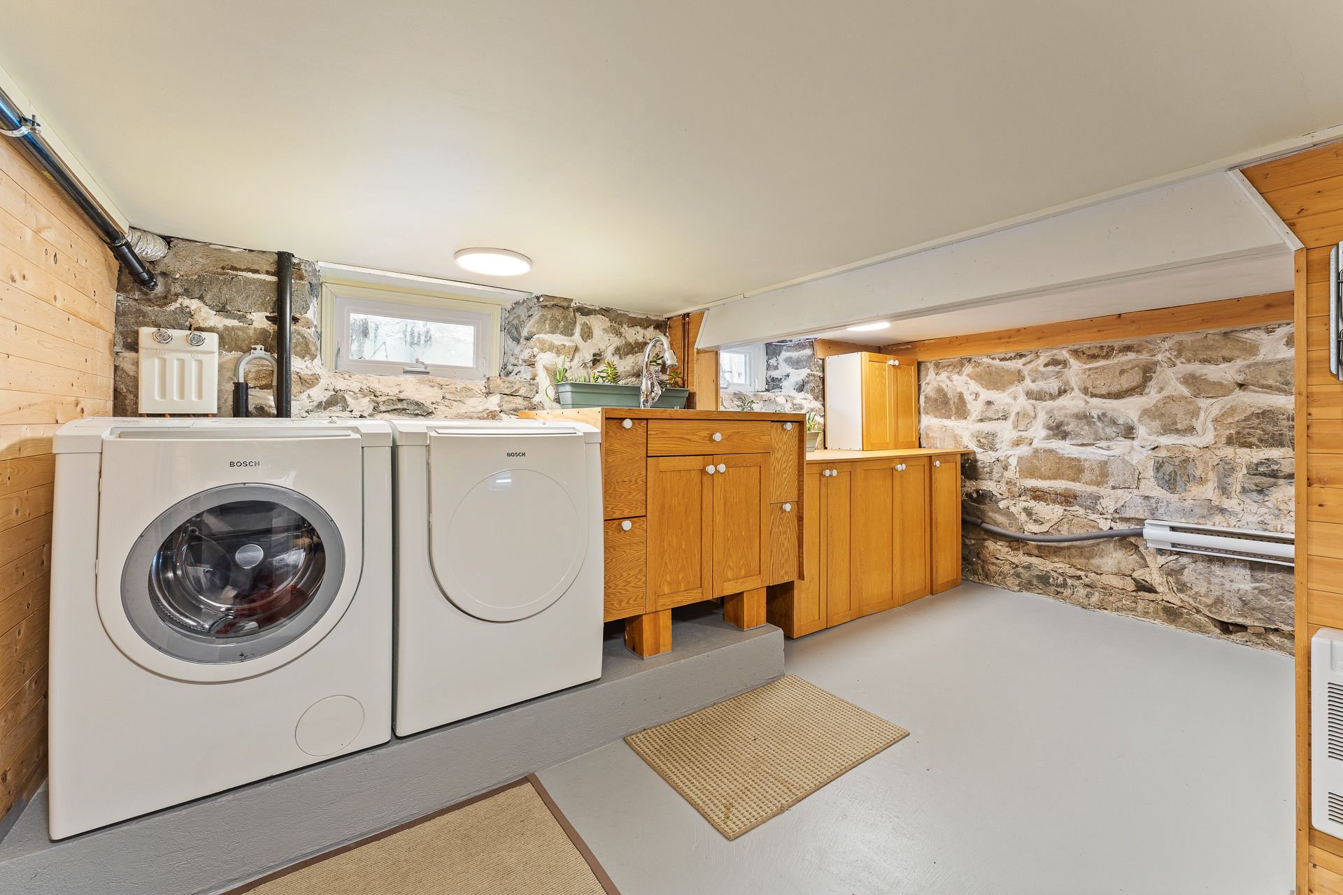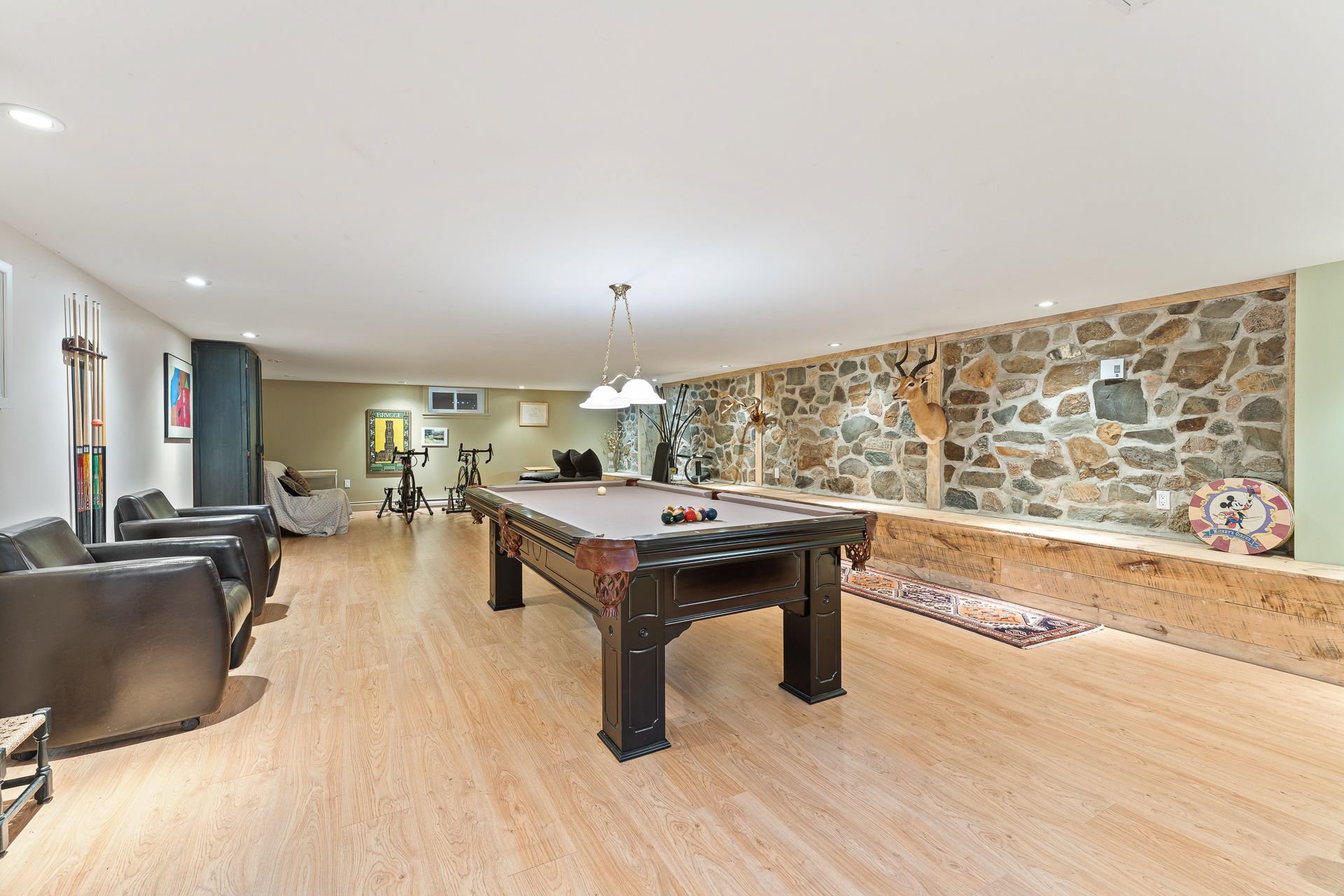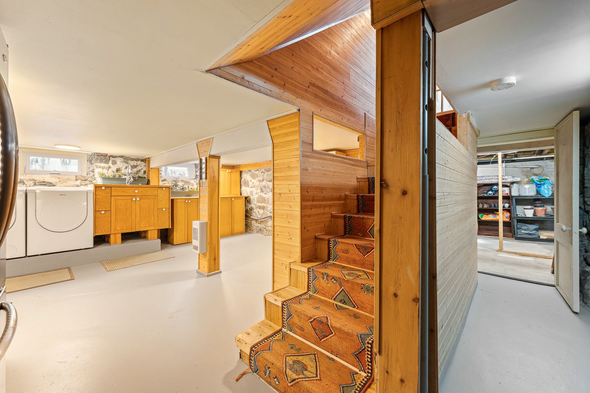Le sous-sol offre une spacieuse salle de jeux agrémentée d'un superbe mur de pierres, une grande salle mécanique faisant également office de rangement, ainsi qu'une vaste salle de lavage bénéficiant d'un second escalier menant directement à la cuisine du rez-de-chaussée.