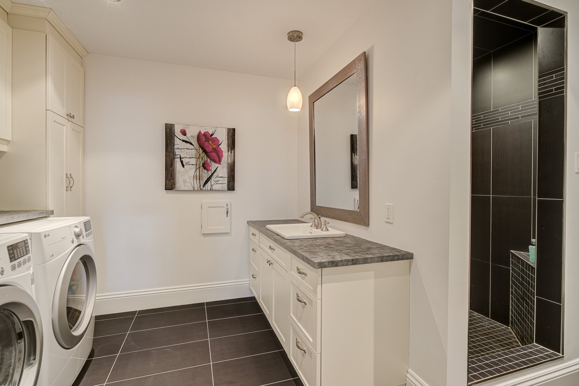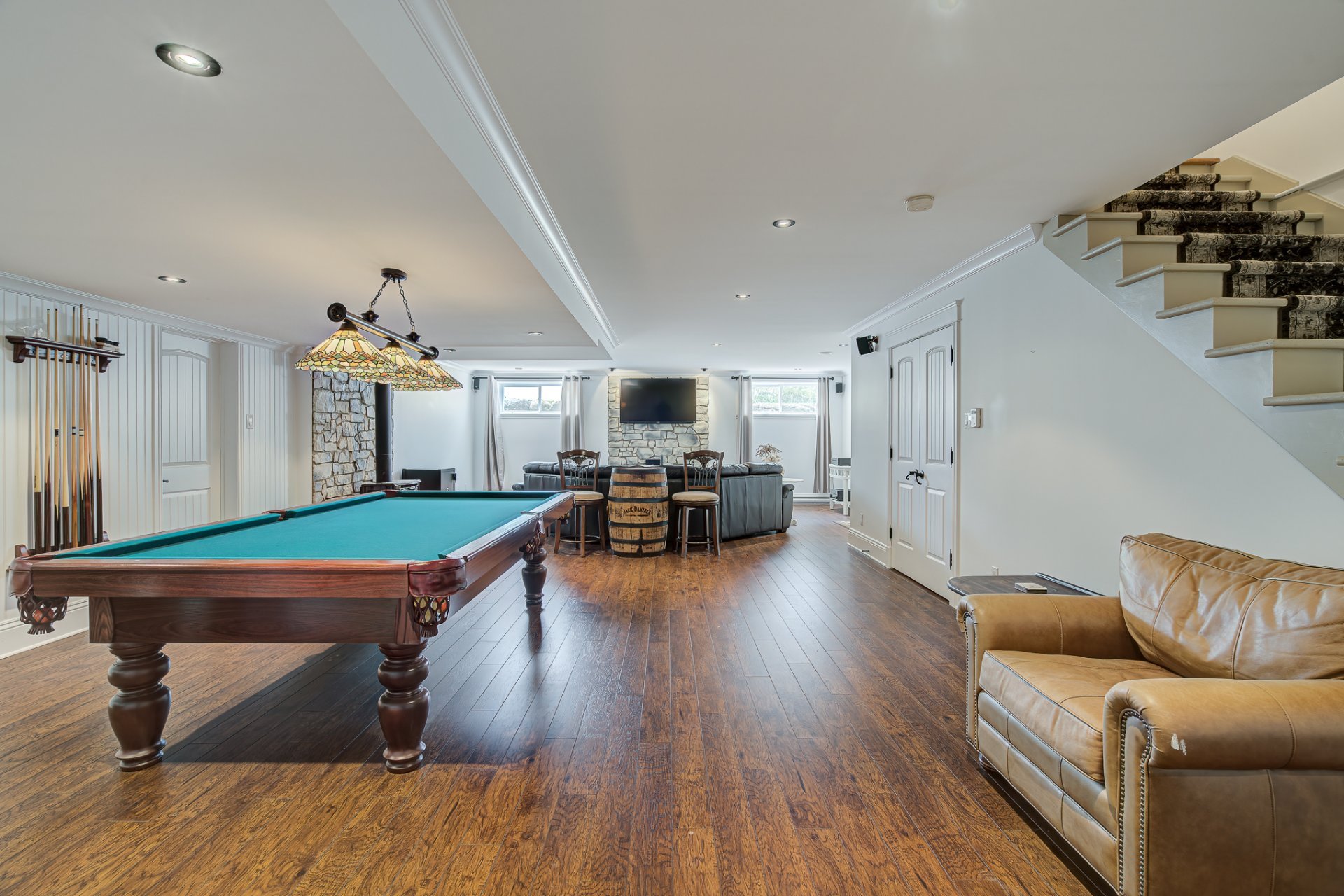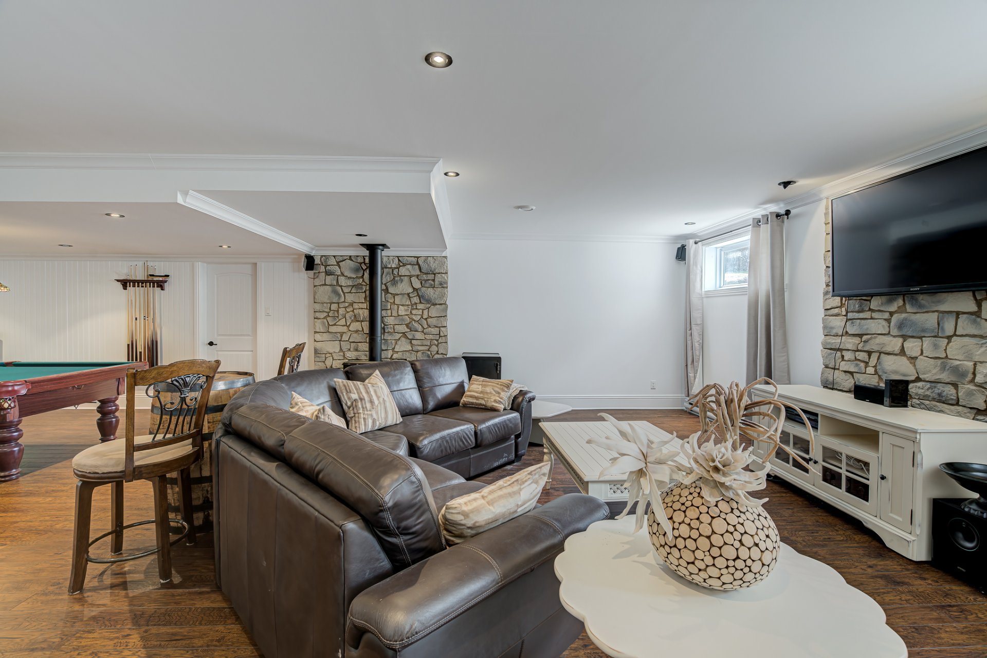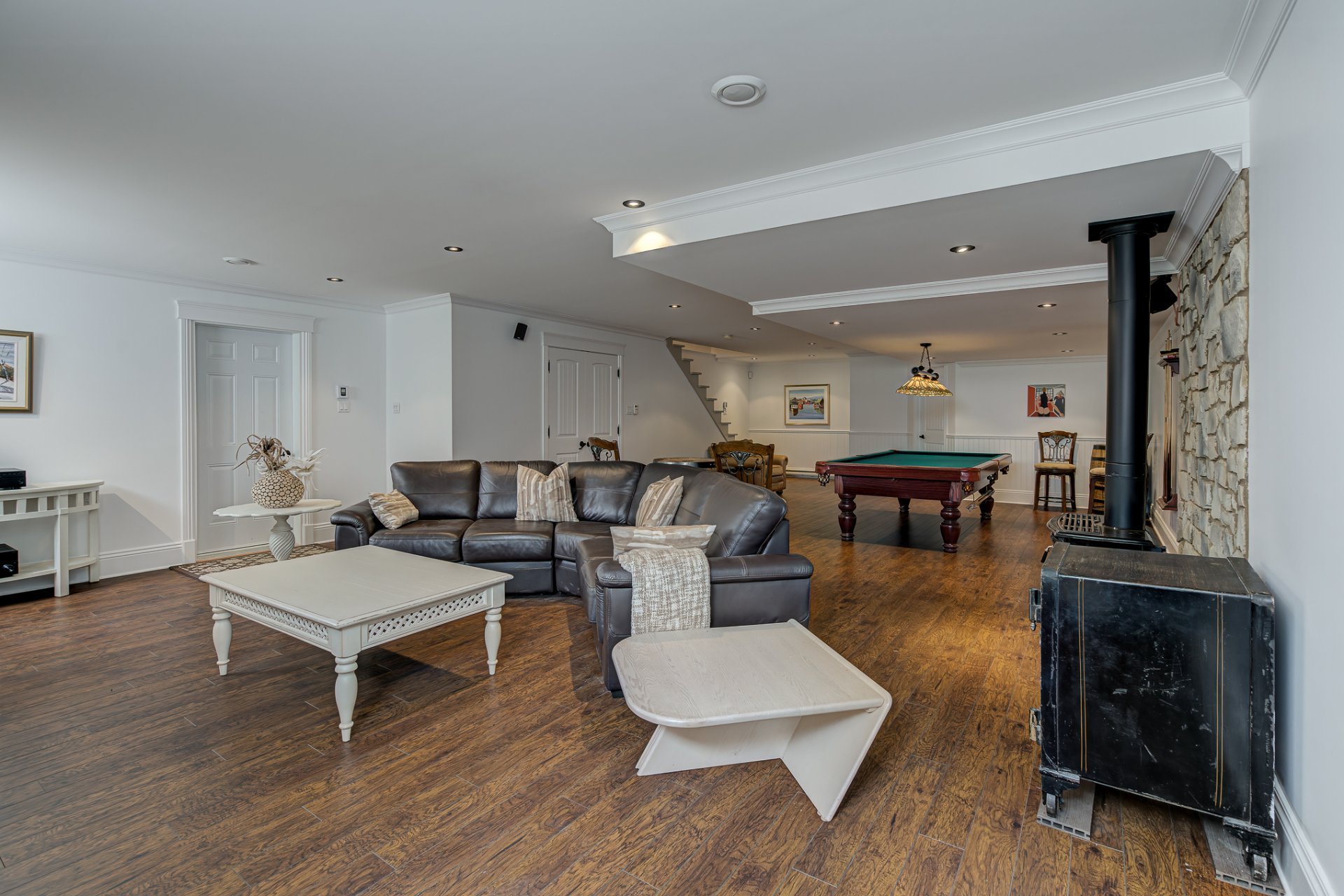 Le sous-sol est complètement aménagé et comprend un bel espace de jeux ainsi qu'un coin télévision avec un poêle à bois. S'y trouvent aussi une 5ème chambre et une 3ème salle de bain complète où se trouve également le coin buanderie. Accès au garage en prime.