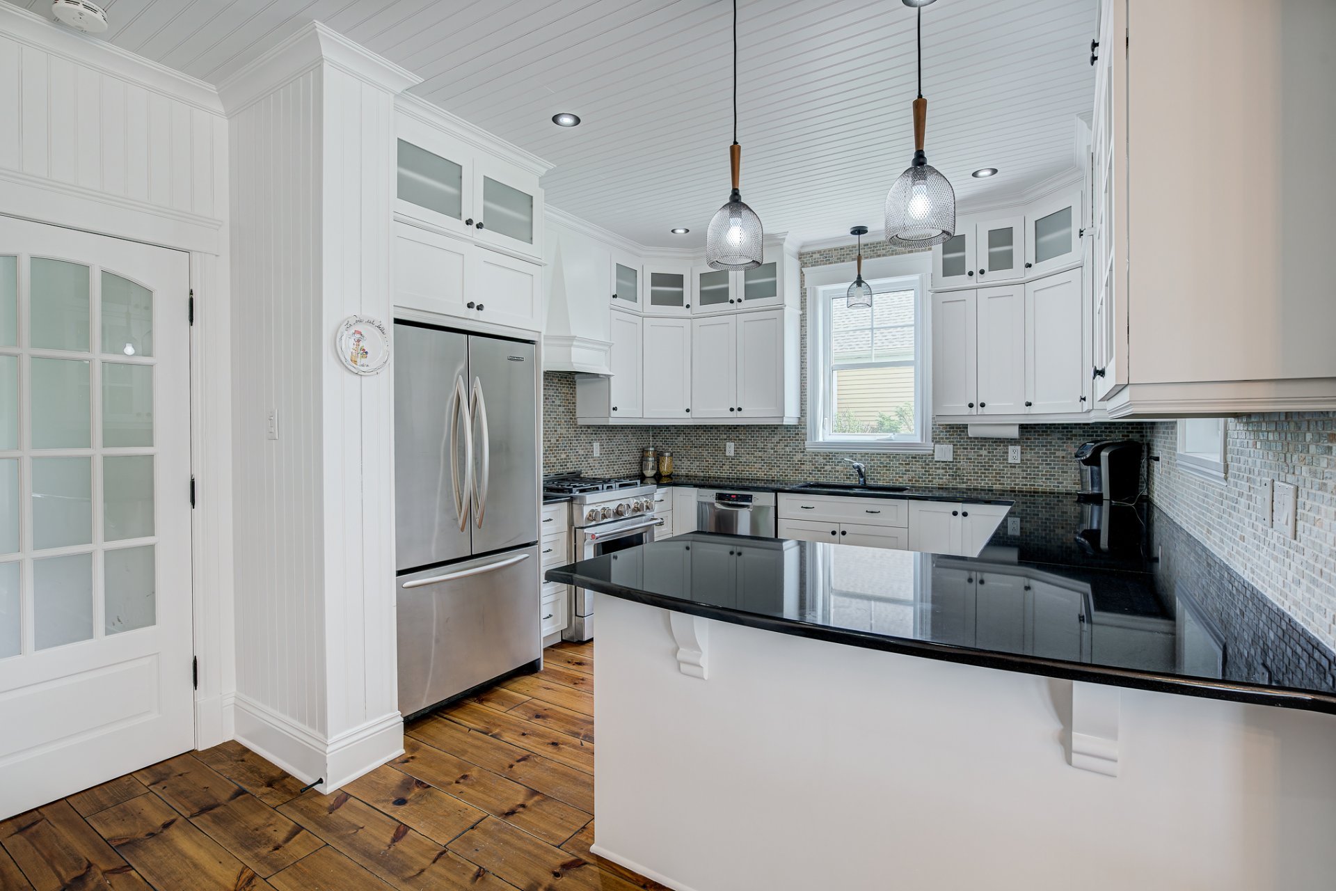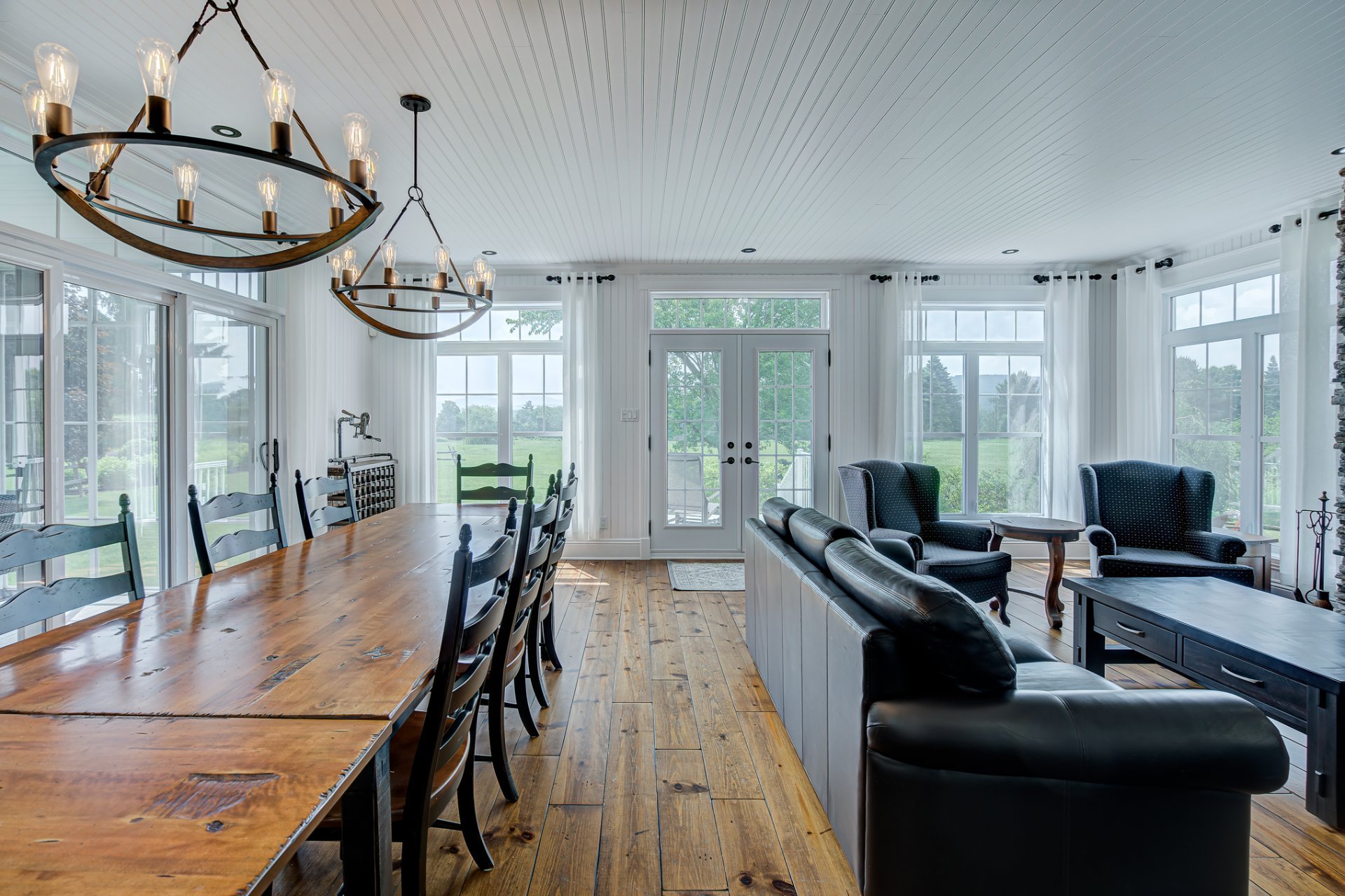 Le rez-de-chaussée est principalement composé d'une immense pièce aux plafonds faisant près de 9 pieds, fenestrée sur la cour arrière et munie d'un foyer au bois au centre du salon, qui peut être admiré tant de la salle à manger que de la cuisine. Cette pièce donne accès à une belle véranda grillagée qui permet de prolonger la saison estivale grâce à une lampe radiante. Elle est aussi ouverte sur la terrasse arrière et la cour. La chambre principale complète cet aire d'étage et est munie d'un espace walk-in et d'une grande salle de bain privée.