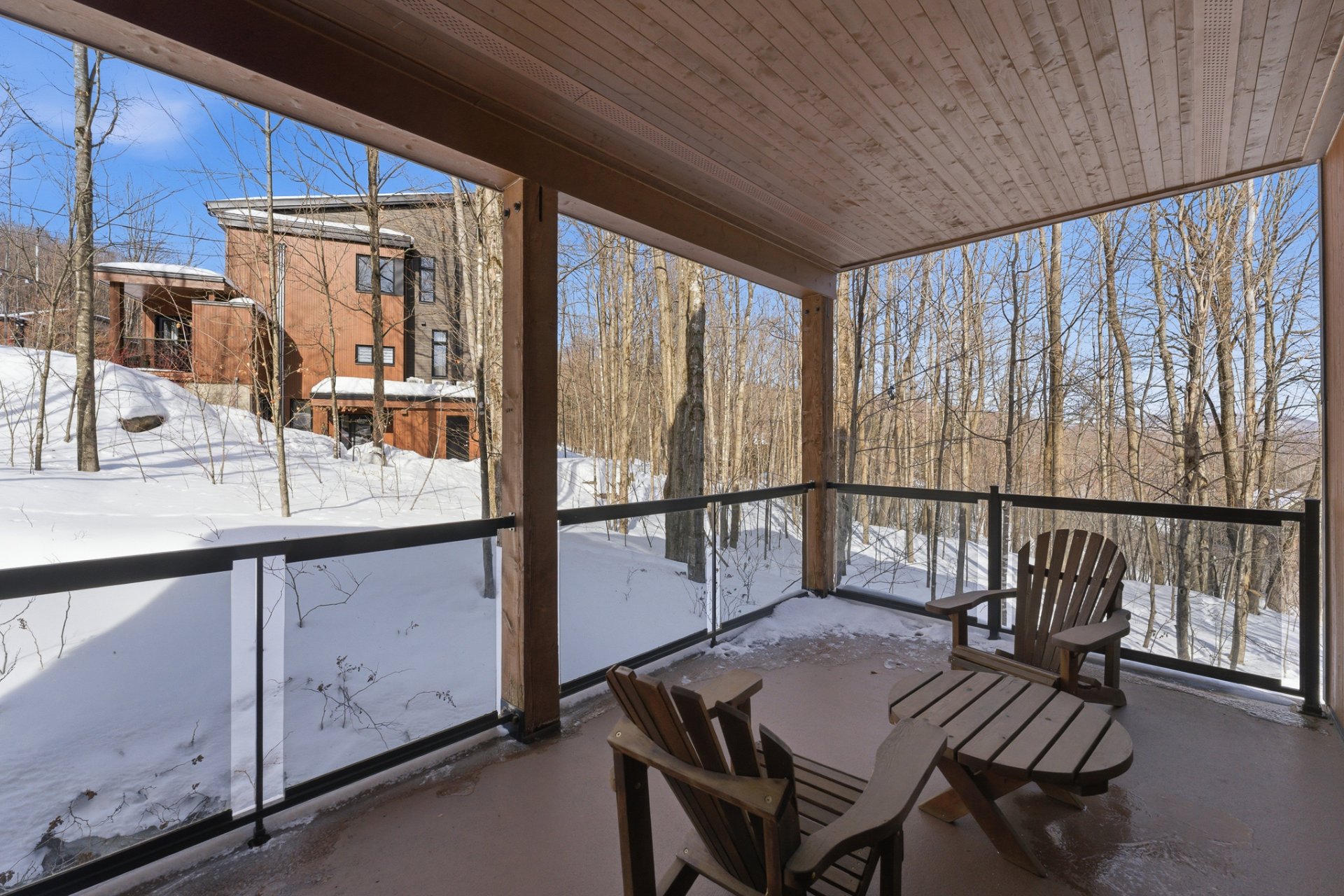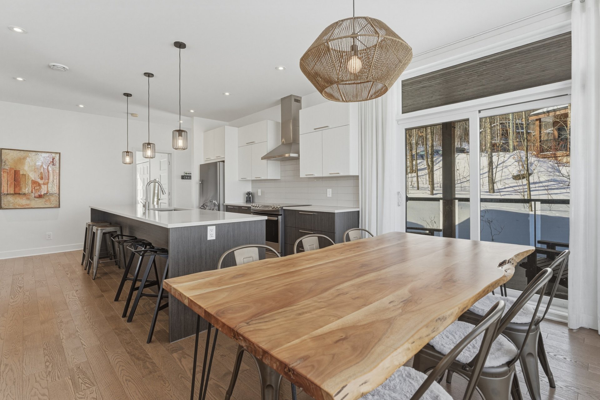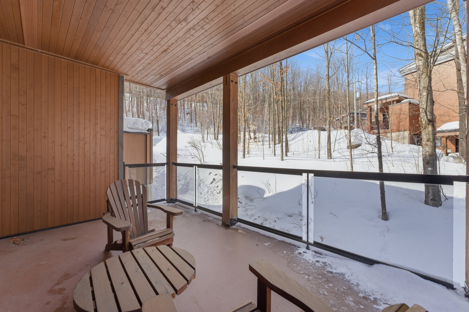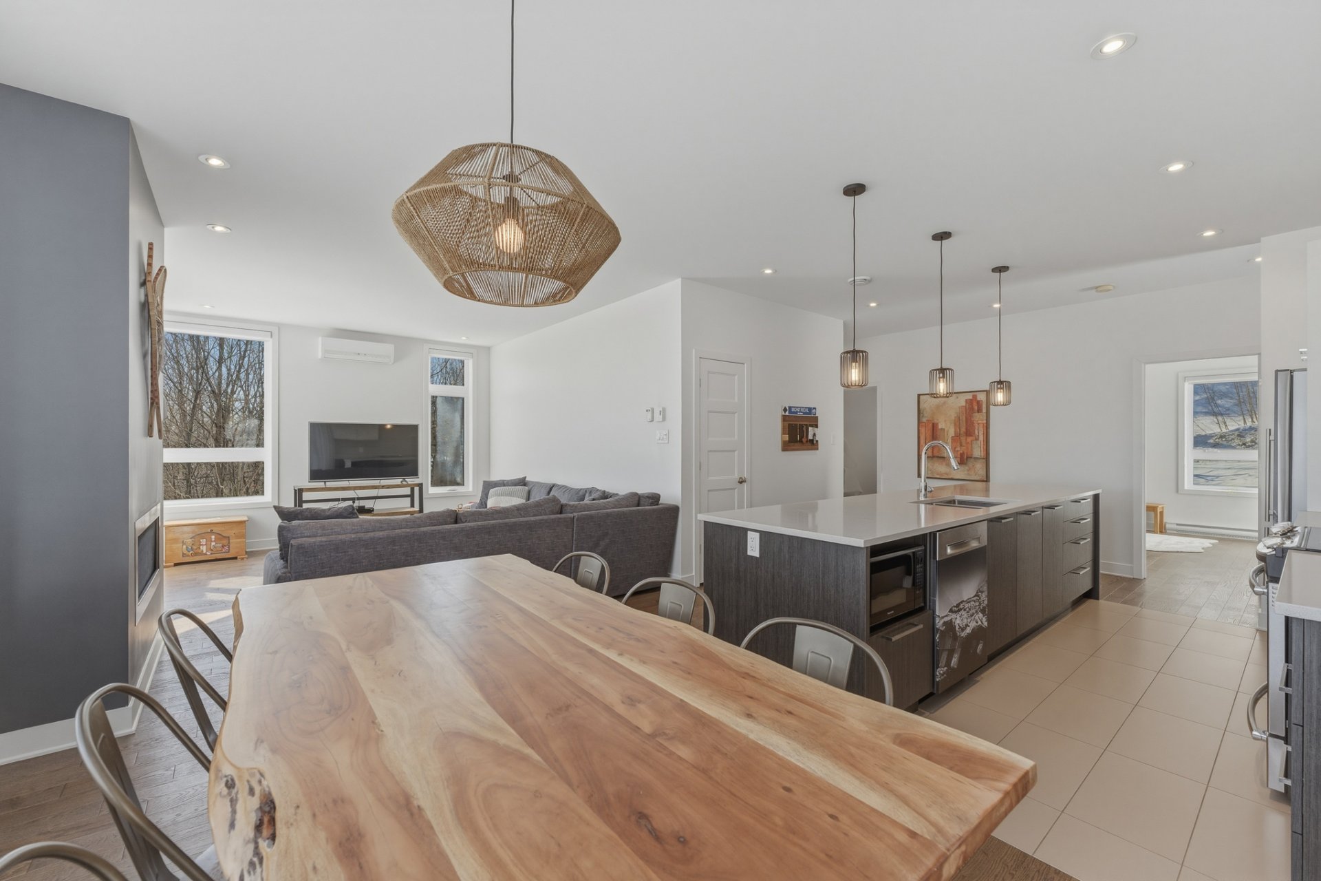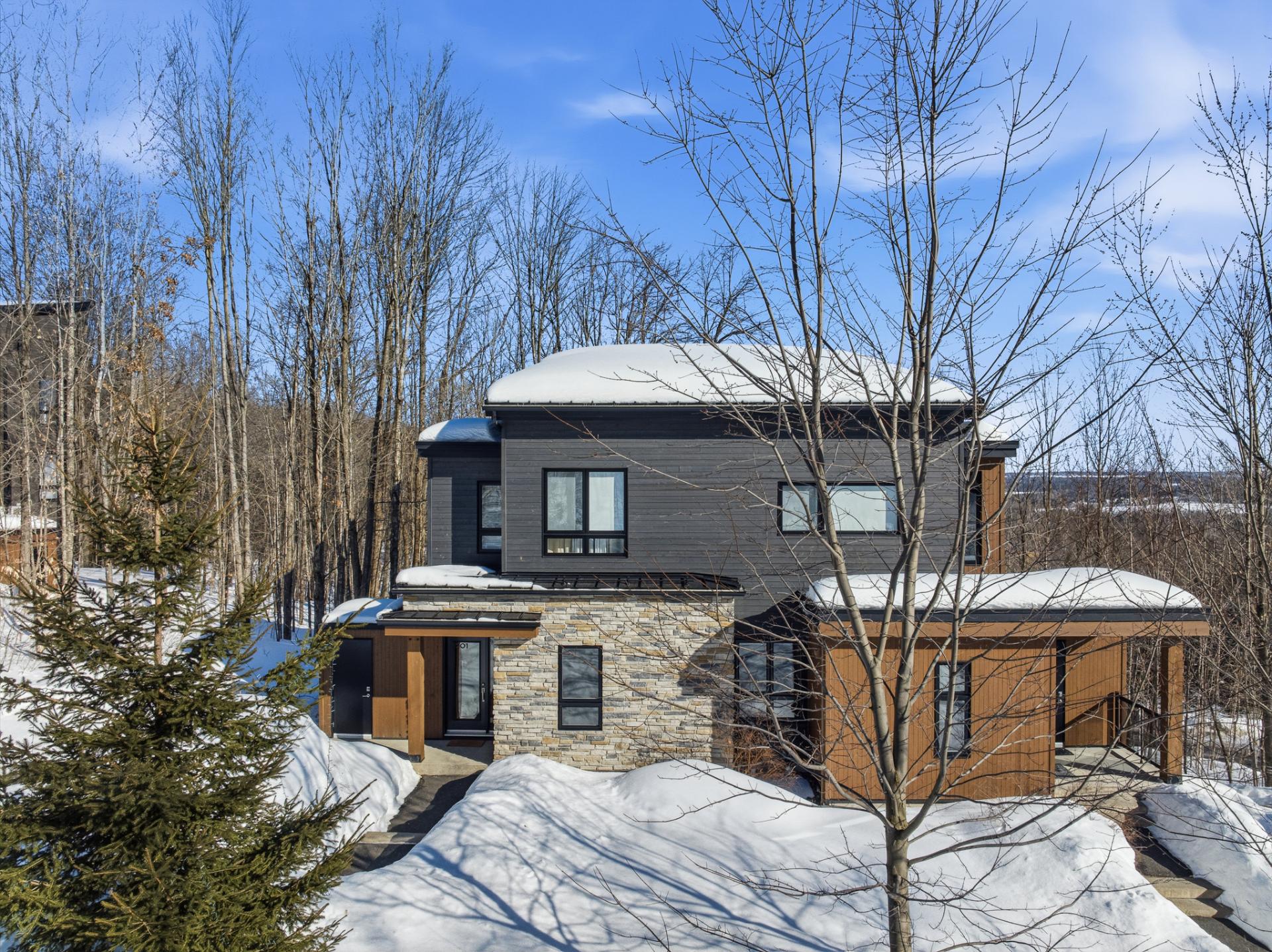 Dès l'entrée, vous serez séduit par l'aire de vie lumineuse à aire ouverte, sublimée par des plafonds de 9 pieds et une fenestration très généreuse offrant une vue imprenable sur l'environnement boisé et les montagnes au loin. L'espace salon, chaleureux et invitant, est agrémenté d'un foyer au propane, parfait pour vos soirées d'hiver après une journée sur les pentes.