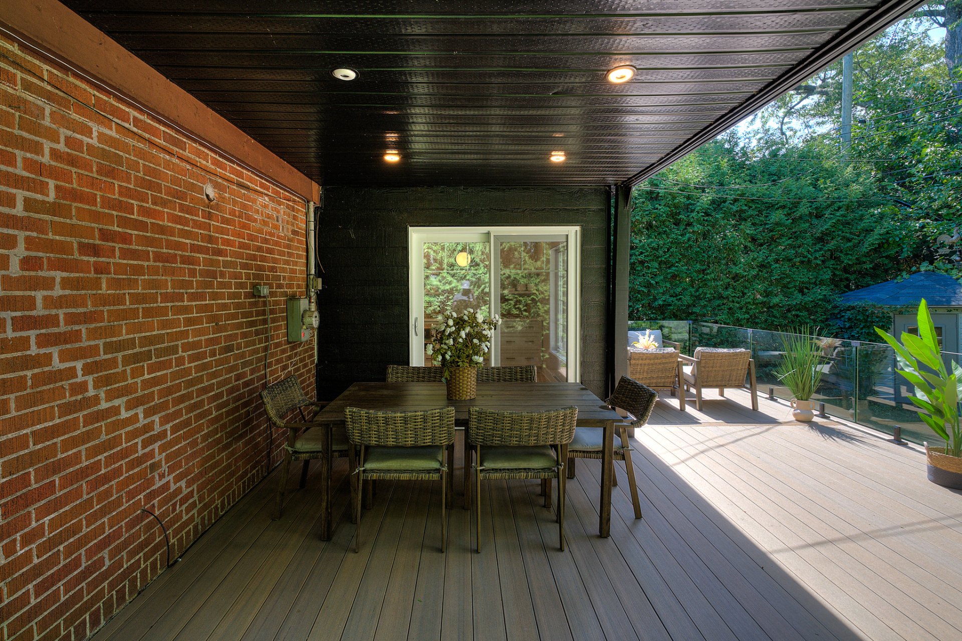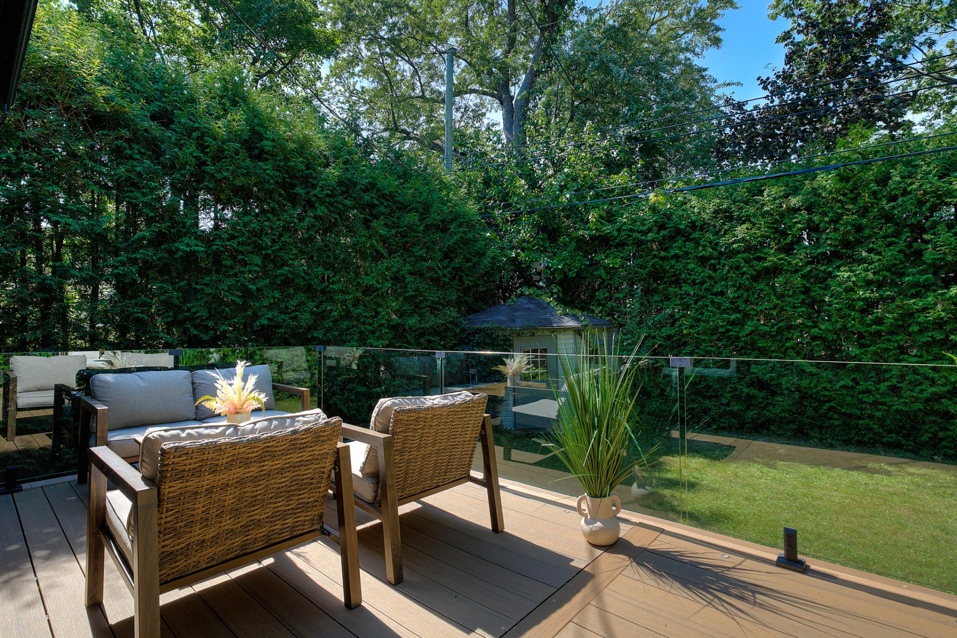 - Terrasse de qualité supérieure en composite avec clôture vitrée offrant une vue panoramique sur le jardin intime bordé de haies matures impressionnantes.