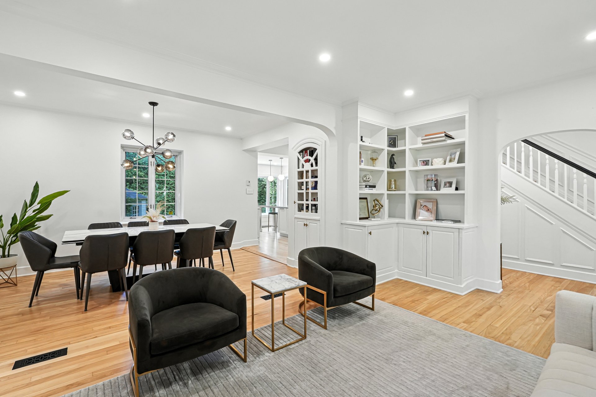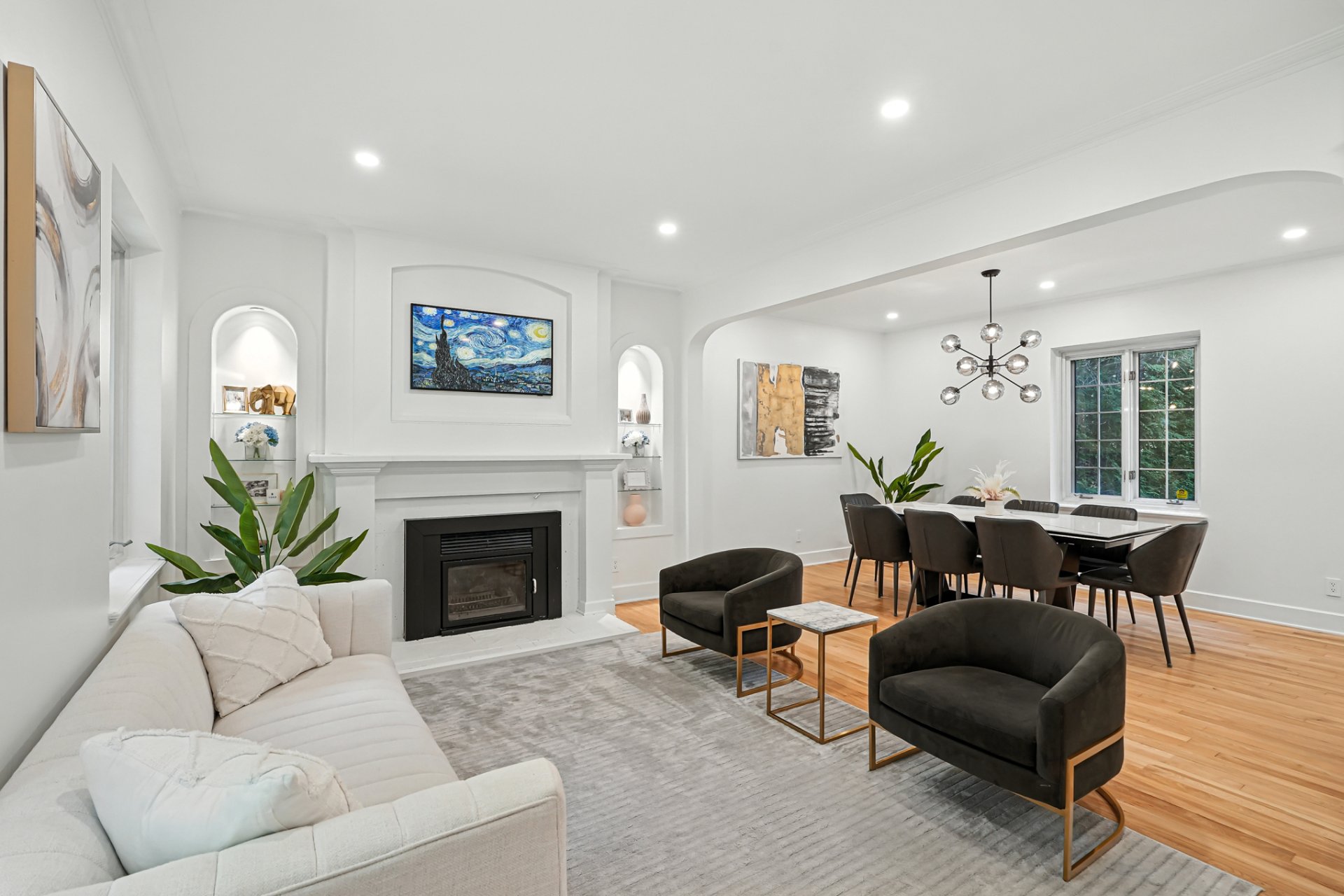 - Salon avec charmant manteau de cheminée et bibliothèque encastrée, ouvert sur la salle à manger.