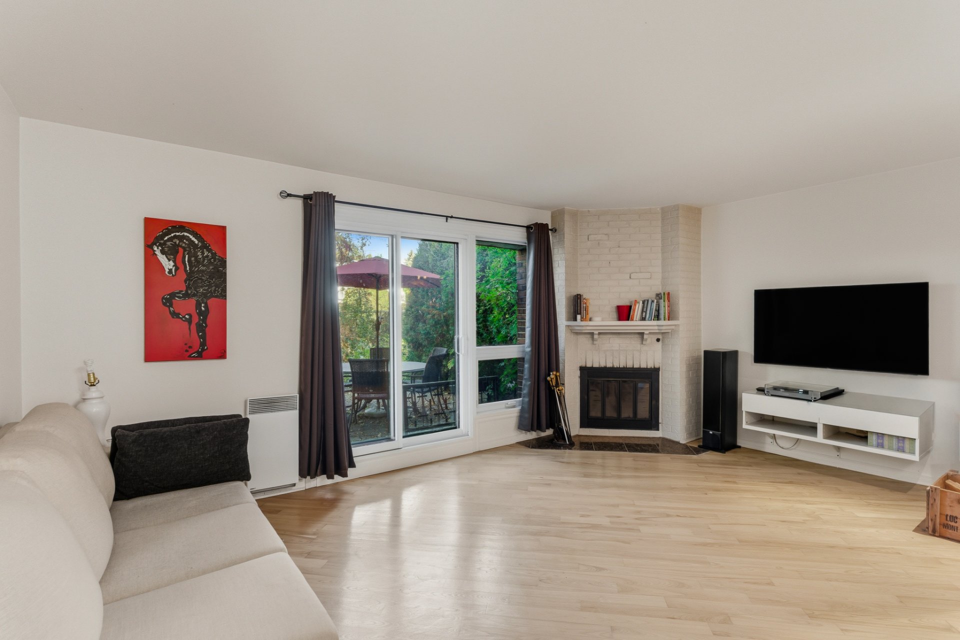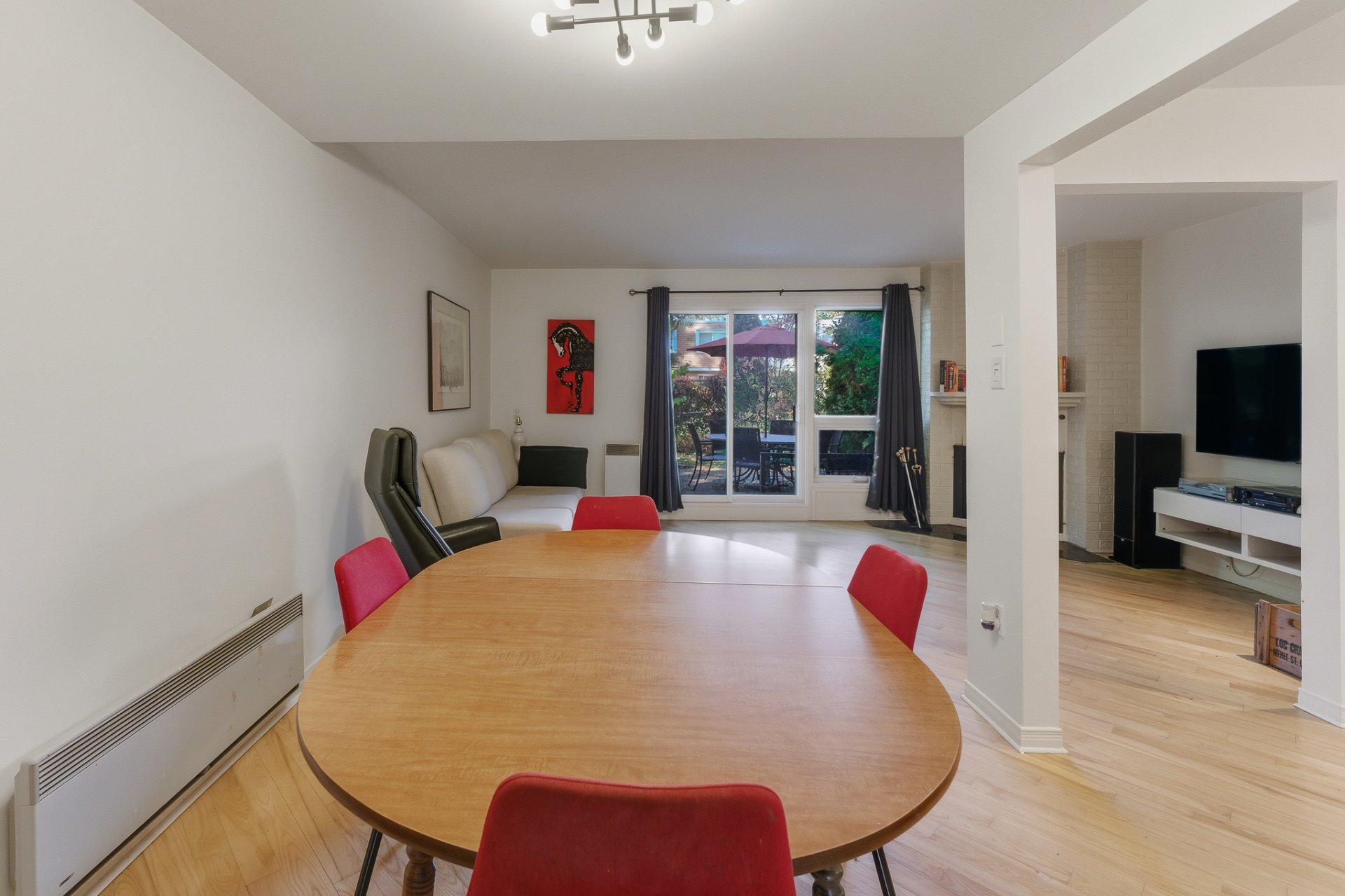 * L'aire principale regroupe la salle à manger et le salon, ce dernier étant agrémenté d'un foyer au bois avec manteau en briques. Une porte-patio permet d'accéder directement à la terrasse
