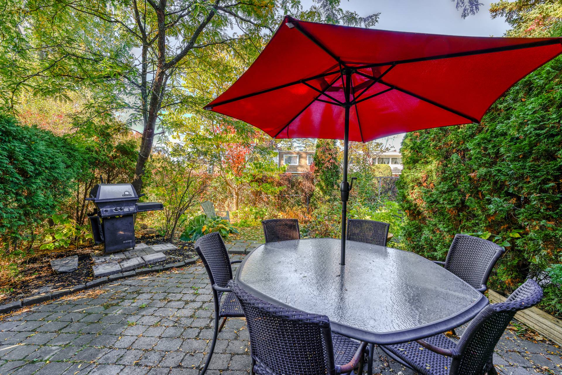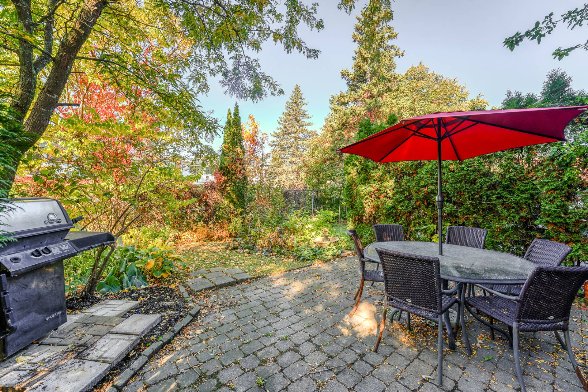 * Cour intime aménagée d'une terrasse au sol sur pavé, terrain boisé