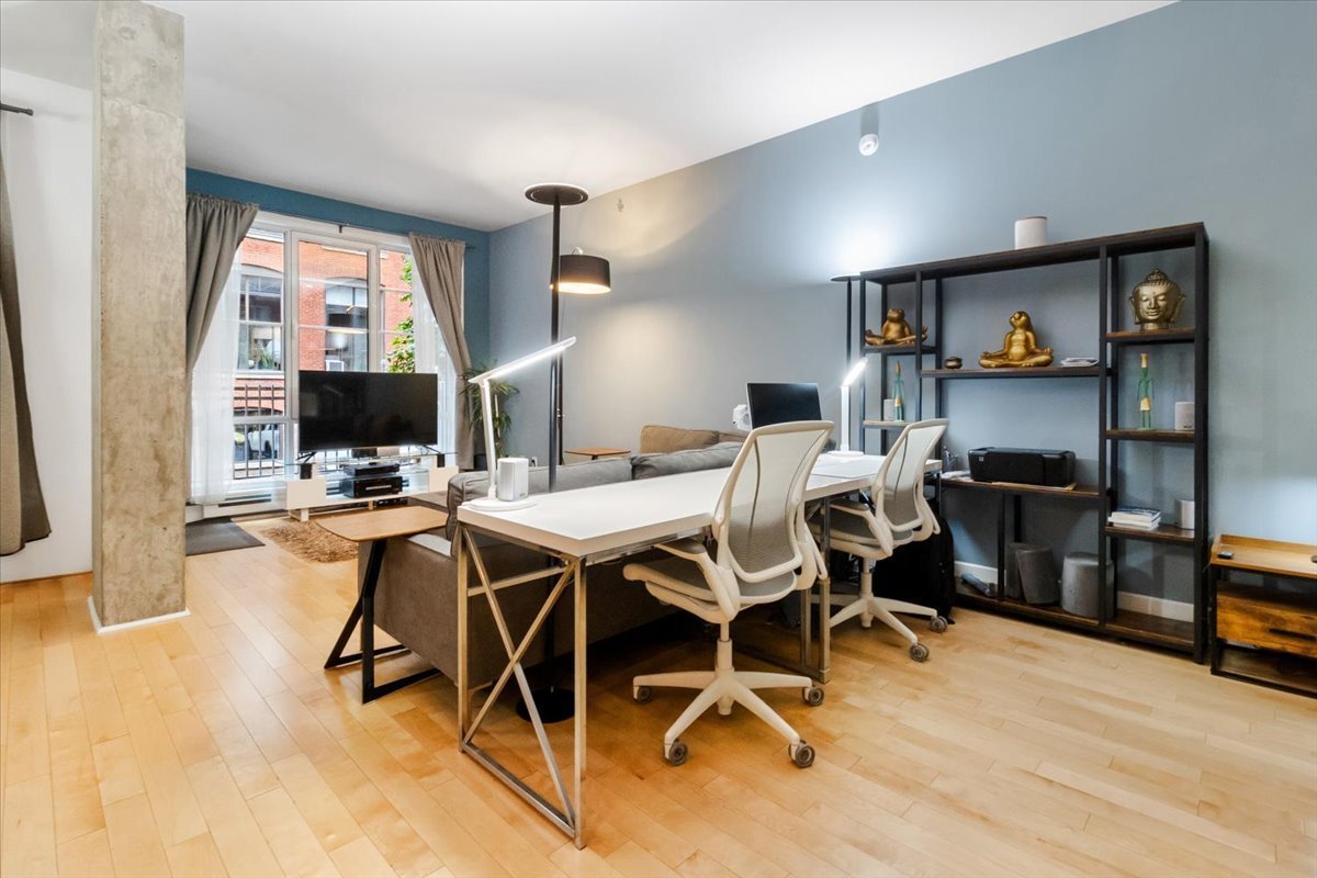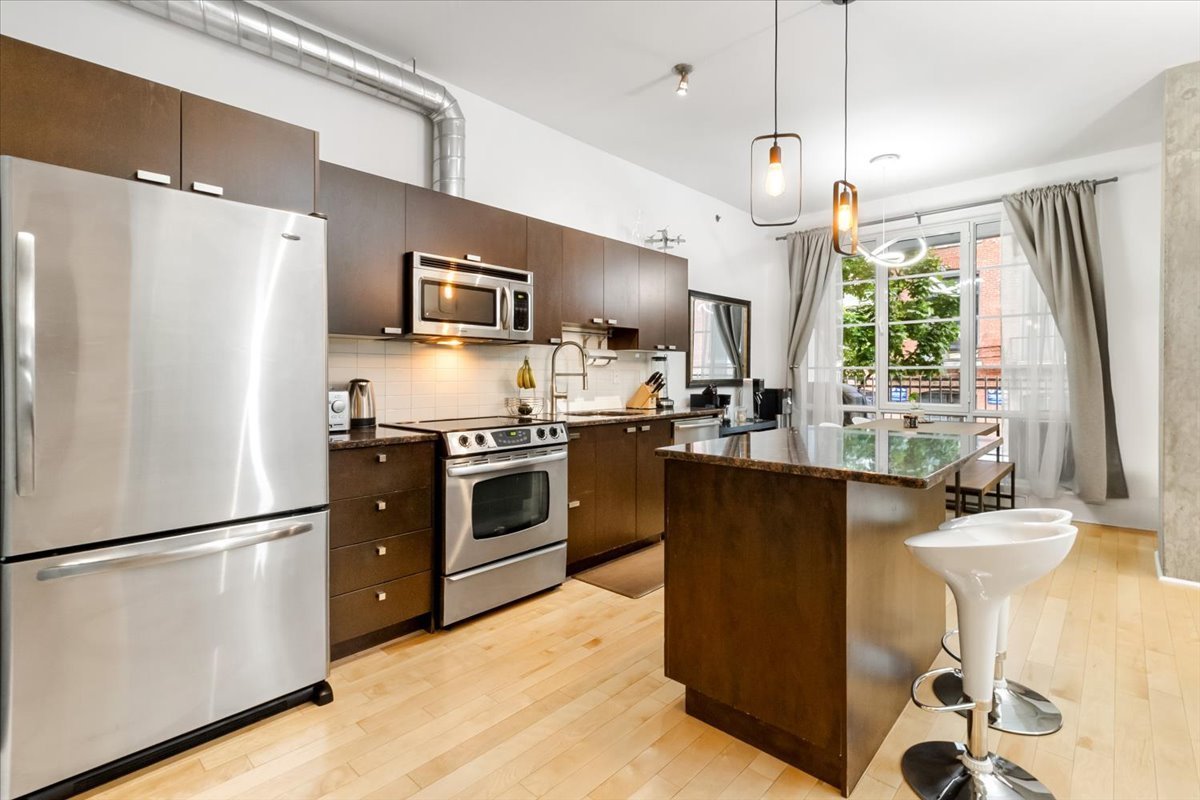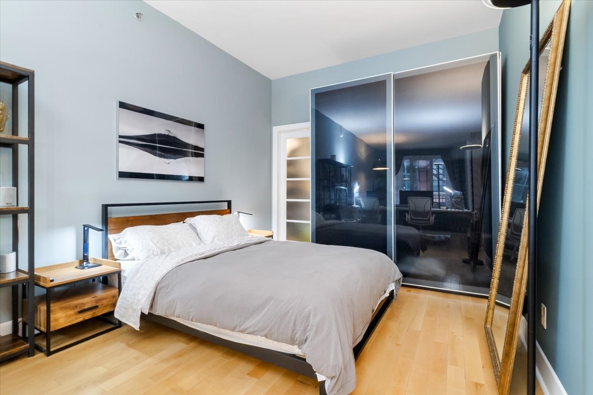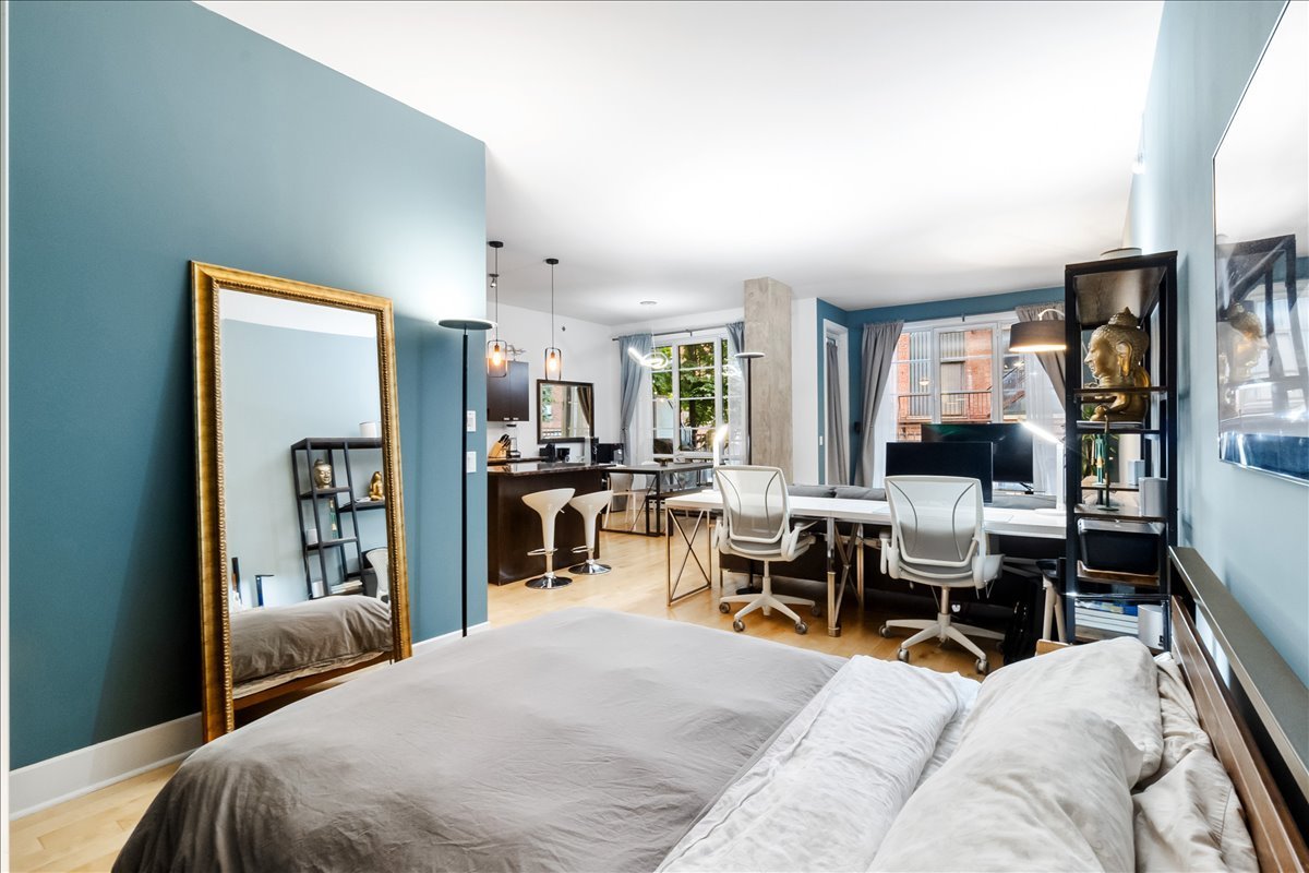 QUAI DES ÉCLUSIERS phase 4 | Charmant condo, grande fenestration, plafonds béton 10 pieds, lattes de bois, espace de vie ouvert, cuisine urbaine, une chambre semi-fermée, climatiseur mural, terrasse privée et garage. Espaces communs: piscine intérieur chauffée, sauna, s/exercices, jardin commun, accès au canal et Kayaks.