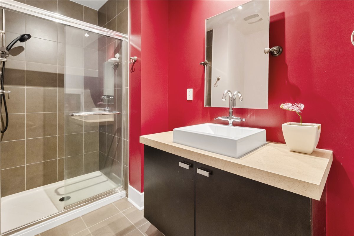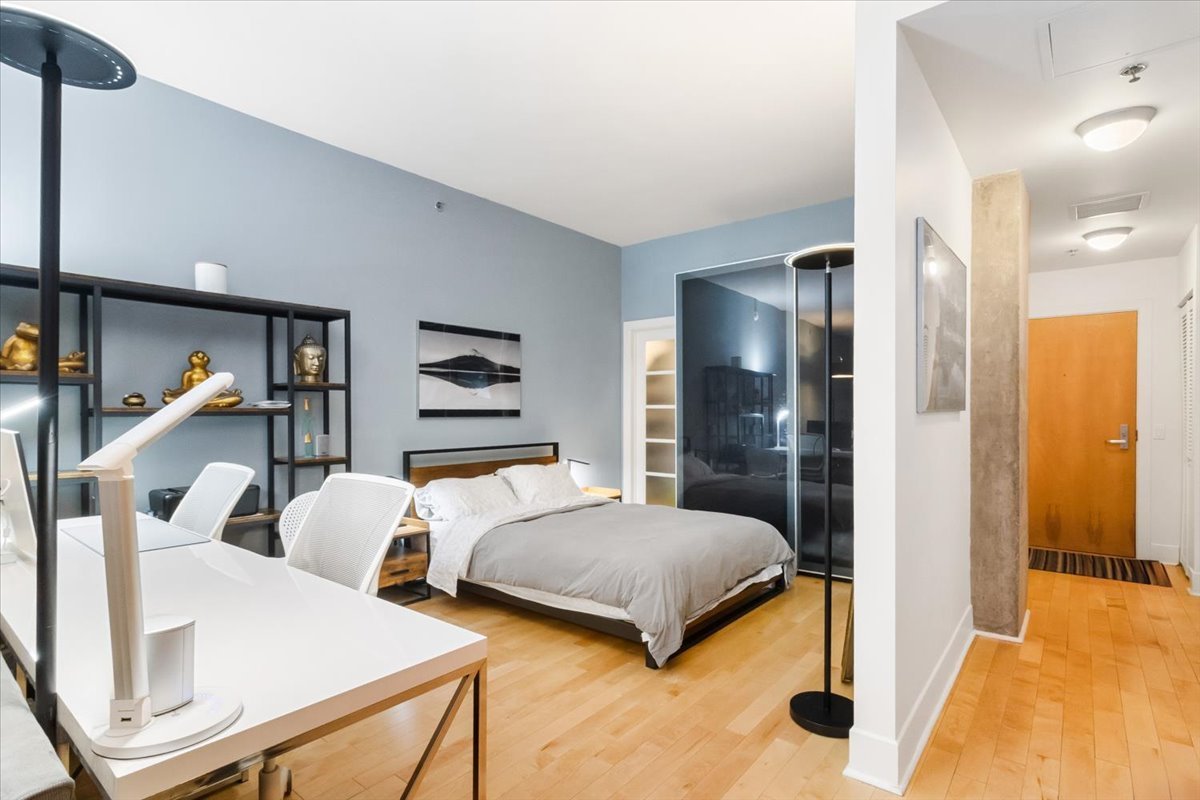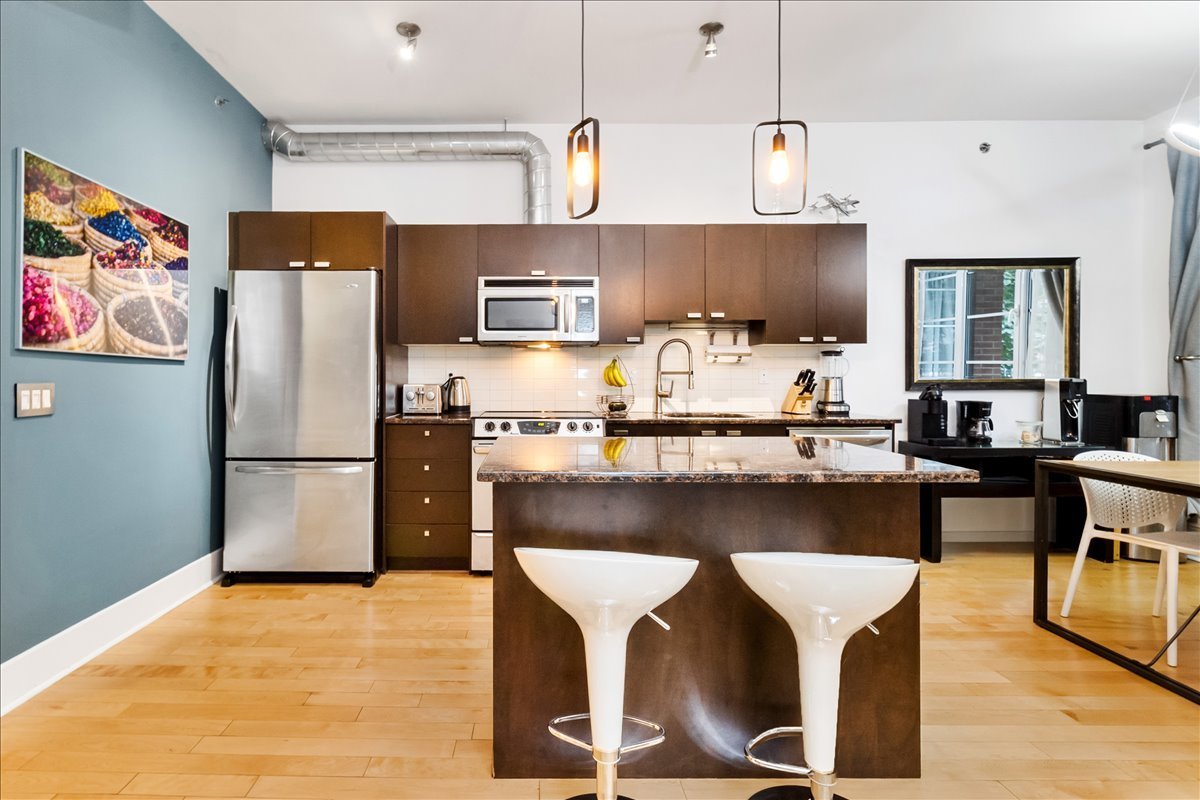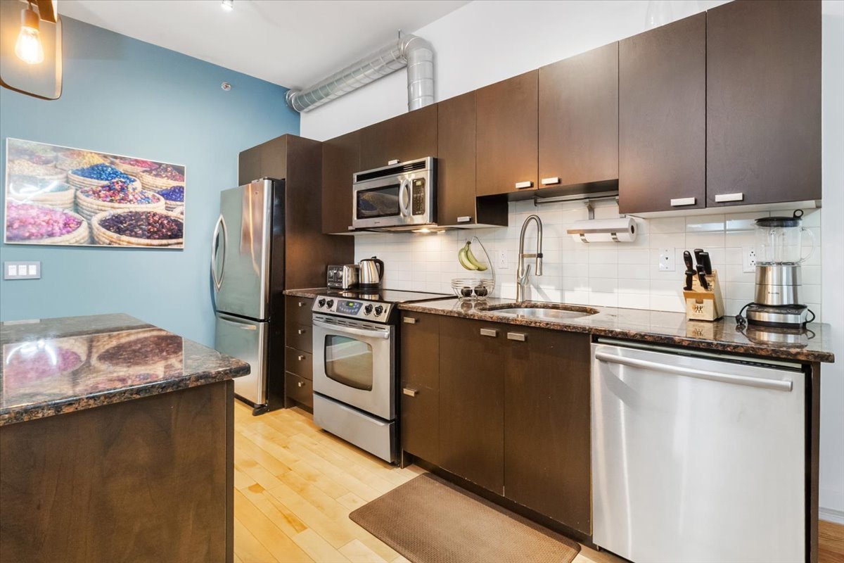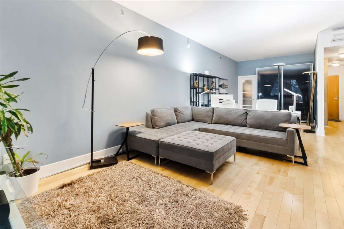QUAI DES ÉCLUSIERS phase 4 | Charmant condo, grande fenestration, plafonds béton 10 pieds, lattes de bois, espace de vie ouvert, cuisine urbaine, une chambre semi-fermée, climatiseur mural, terrasse privée et garage. Espaces communs: piscine intérieur chauffée, sauna, s/exercices, jardin commun, accès au canal et Kayaks.