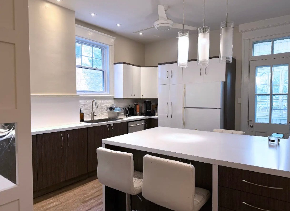 -- Cuisine spacieuse avec beaucoup d'armoires et surface de travail.