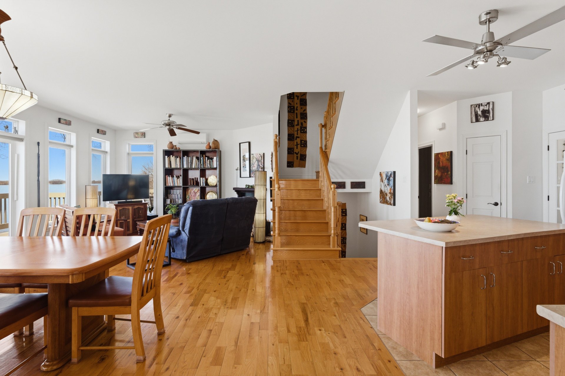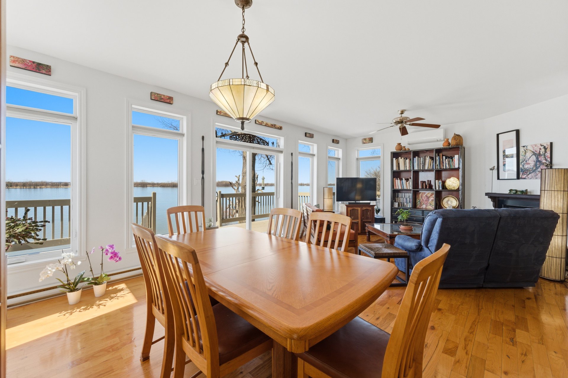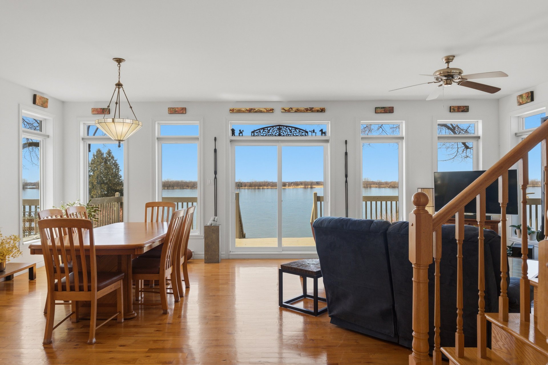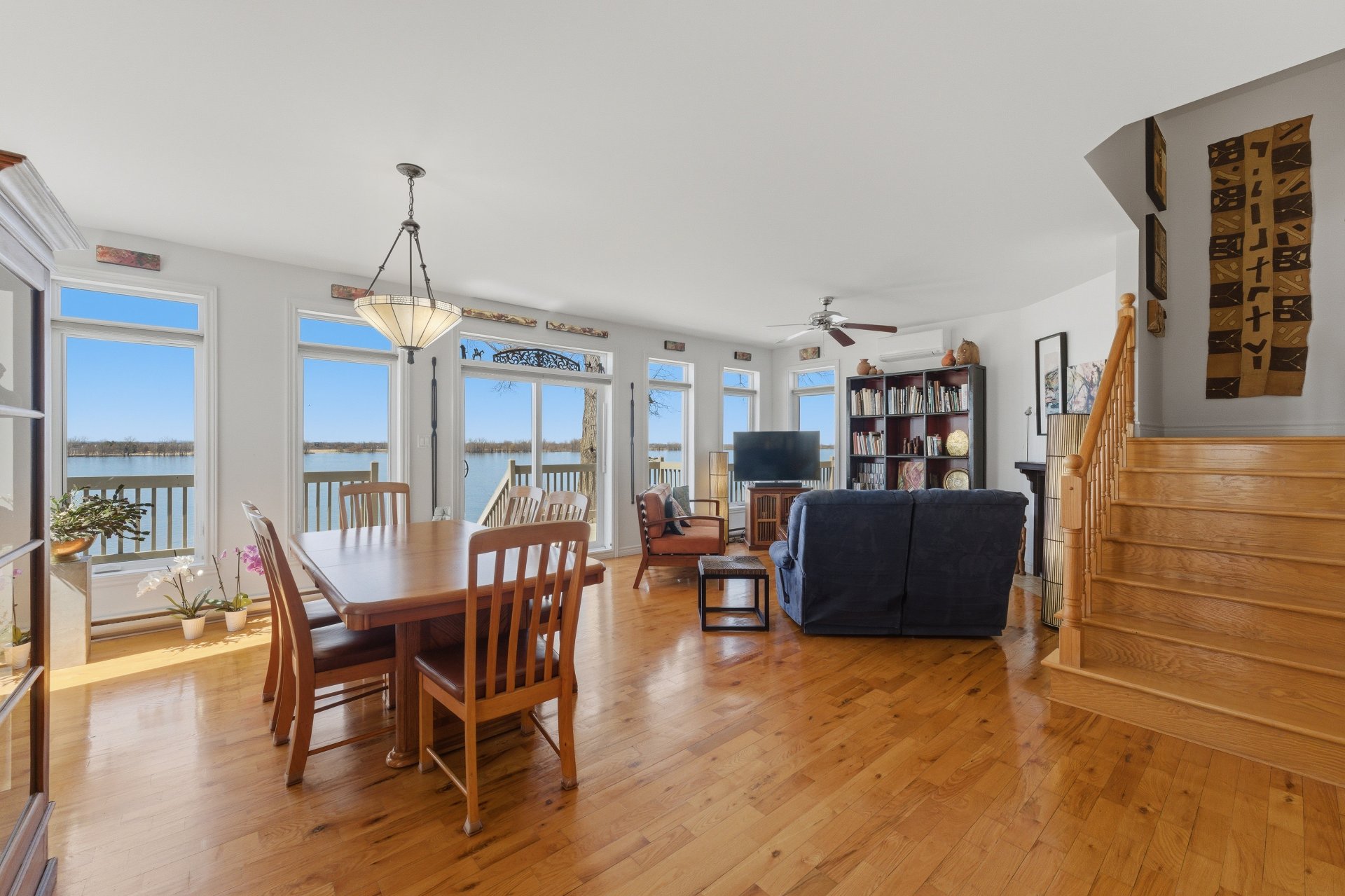 - Salle à manger et salon à aire ouverte, avec fenêtres sur 3 côtés, offrant un maximum de lumière naturelle ainsi qu'une vue panoramique sur le fleuve