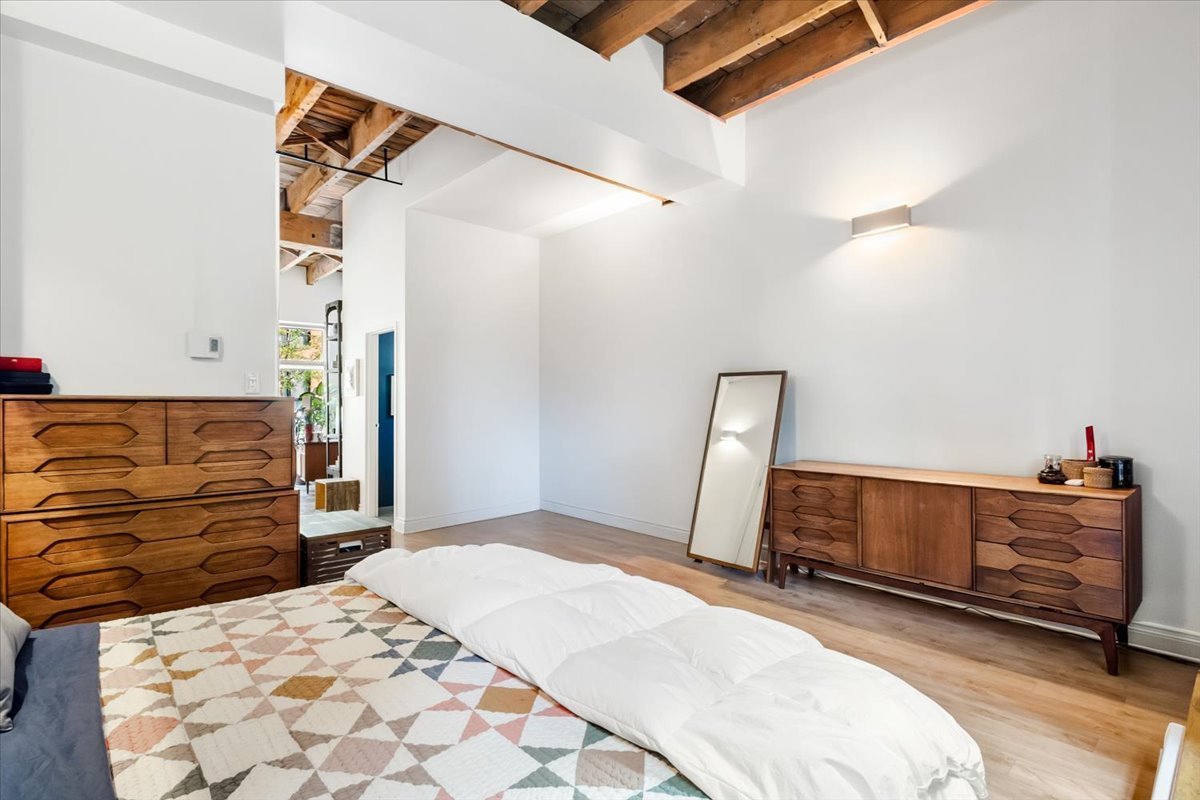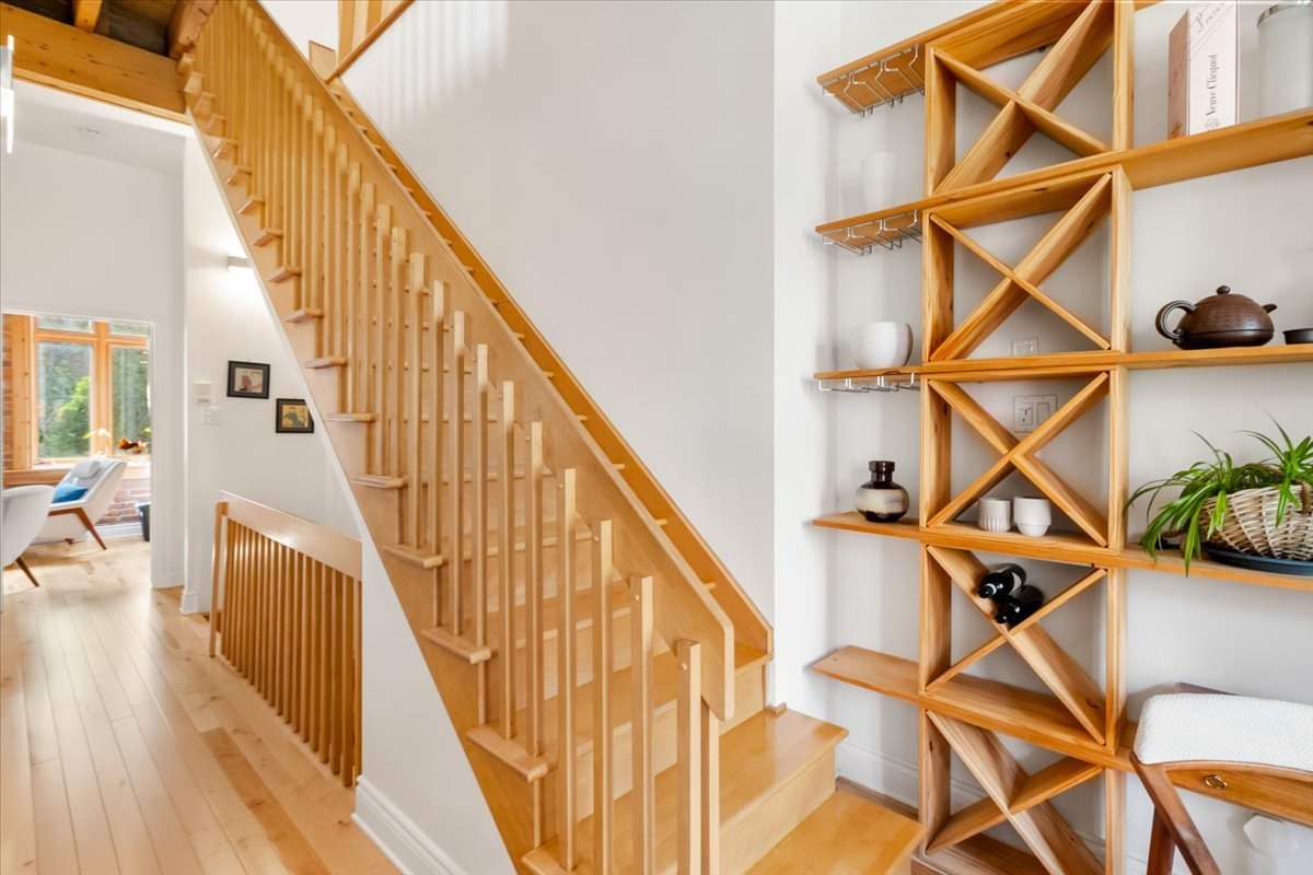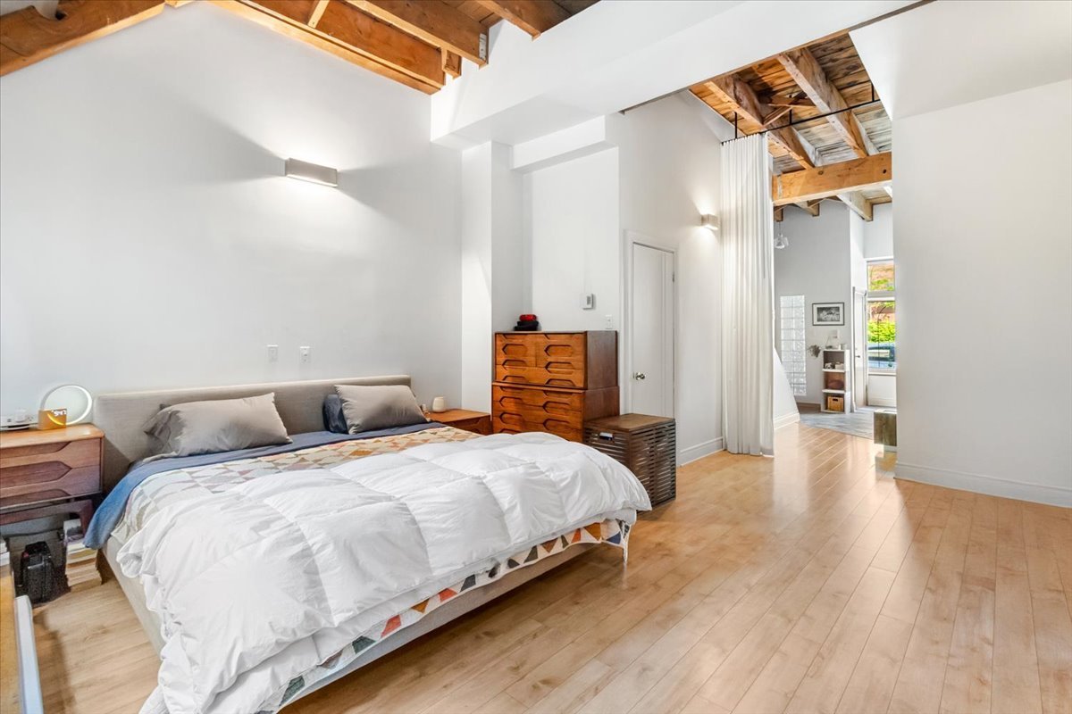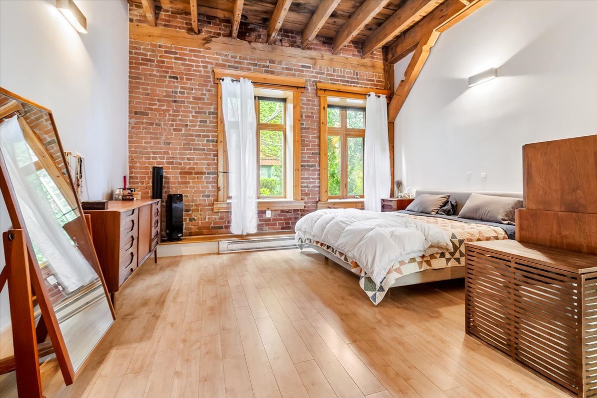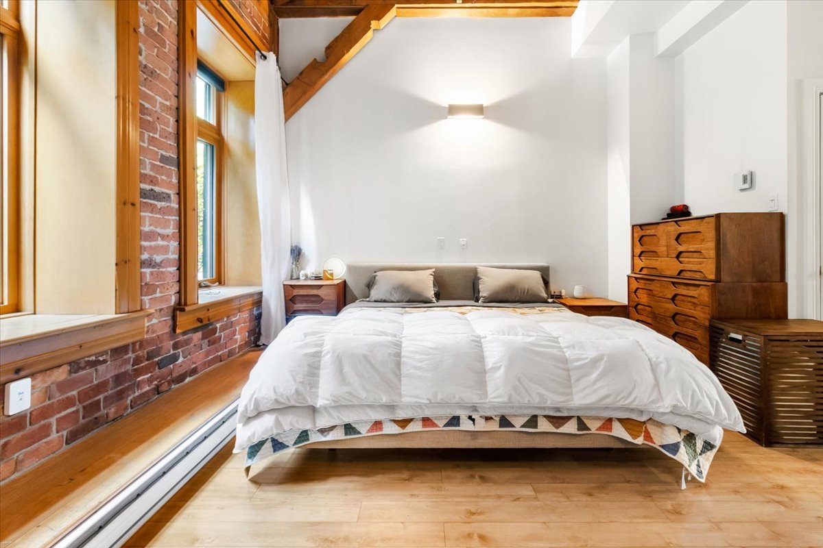 Architecture unique : plafonds cathédrale de 12 pi, poutres de bois apparentes, murs de briques exposés.