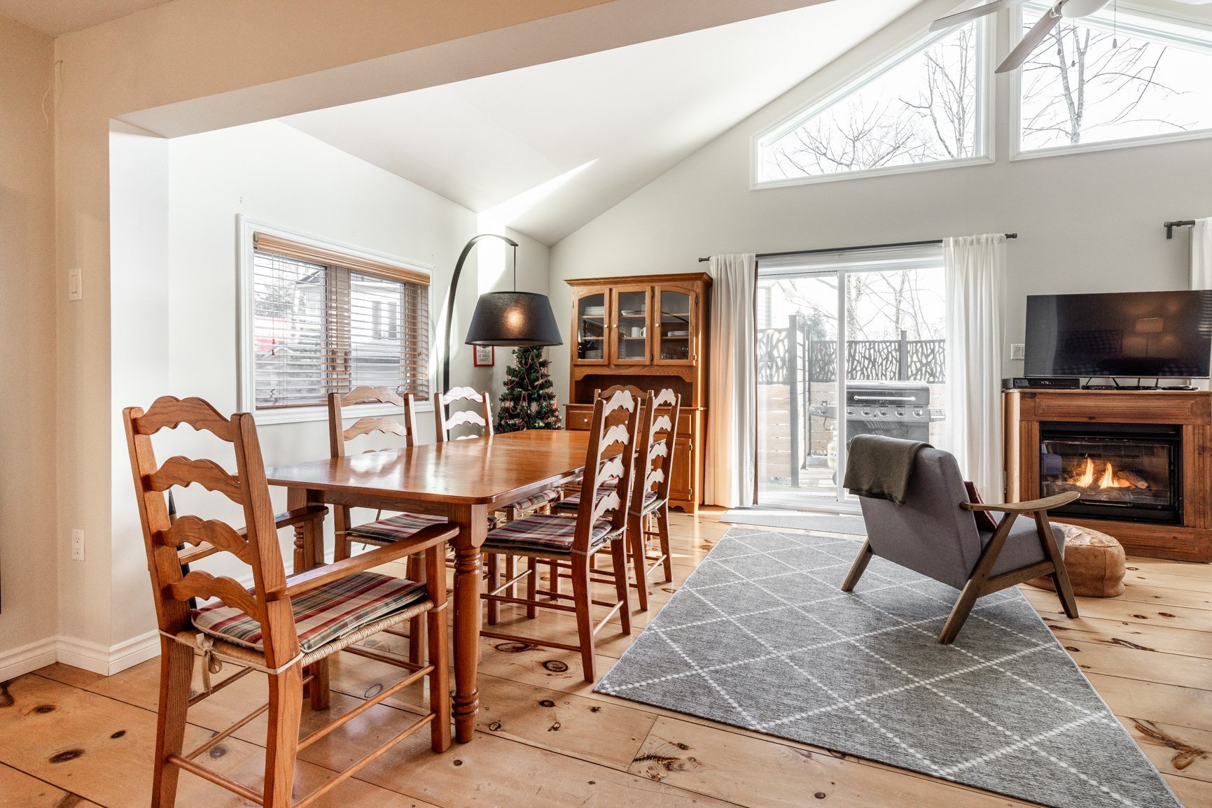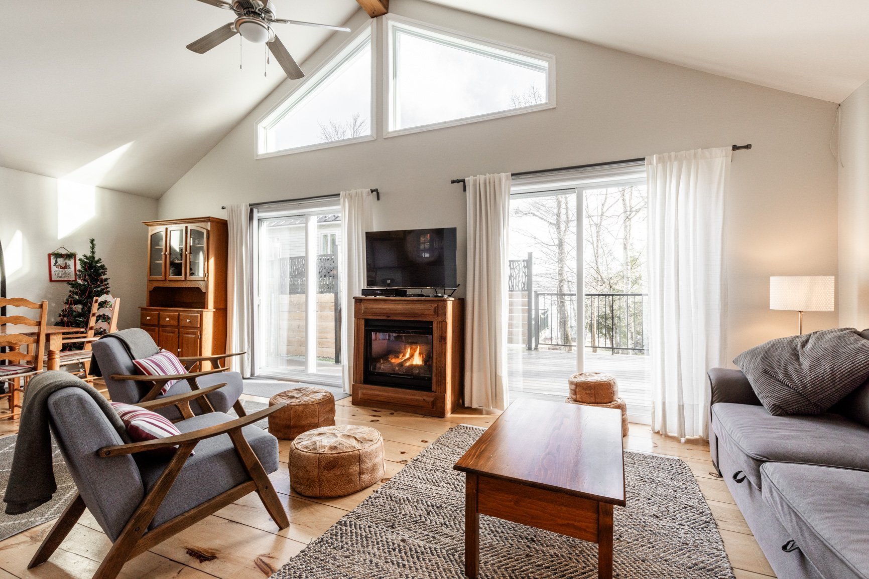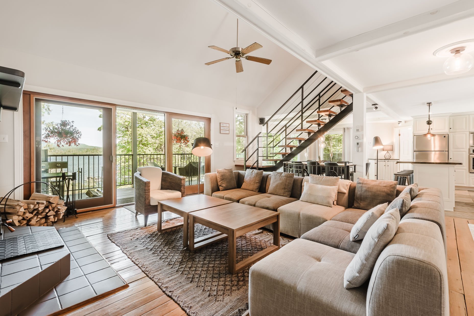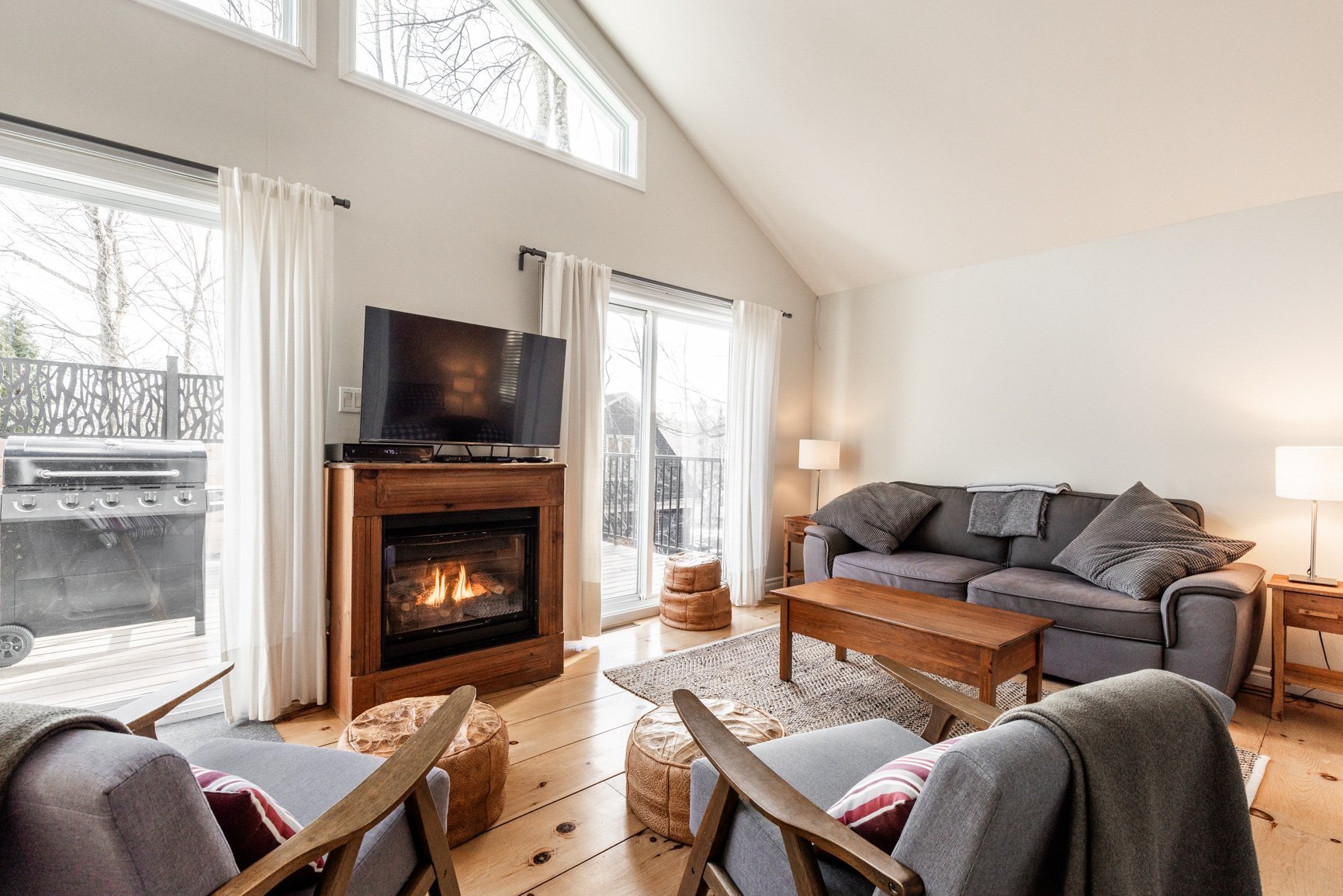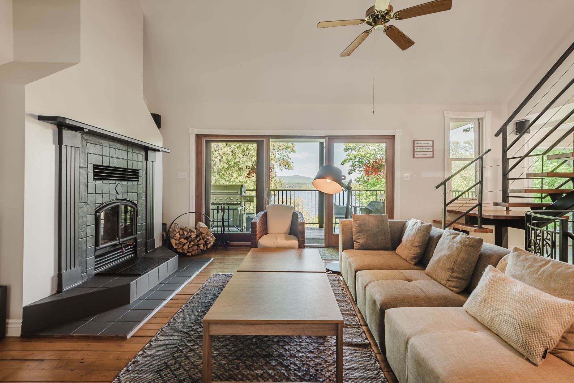 La maison d'invités (80) est quant à elle conviviale et chaleureuse avec ses planchers de pin. A plan ouvert, avec son foyer au gaz, l'environnement est agréable. On y a aussi une vue sur le lac et une belle terrasse. Munie de deux chambres, la maison est parfaite pour recevoir les amis en toute intimité ou pour un revenu additionnel (location).