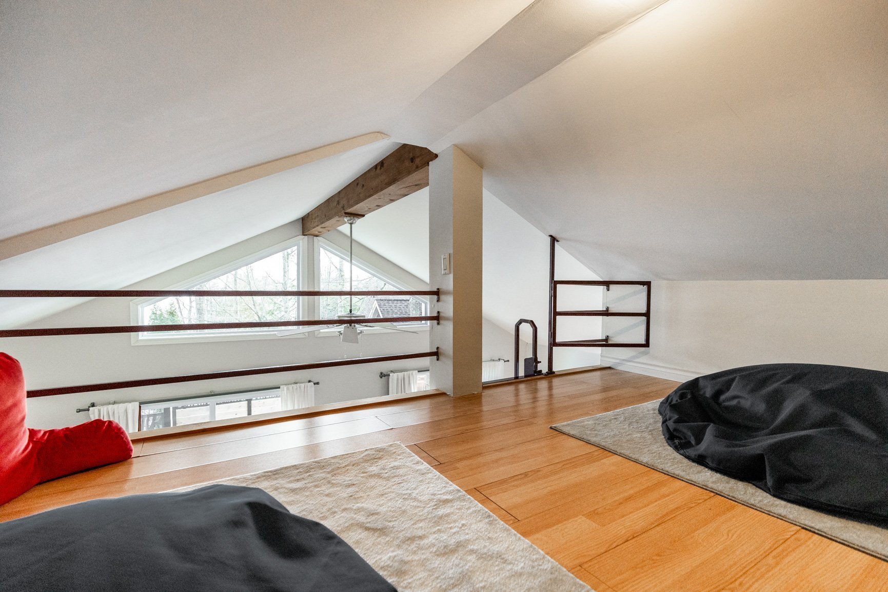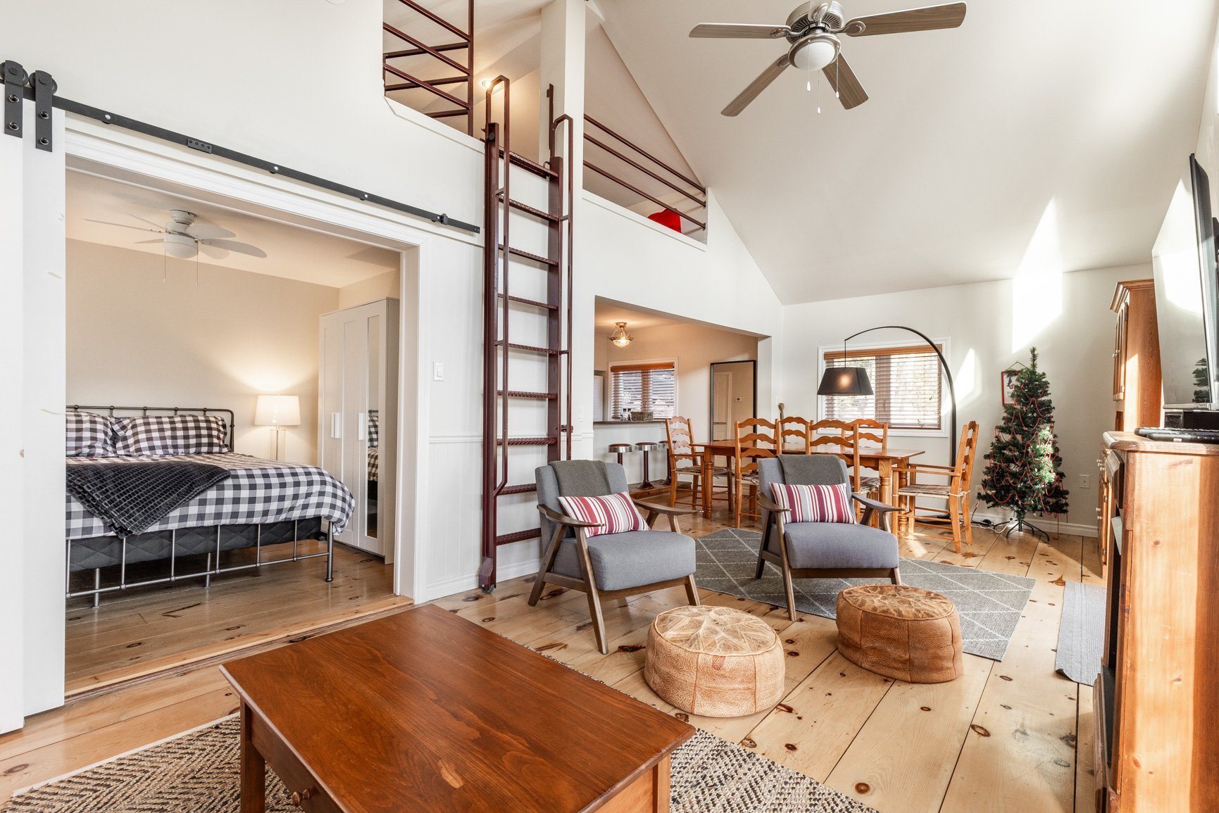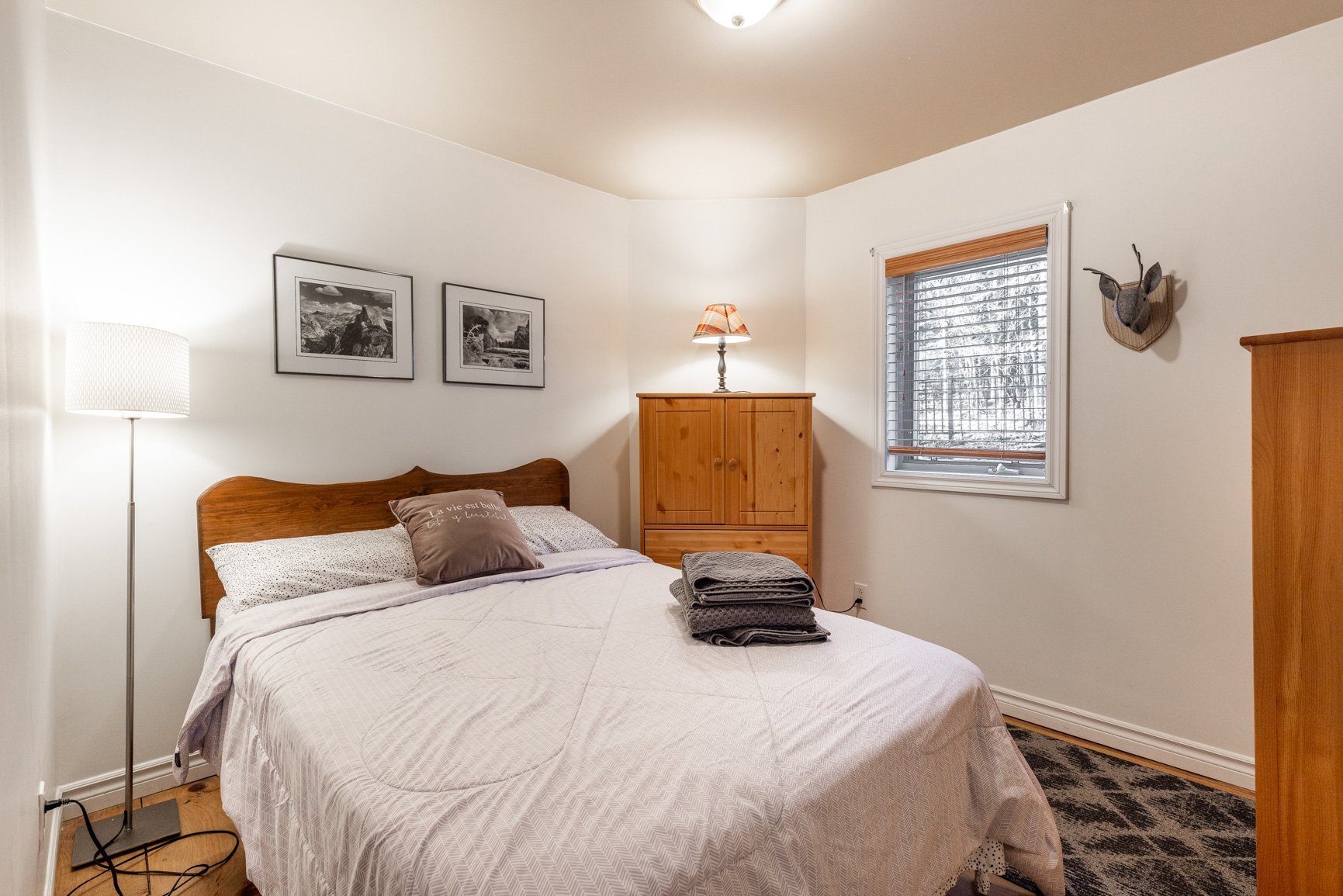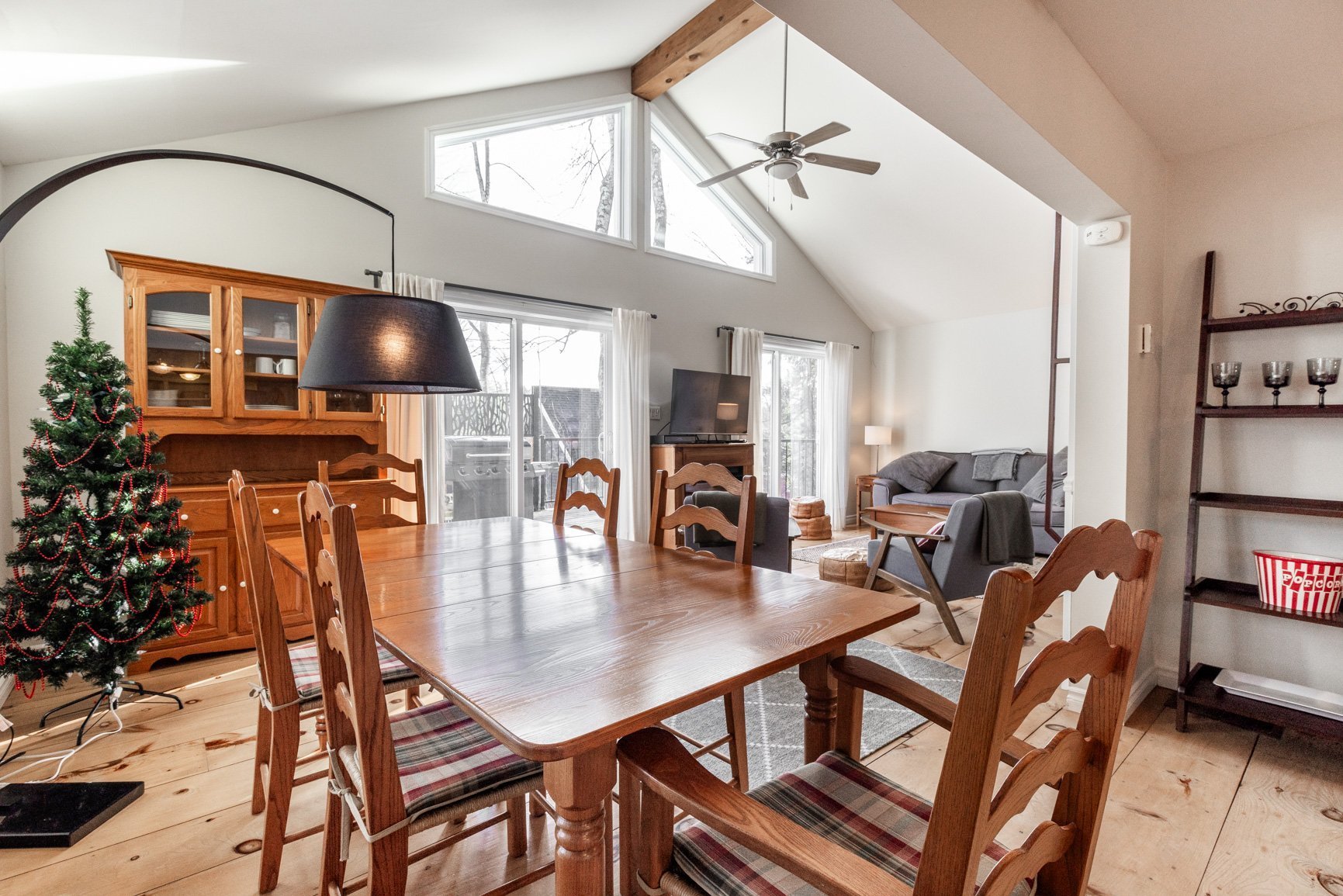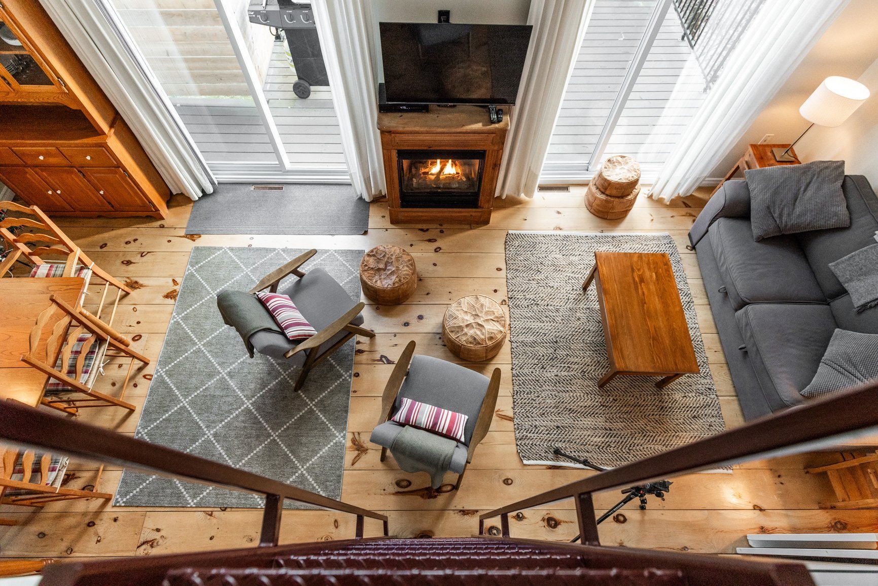 La maison d'invités (80) est quant à elle conviviale et chaleureuse avec ses planchers de pin. A plan ouvert, avec son foyer au gaz, l'environnement est agréable. On y a aussi une vue sur le lac et une belle terrasse. Munie de deux chambres, la maison est parfaite pour recevoir les amis en toute intimité ou pour un revenu additionnel (location).