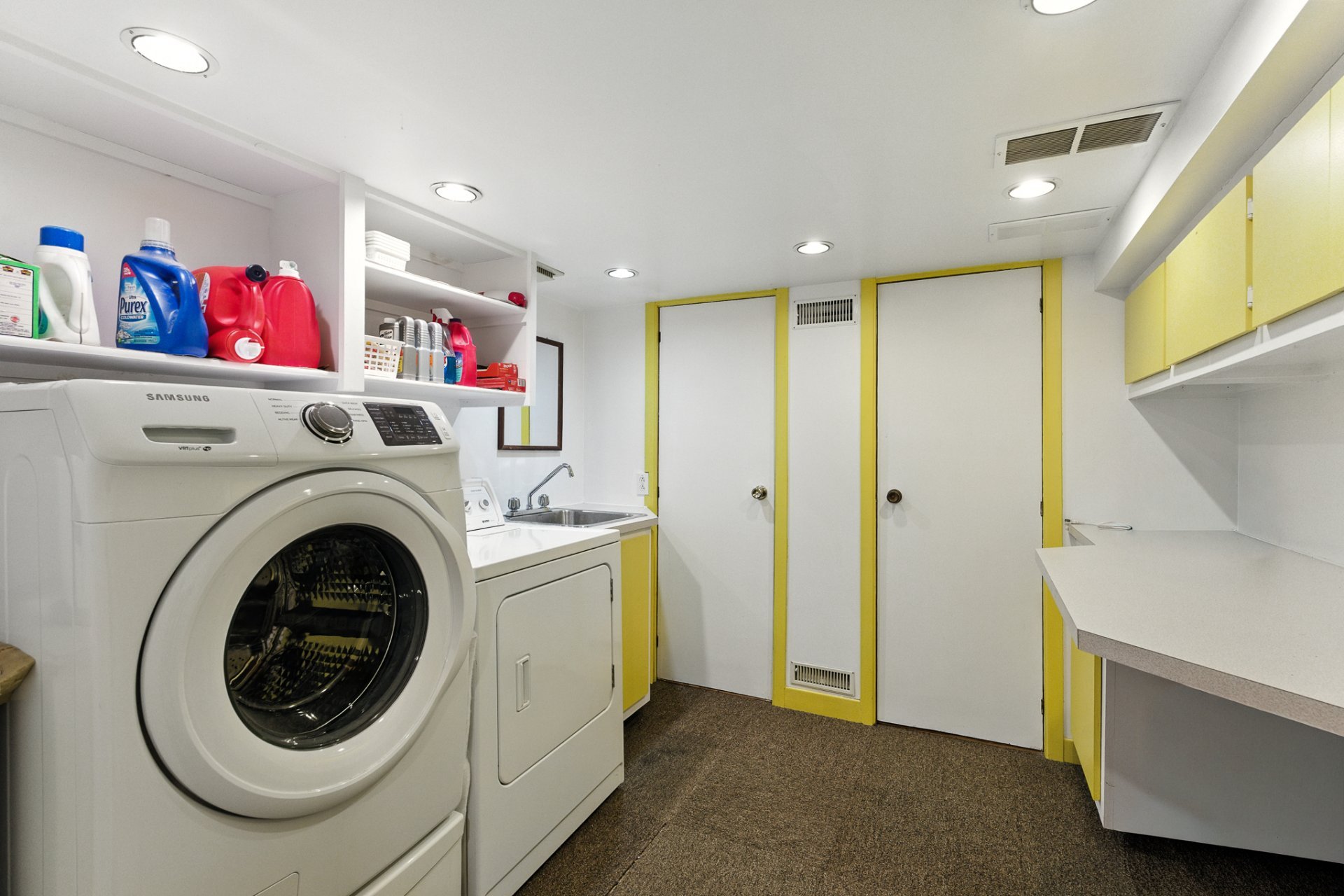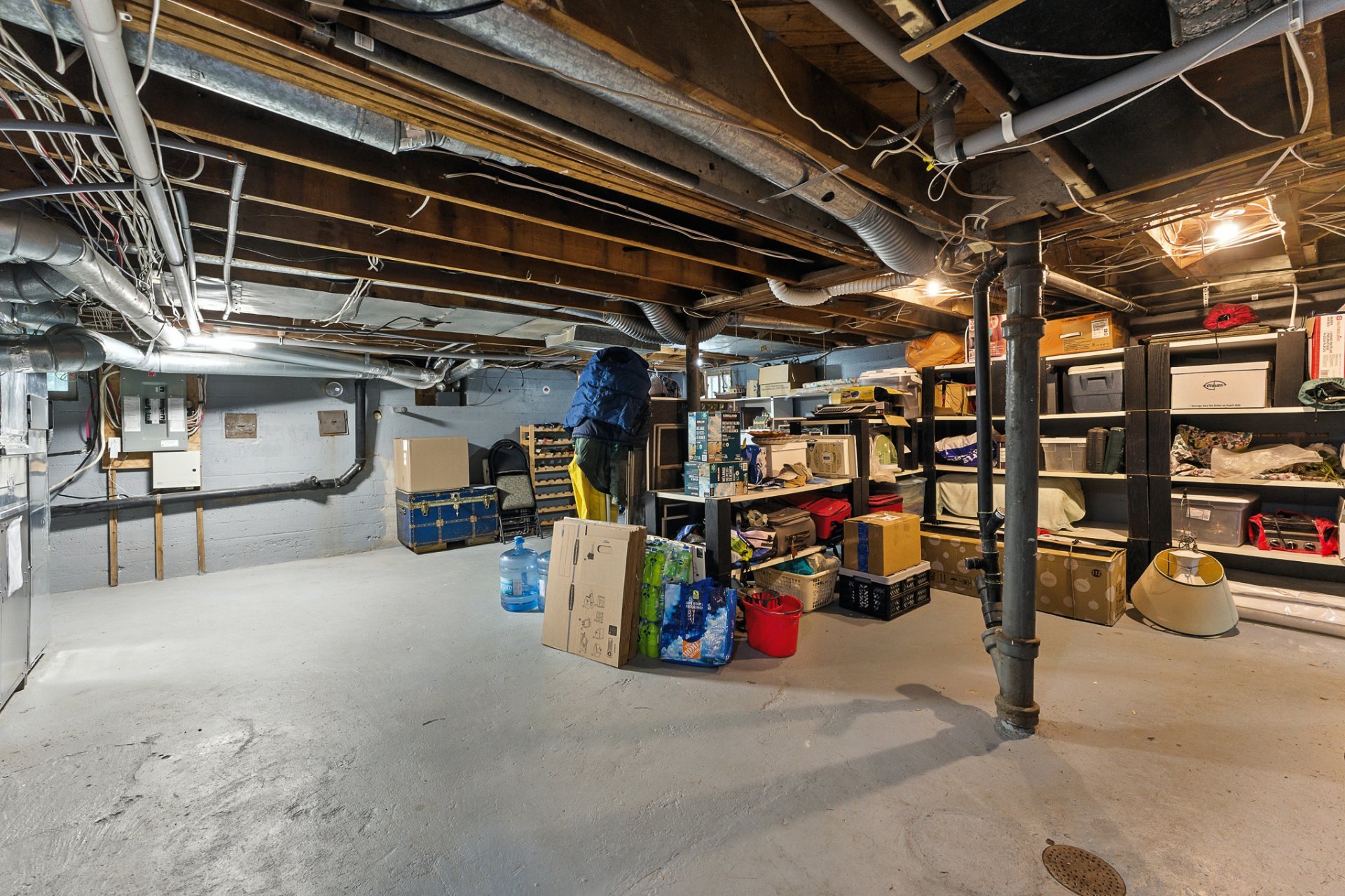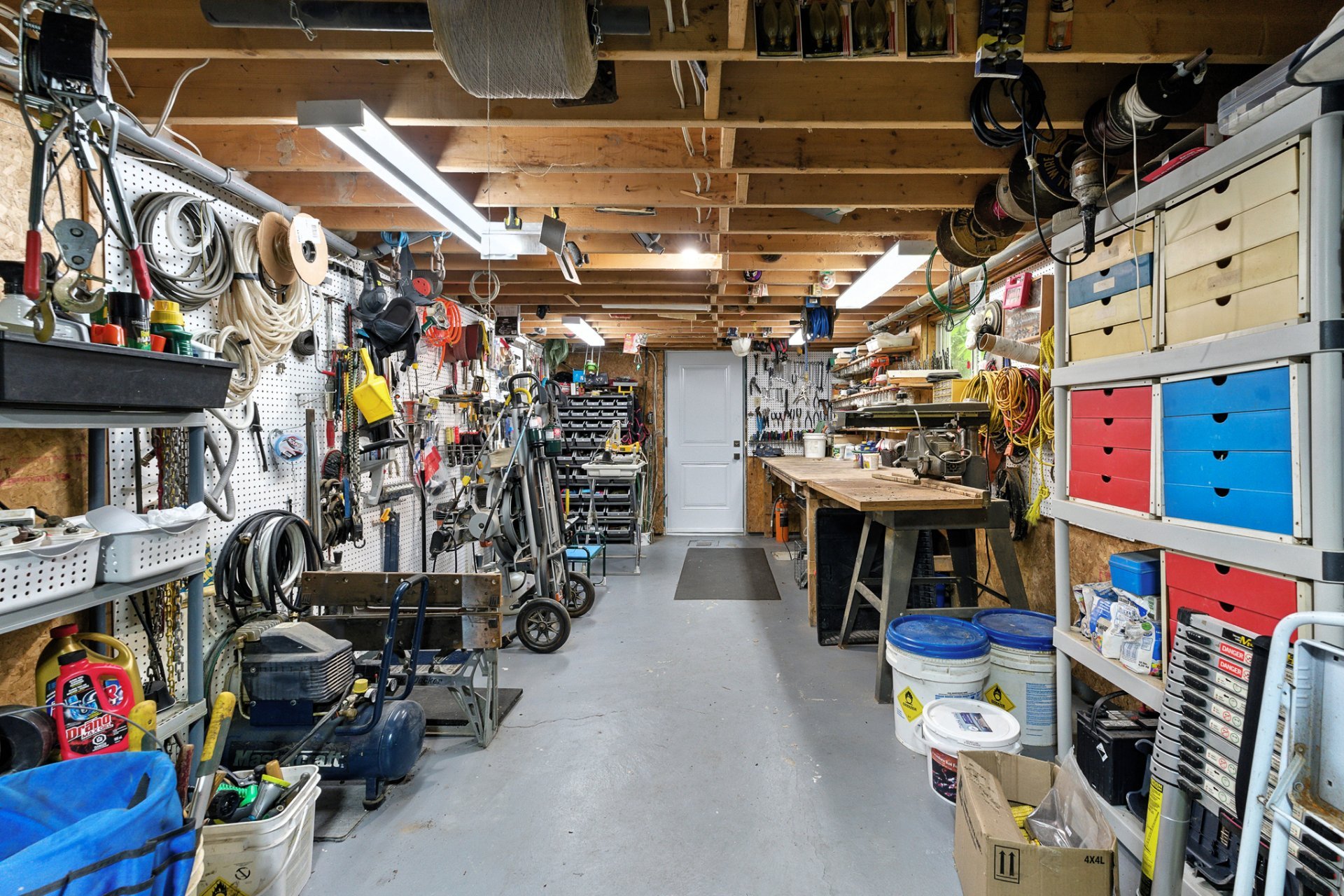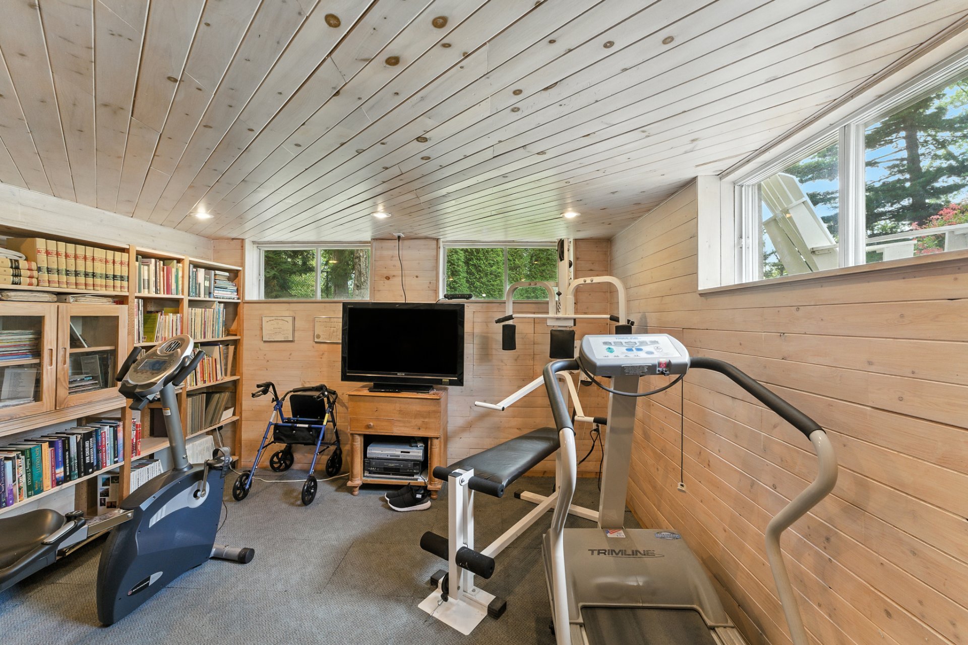Le sous-sol comprend une salle de lavage avec un placard en cèdre supplémentaire, une grande pièce de rangement non aménagée offrant de nombreuses possibilités, ainsi qu'une pièce spacieuse actuellement aménagée en gym, baignée de lumière grâce à une grande fenêtre, idéale pour un bureau à domicile. Un atelier avec entrée indépendante complète ce niveau, parfait pour les projets, les loisirs ou un accès pratique.