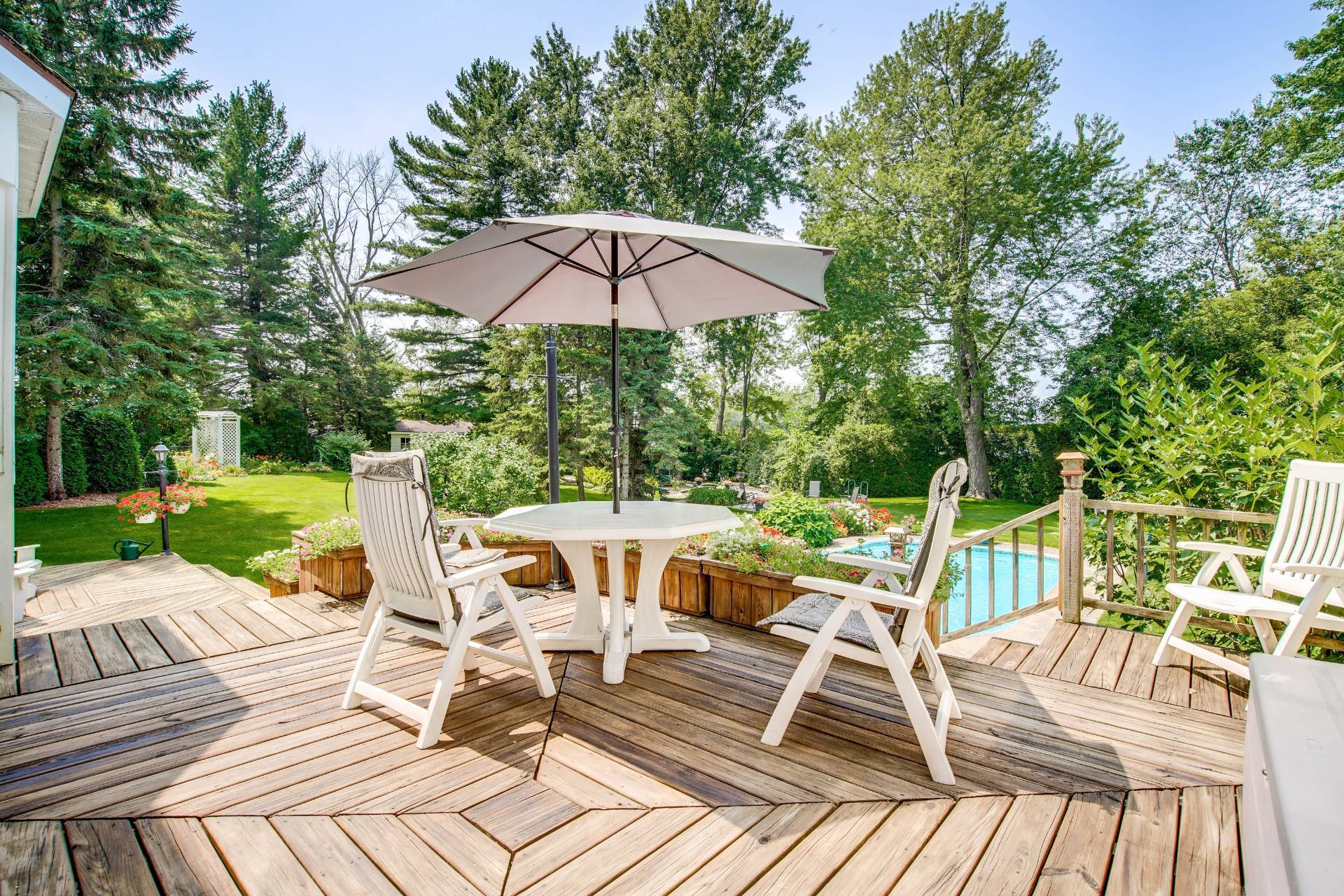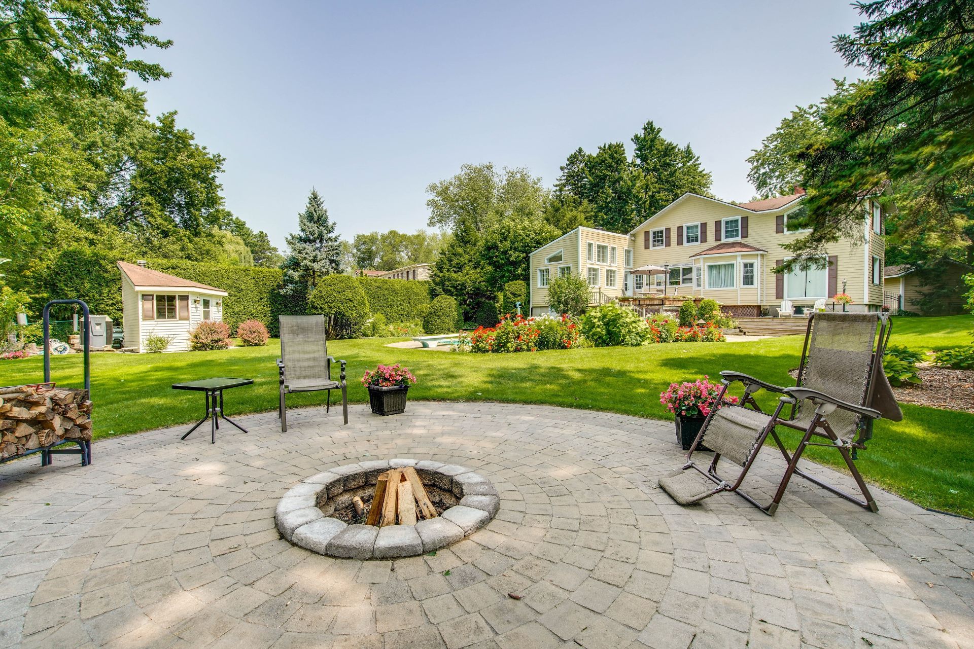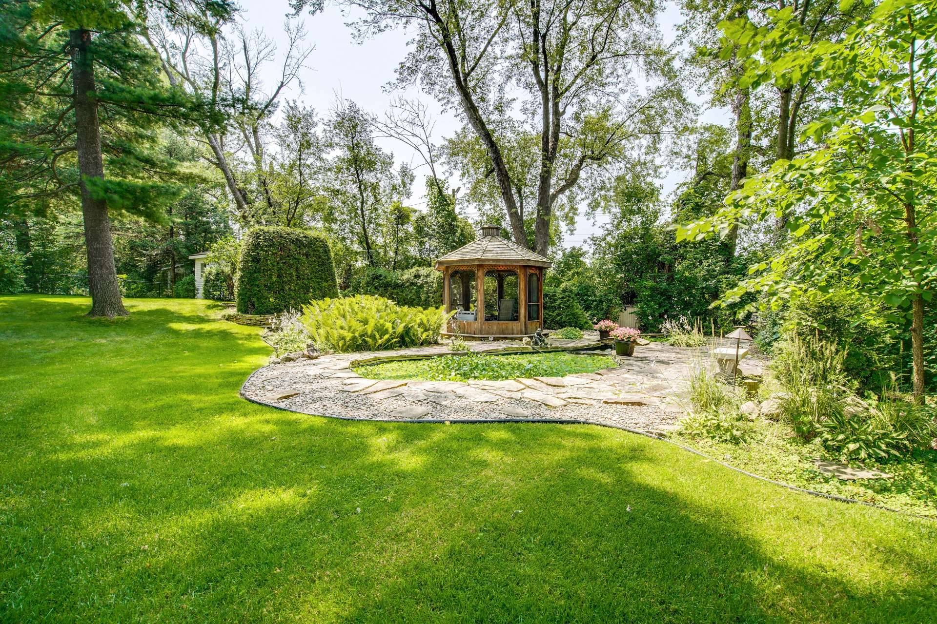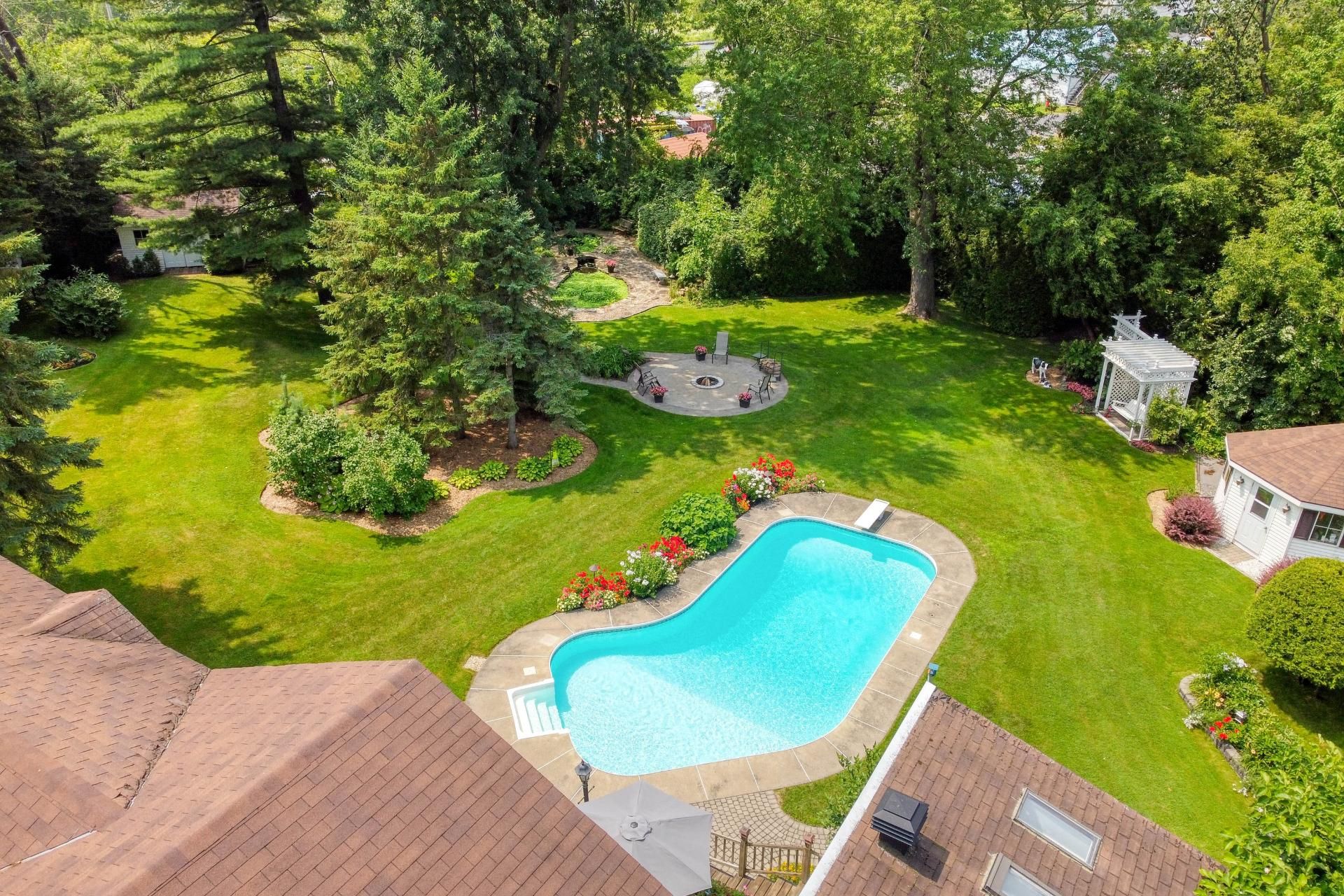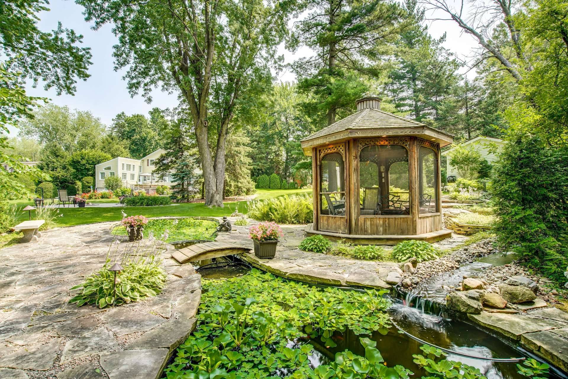 La cour arrière magnifiquement aménagée est un véritable havre de paix, offrant plusieurs terrasses pour vos repas et moments de détente, un espace foyer idéal pour les soirées entre amis, ainsi qu'un étang splendide avec un joli gazebo, créant une ambiance des plus apaisantes. Avec sa piscine creusée, ses arbres matures et aucun voisin à l'arrière, cet espace extérieur exceptionnel est parfait pour recevoir, se détendre ou profiter des belles soirées d'été.