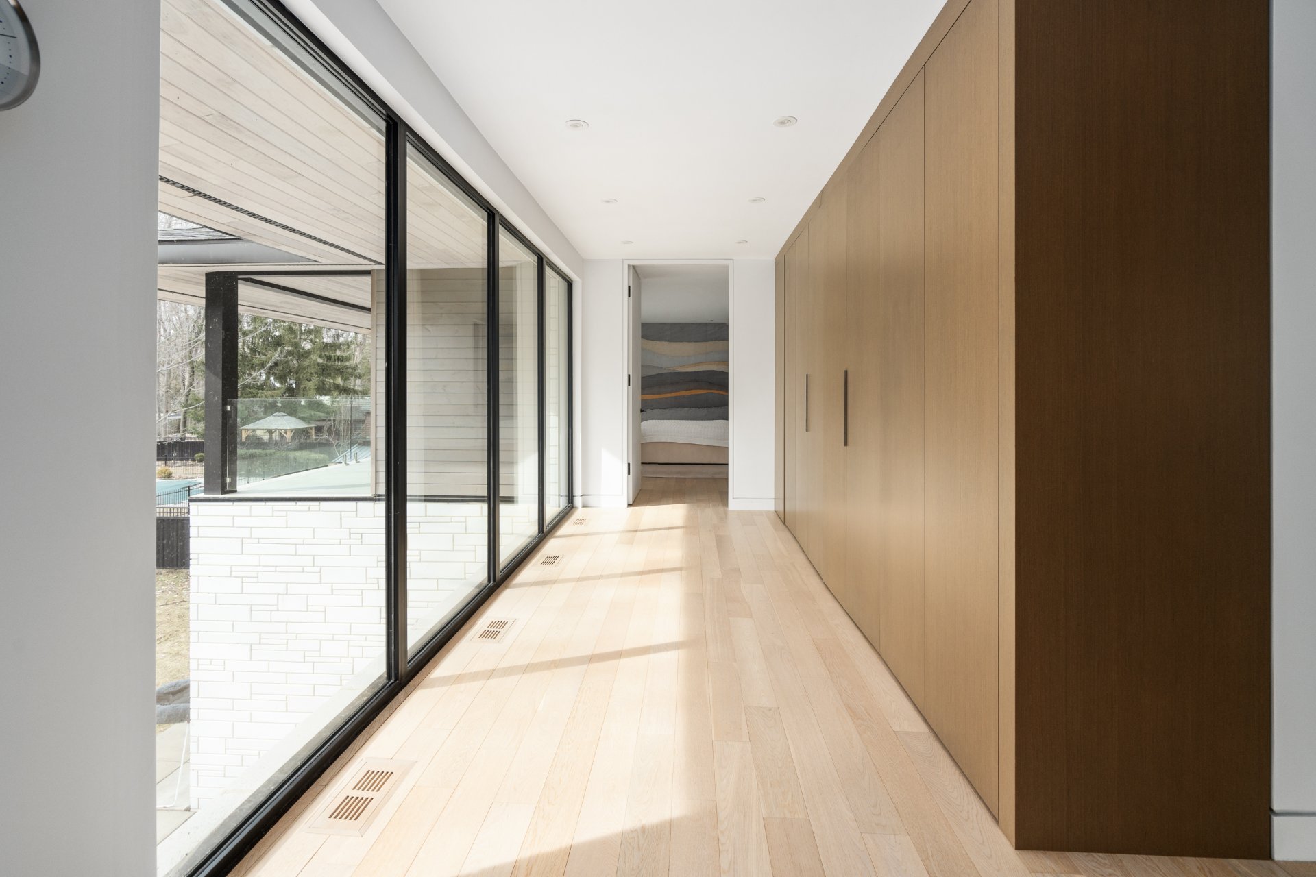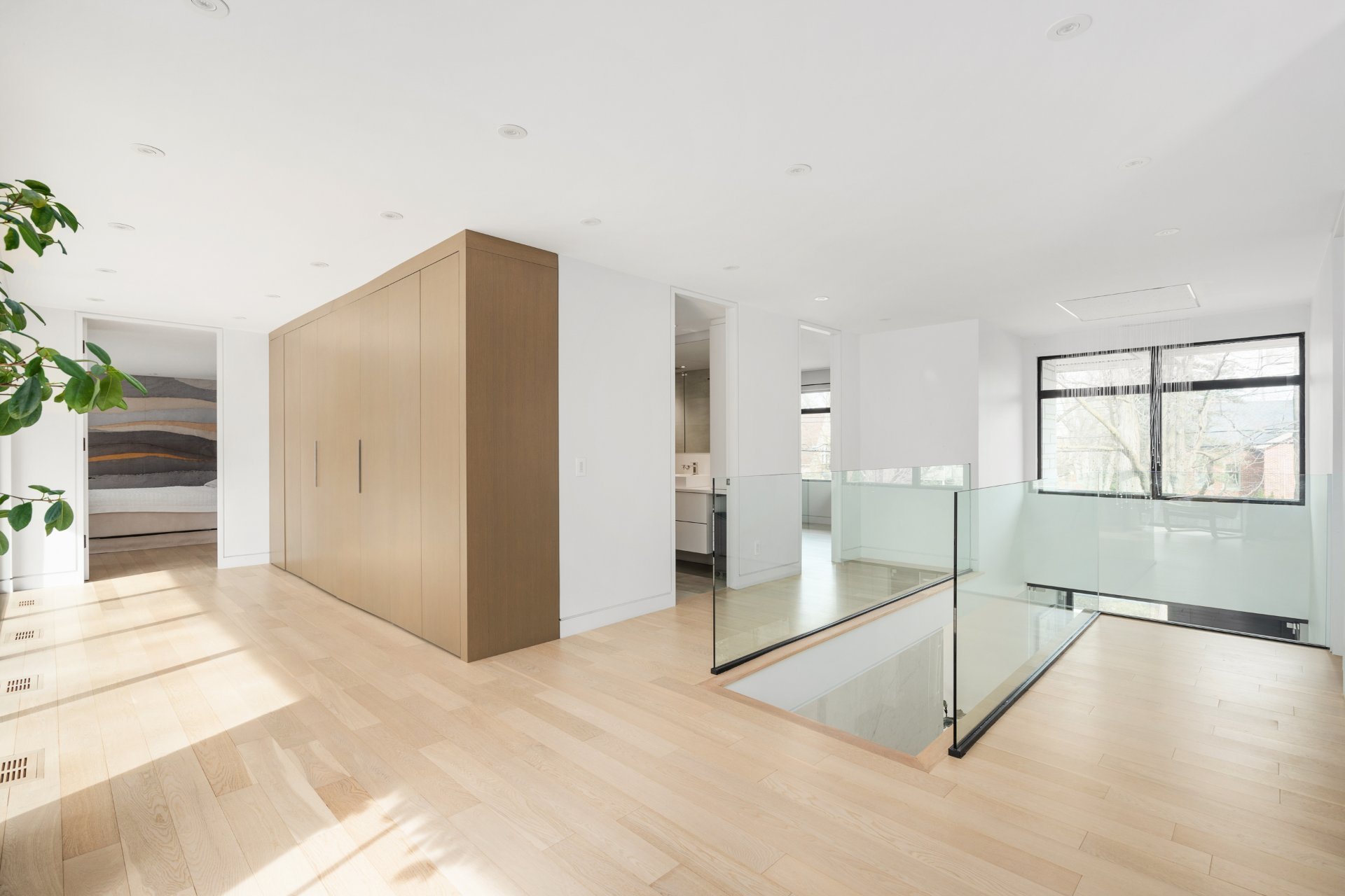 Le niveau supérieur de la maison offre des chambres spacieuses, dont deux avec des zones de chauffage indépendantes et des postes de travail intégrés personnalisés. Un hall d'entrée mène à la généreuse suite parentale, dotée d'un balcon extérieur couvert surplombant le terrain et d'une salle de bains attenante de type spa avec douche double et baignoire de type soaker.