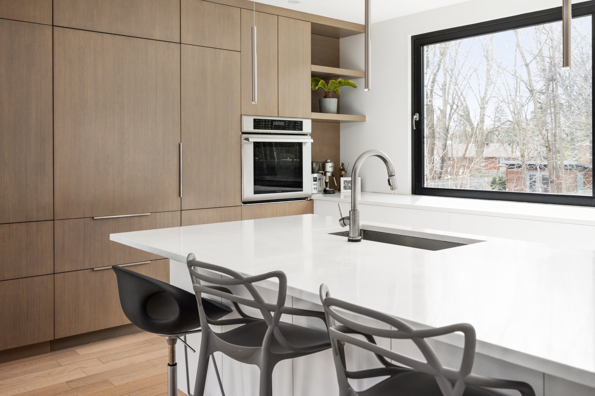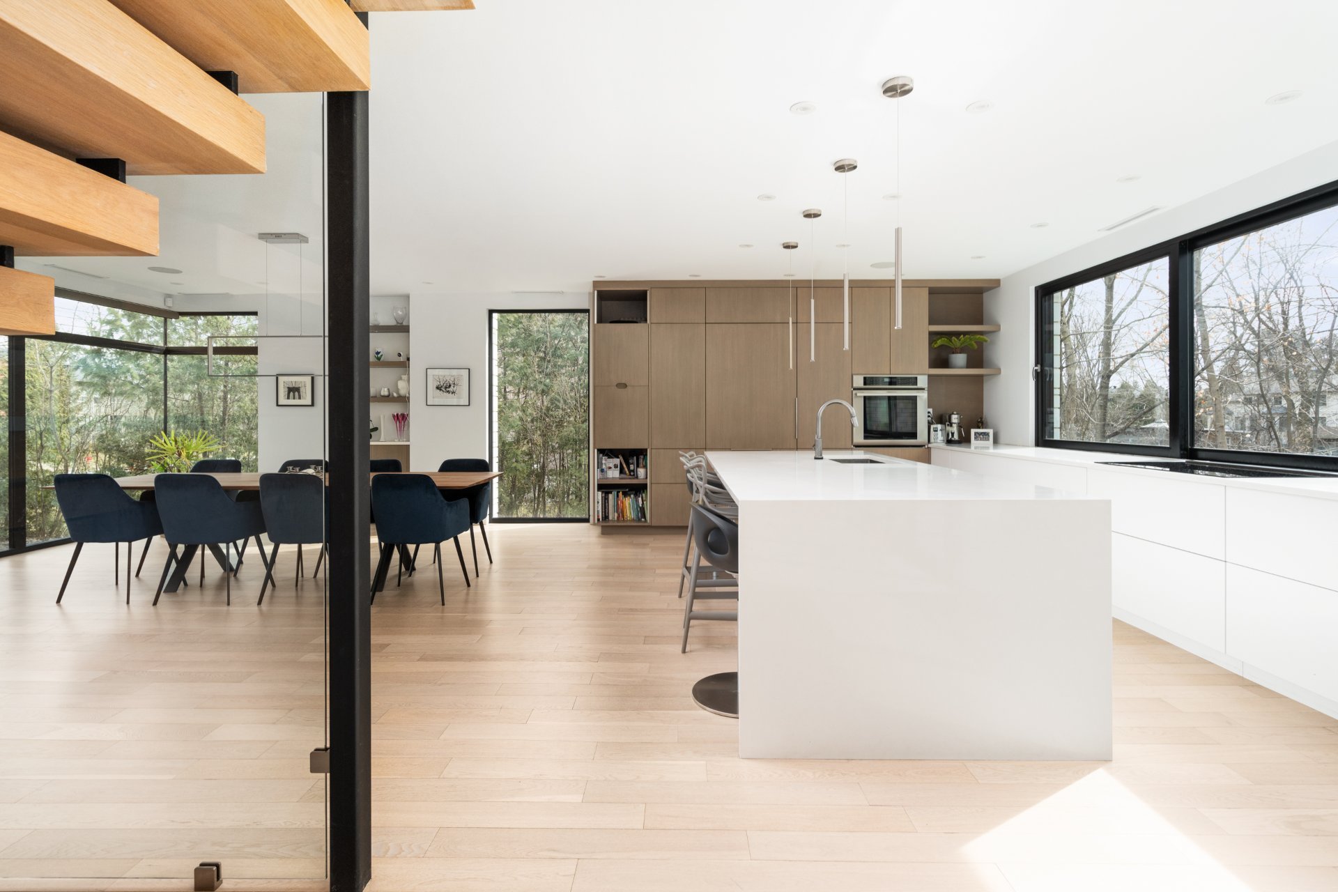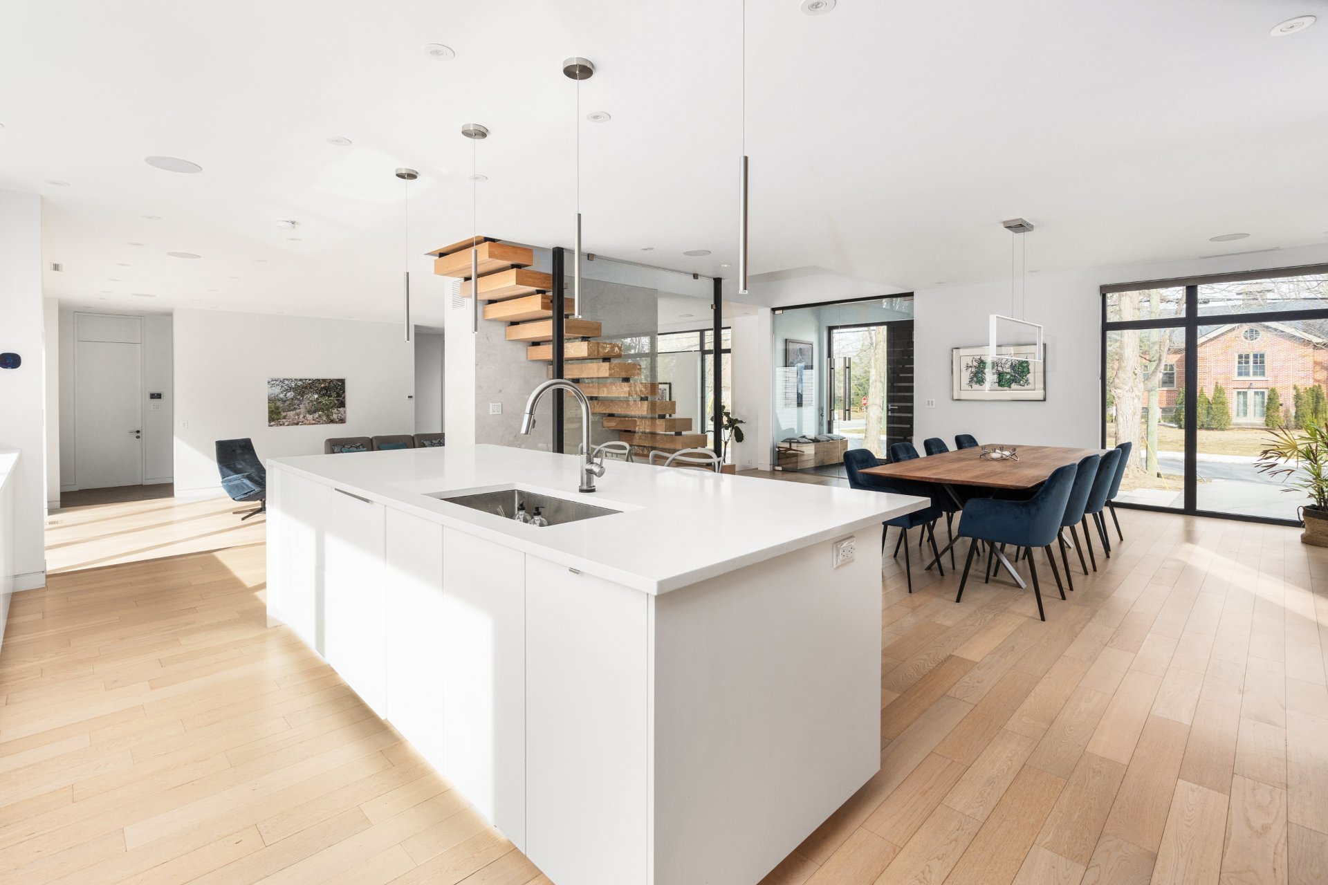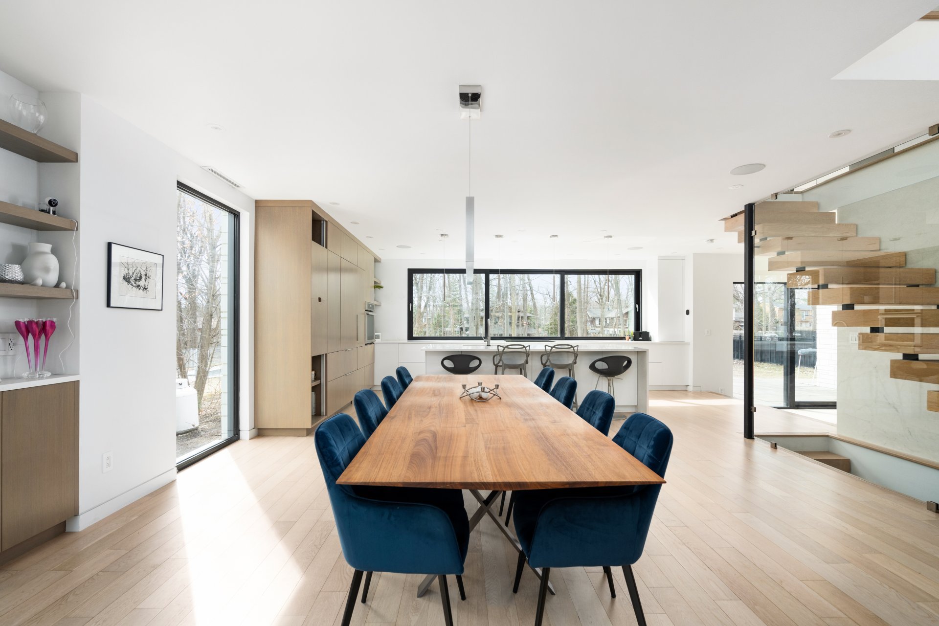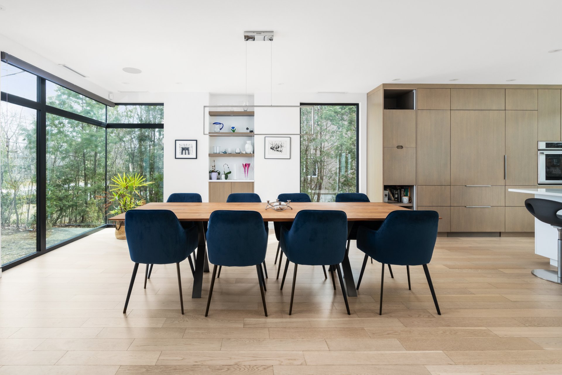 Le coeur de la maison se trouve dans la cuisine design. Elle est équipée de comptoirs en quartz, d'appareils électroménagers haut de gamme, d'un grand îlot central et de nombreuses places assises. Une fenêtre coulissante de 15 pieds s'ouvre sur la salle à manger du patio arrière, créant un flux continu pour les repas en plein air et les réceptions. La cuisine se prolonge par la salle à manger formelle, dotée d'éléments encastrés sur mesure et de grandes fenêtres qui baignent l'espace de lumière naturelle.