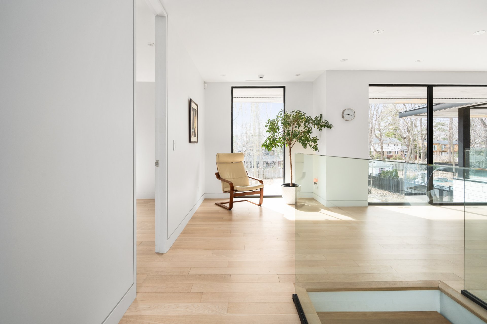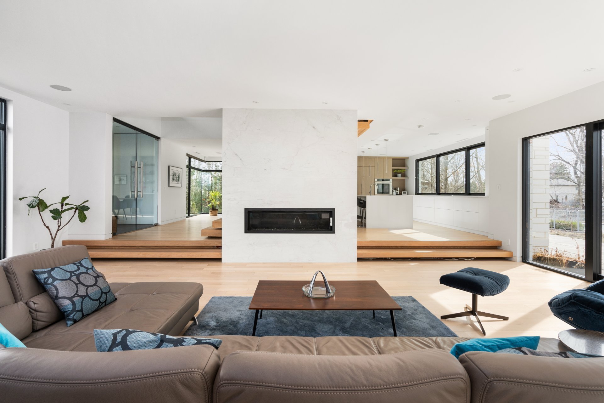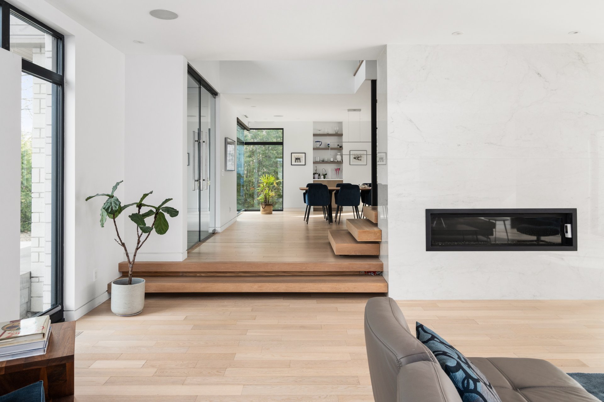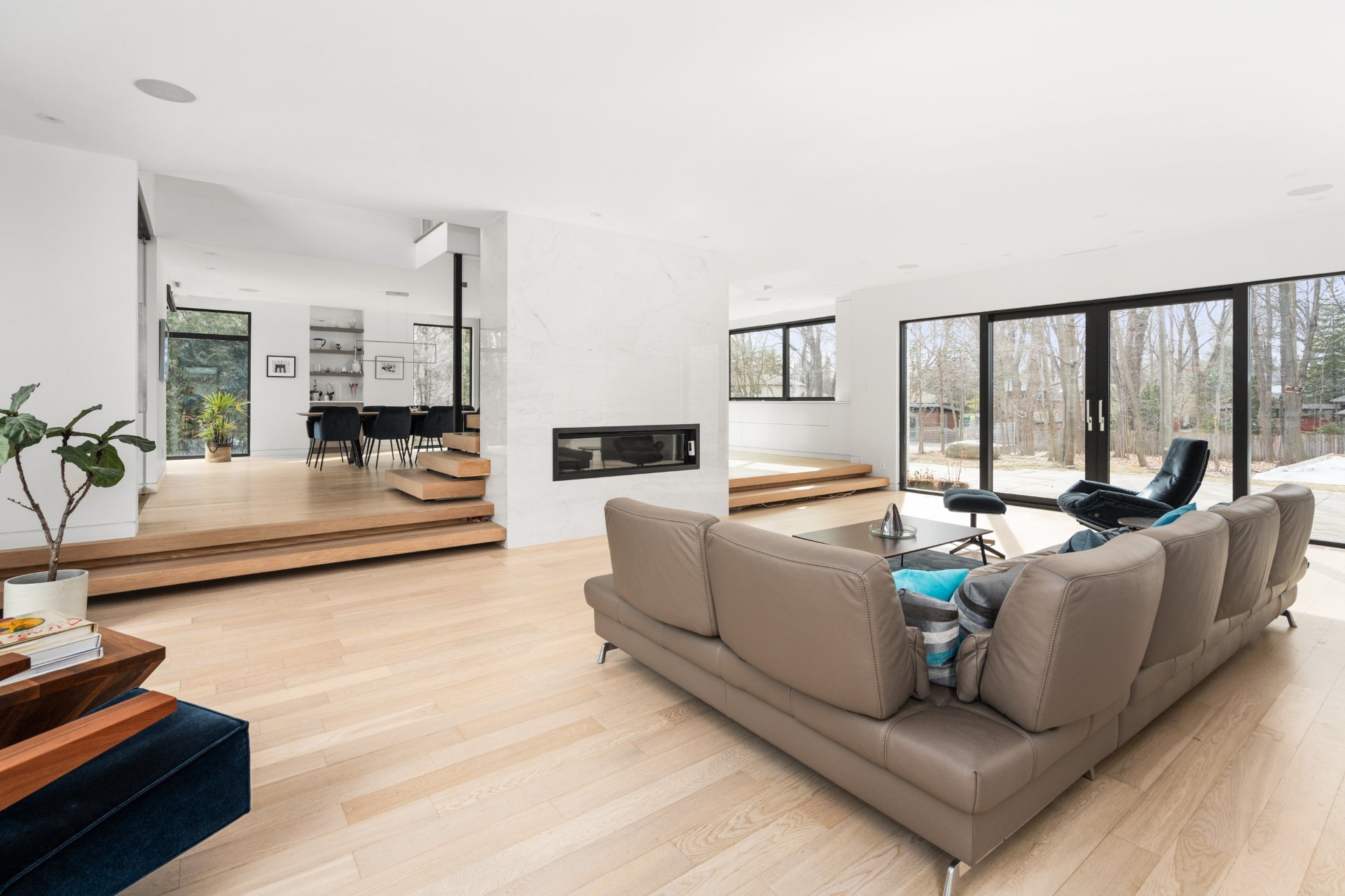 Dès l'entrée, vous êtes accueilli par un vestibule formel, avec des doubles portes vitrées qui mènent aux pièces spacieuses et aérées qui définissent le rez-de-chaussée. La grande salle, avec ses planchers de bois et ses plafonds vertigineux de plus de deux mètres, est éclairée par un mur complet de fenêtres et de portes-fenêtres qui intègrent harmonieusement la vie intérieure et extérieure. Une cheminée au gaz au centre de la grande salle ajoute chaleur et élégance à cet espace accueillant.