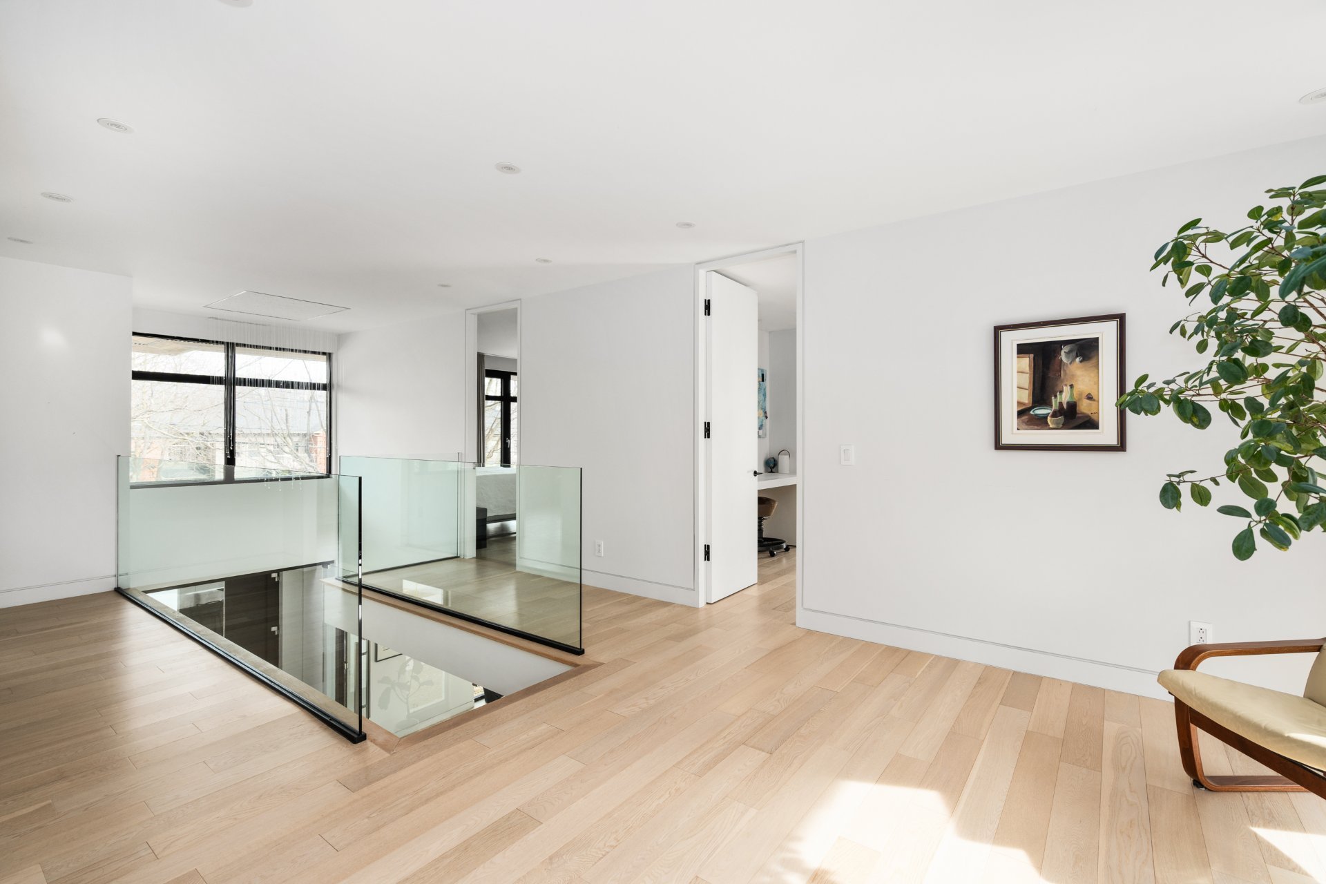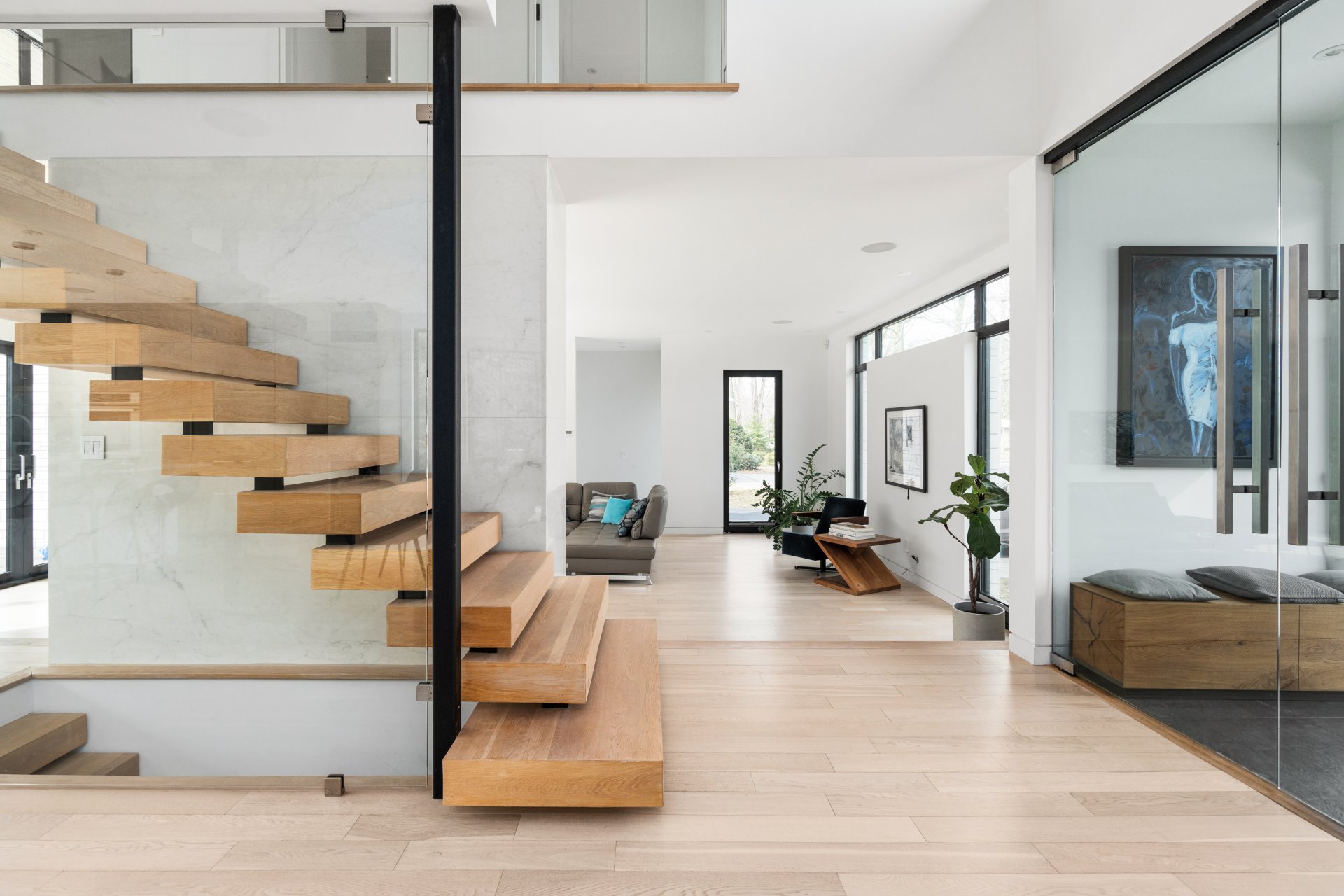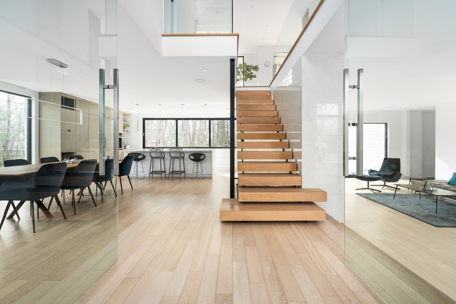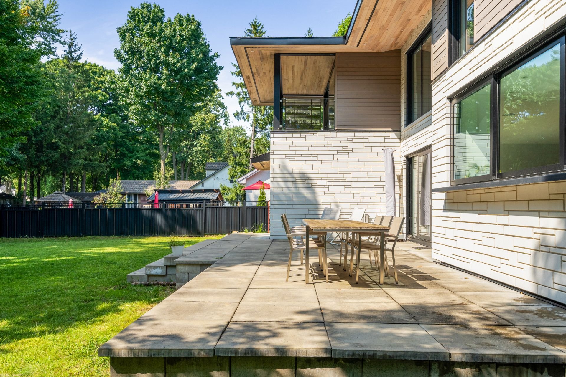 Dès l'entrée, vous êtes accueilli par un vestibule formel, avec des doubles portes vitrées qui mènent aux pièces spacieuses et aérées qui définissent le rez-de-chaussée. La grande salle, avec ses planchers de bois et ses plafonds vertigineux de plus de deux mètres, est éclairée par un mur complet de fenêtres et de portes-fenêtres qui intègrent harmonieusement la vie intérieure et extérieure. Une cheminée au gaz au centre de la grande salle ajoute chaleur et élégance à cet espace accueillant.