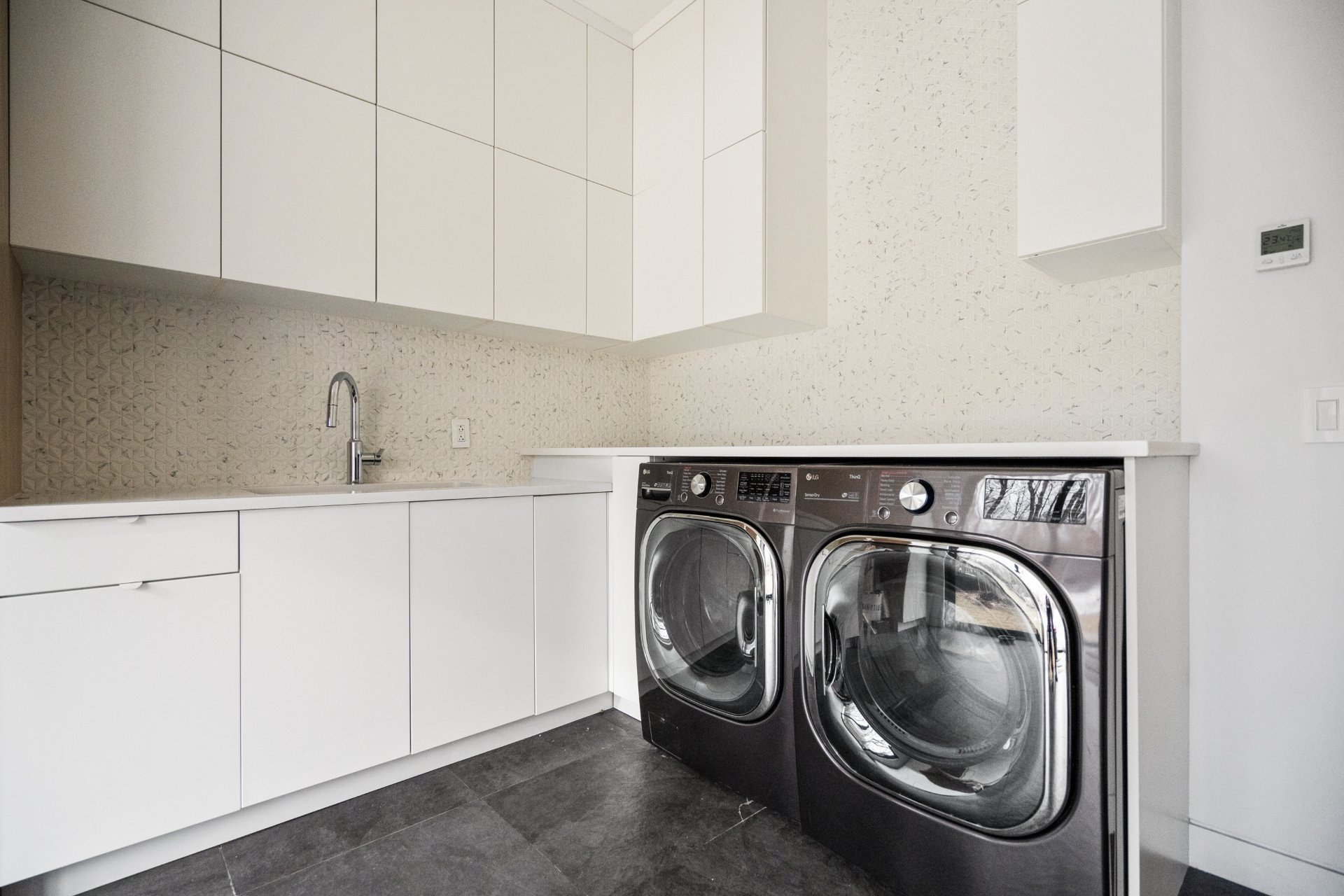 La commodité rencontre le luxe dans la buanderie séparée, avec des comptoirs en quartz, des planchers chauffants, un dosseret carrelé et des portes-fenêtres menant à la cour arrière.