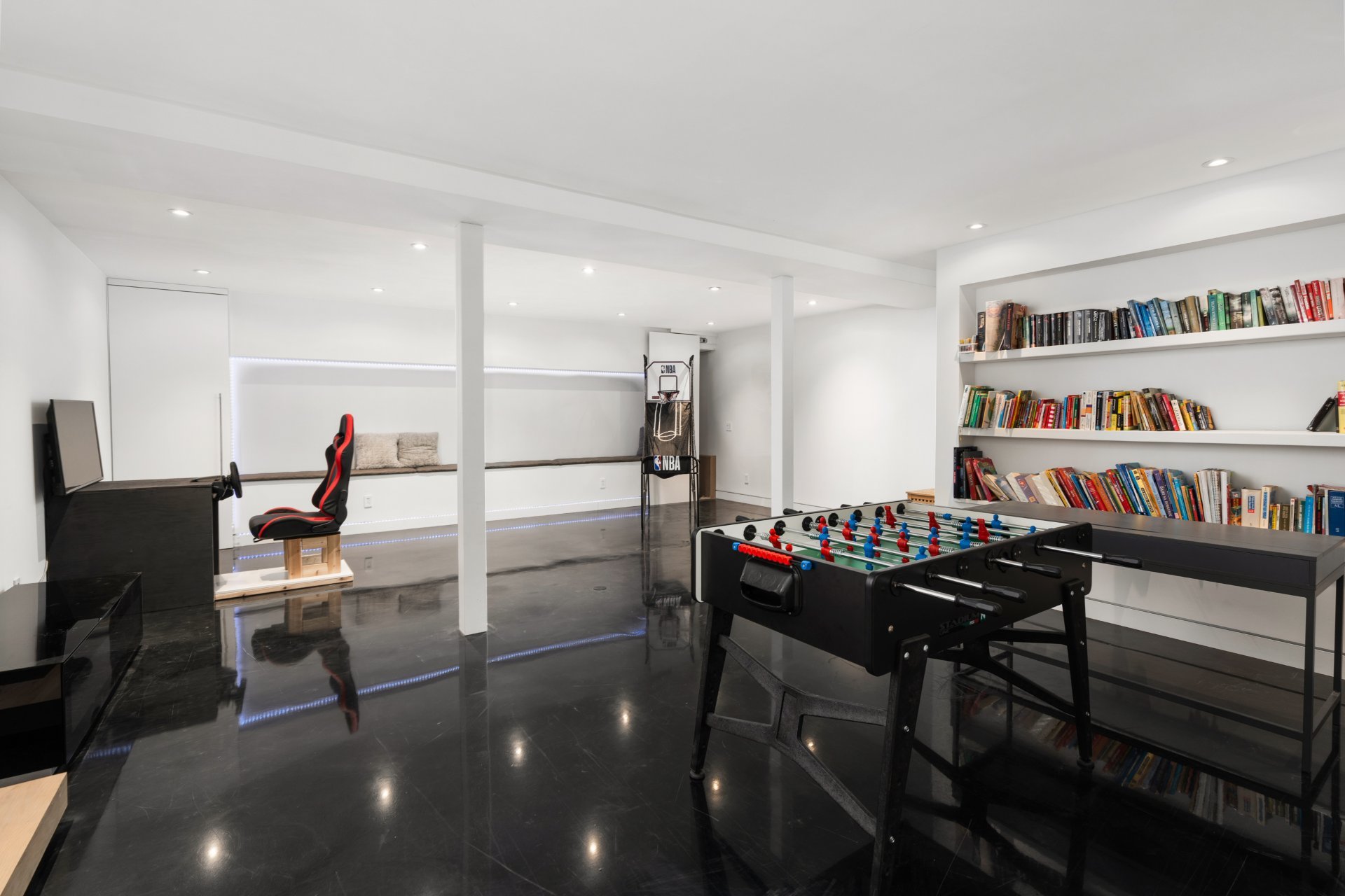 Le sous-sol entièrement aménagé offre un vaste espace pour les loisirs et la détente, avec une grande salle de jeux, une chambre d'amis, une salle de bains complète et un palier qui sert également de salle de dégustation de vin.