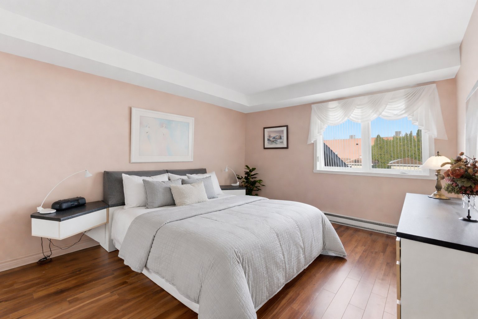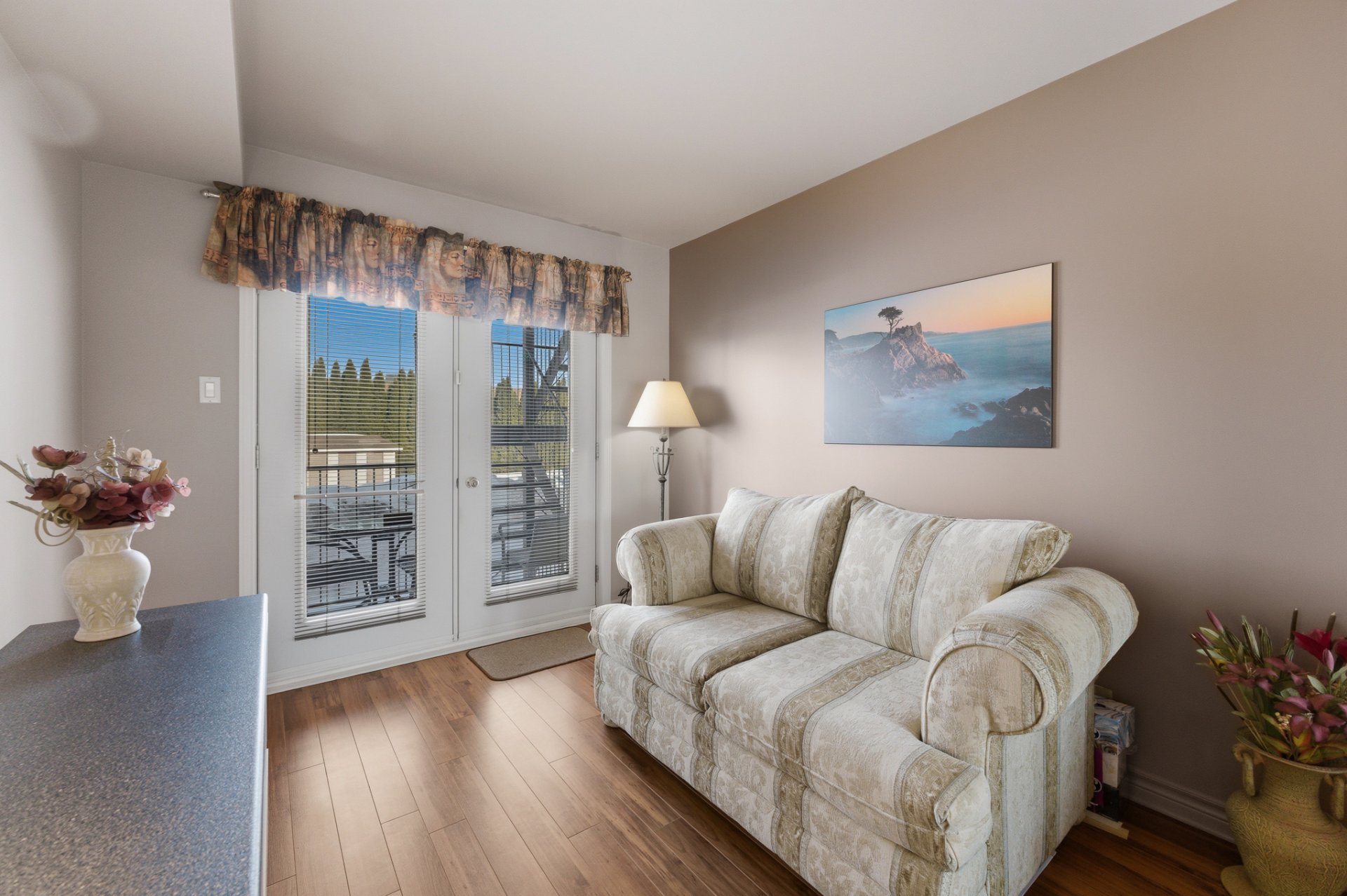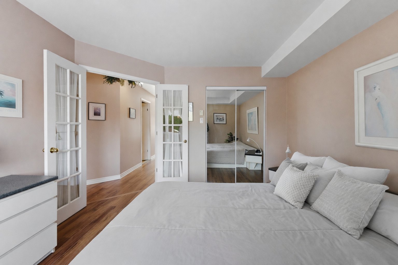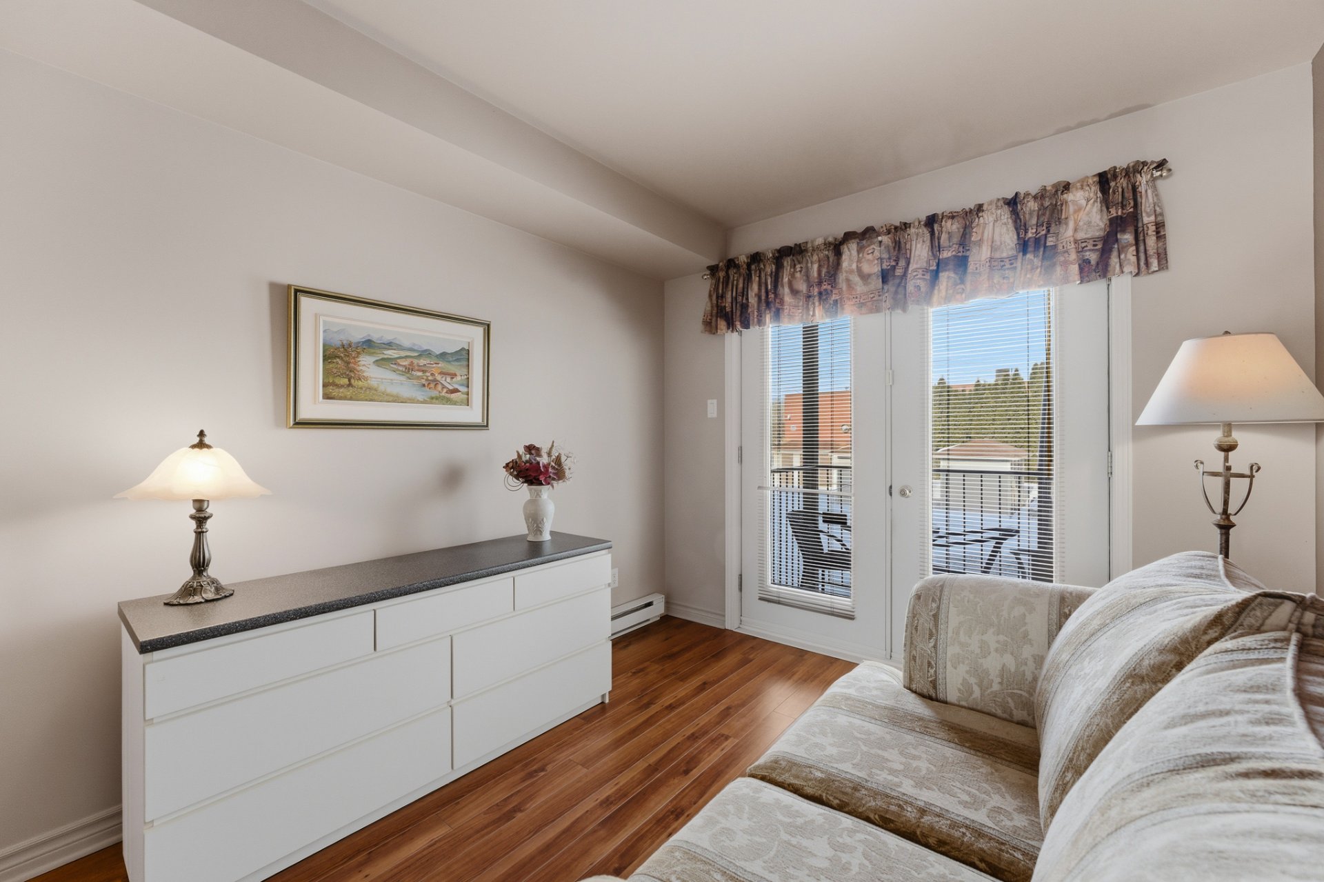 La chambre principale se distingue par ses élégantes portes françaises doubles, ajoutant une touche de caractère et de raffinement à la pièce. Une deuxième chambre qui peut servir de chambre d'invités, de bureau à domicile ou d'espace polyvalent selon vos besoins.