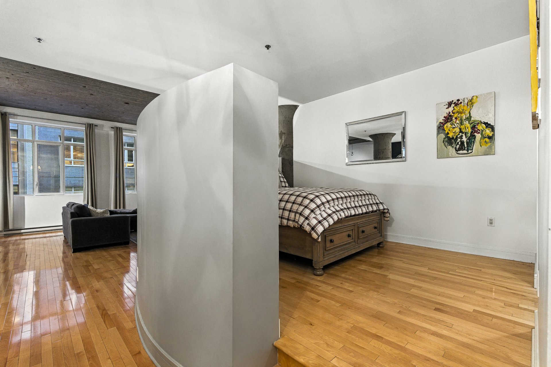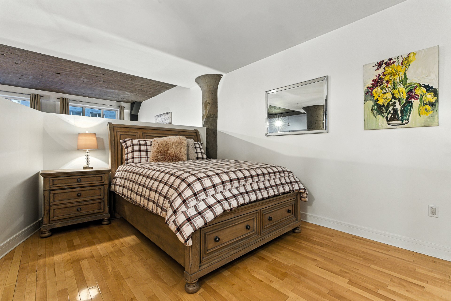 L'espace généreux à aire ouverte se distingue par une chambre en mezzanine avec grand walk-in, des colonnes de béton apparentes, de hauts plafonds et d'immenses fenêtres inondant l'unité de lumière naturelle.