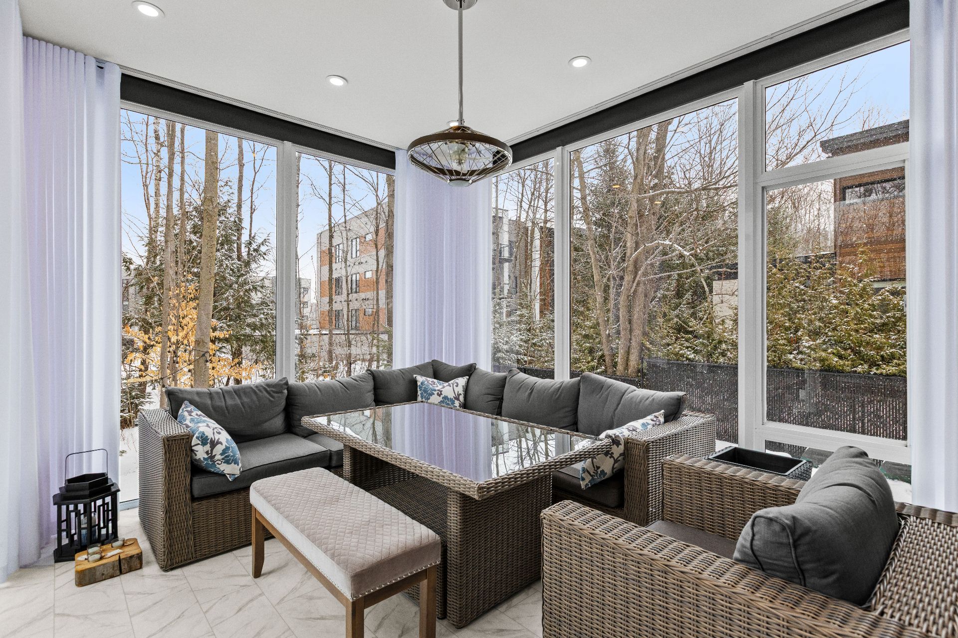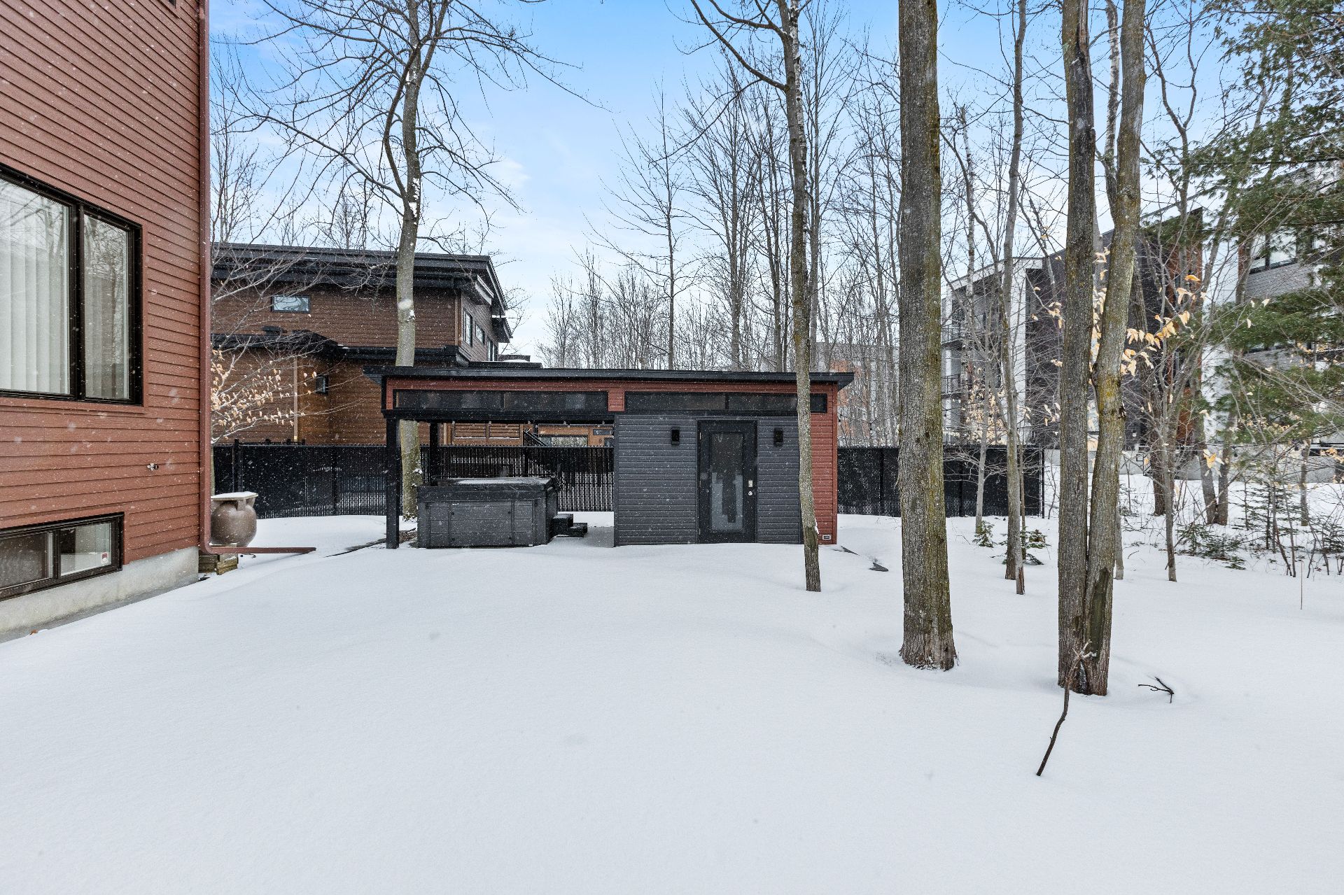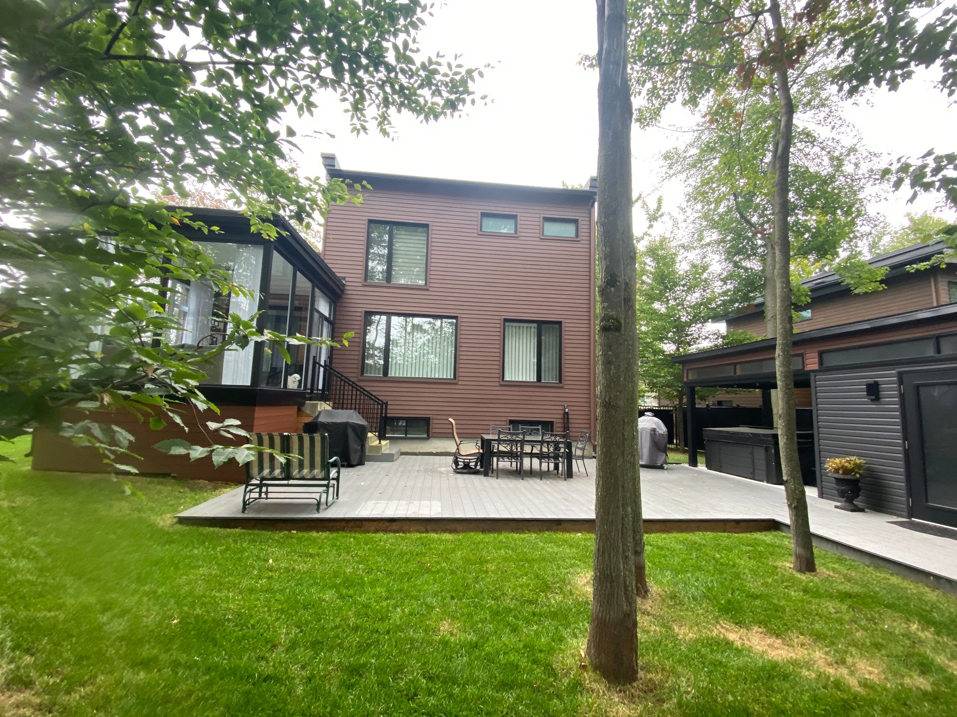 À l'extérieur, la cour intime, bordée d'arbres matures, se transforme en véritable oasis privée. La magnifique véranda 3 saisons devient un lieu de rassemblement privilégié pour les repas estivaux à l'abri des insectes, tandis que l'espace spa invite à la détente dans un environnement paisible et enveloppant.