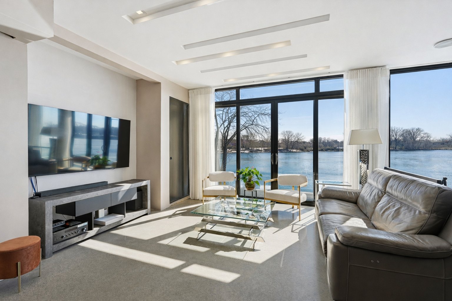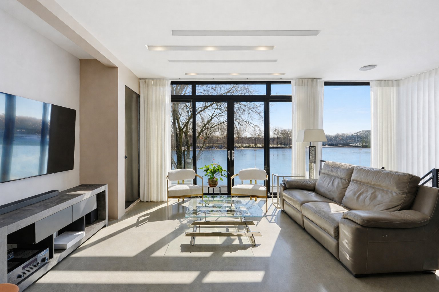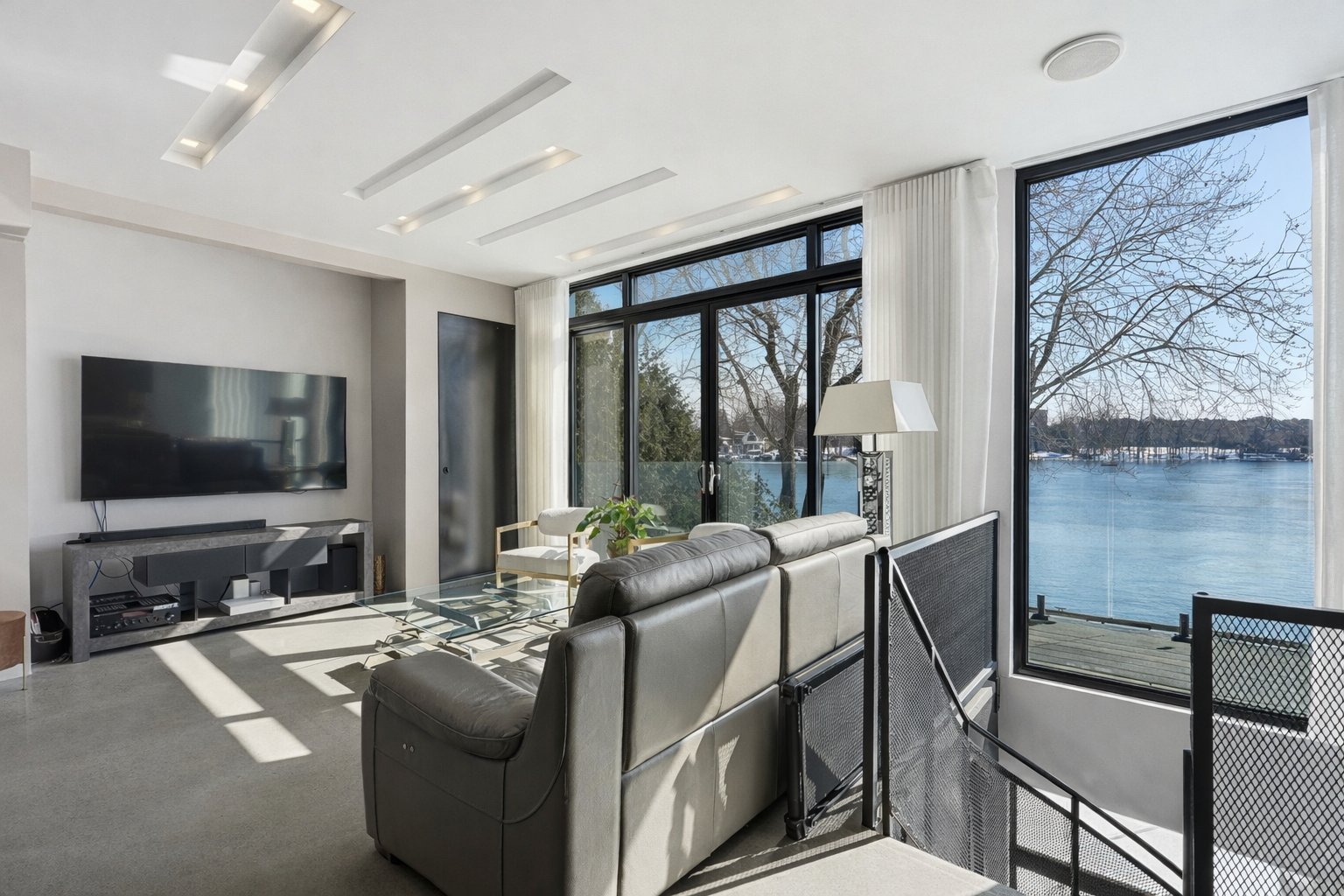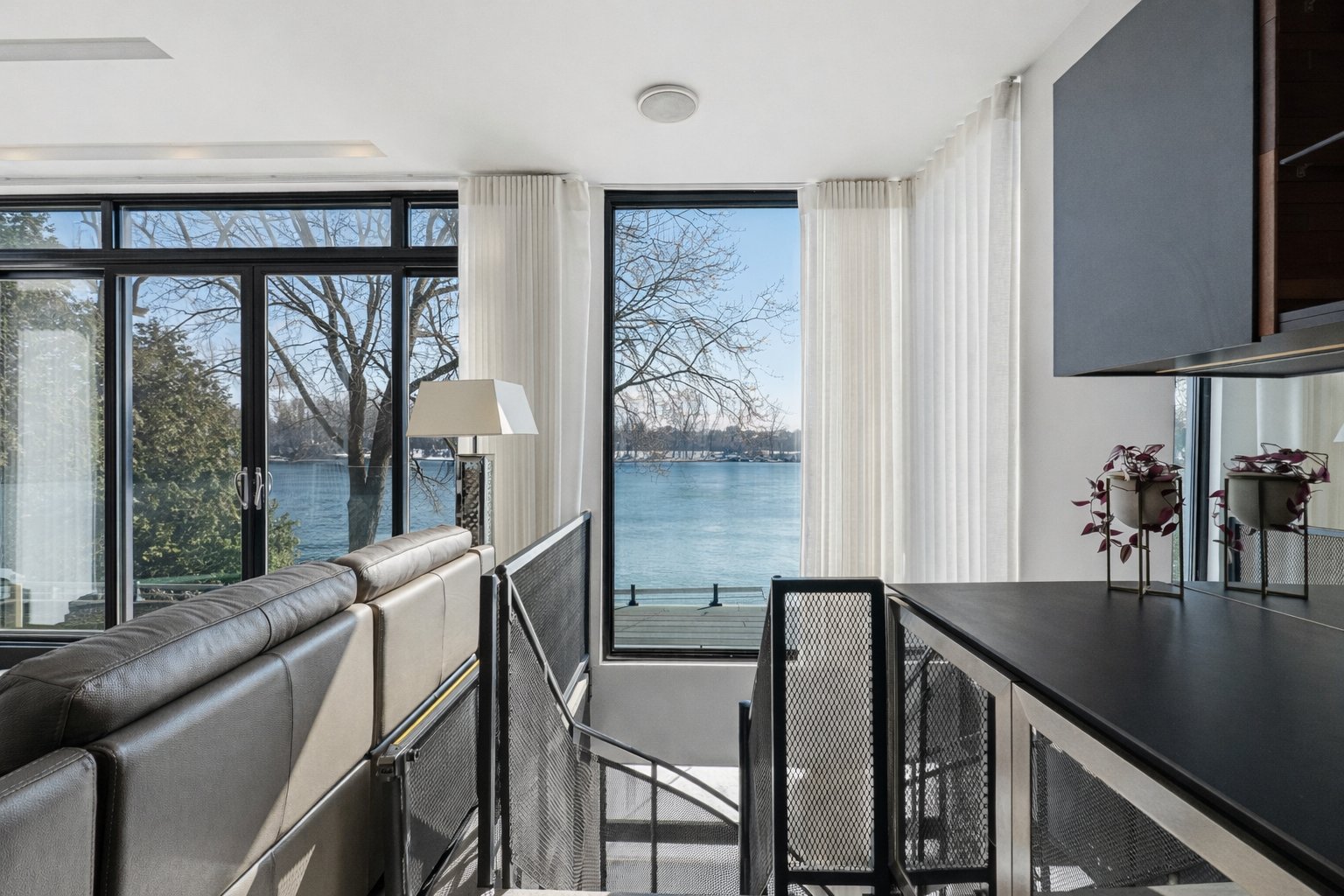 On découvre des espaces lumineux mis en valeur par de grandes fenêtres panoramiques qui laissent entrer une abondante lumière naturelle et offrent de superbes vues sur l'eau. Les impressionnantes hauteurs sous plafond et la conception ouverte contribuent à créer une atmosphère à la fois élégante et accueillante.
