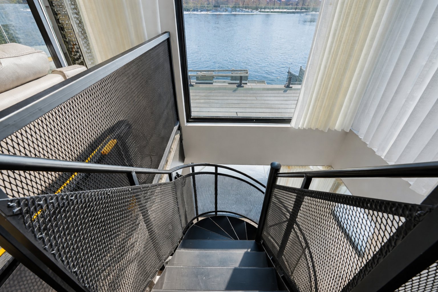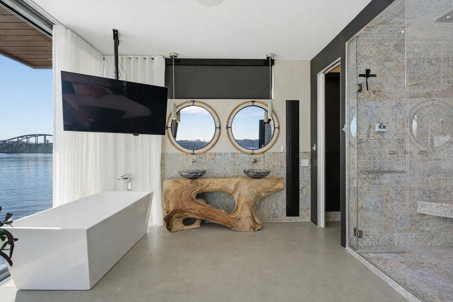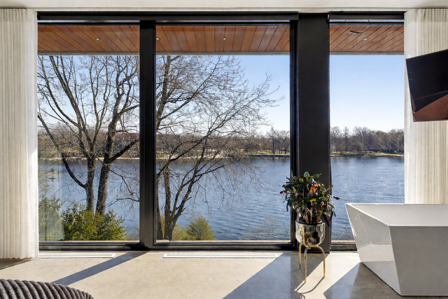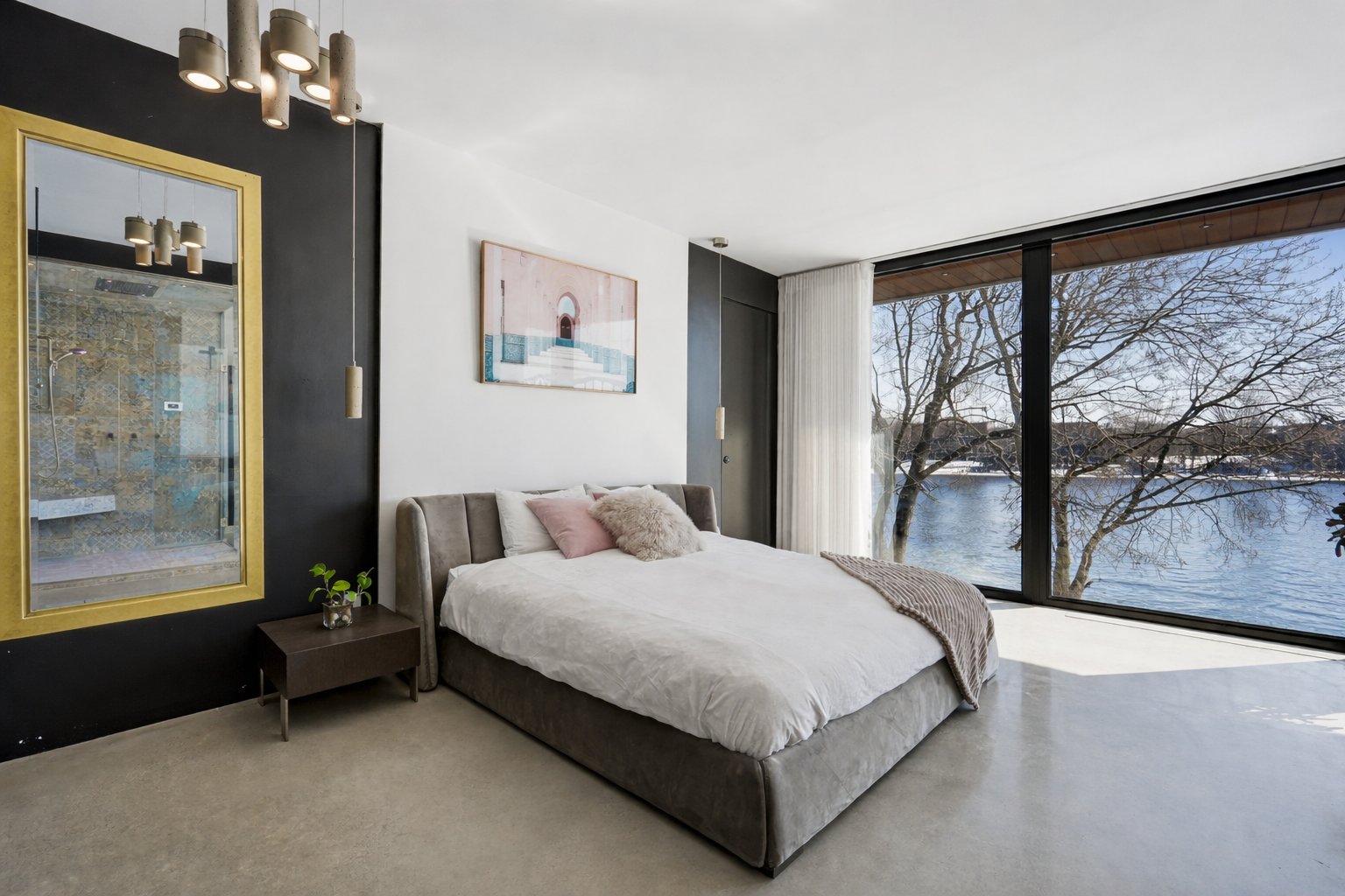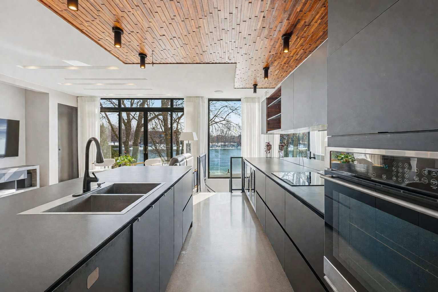 On découvre des espaces lumineux mis en valeur par de grandes fenêtres panoramiques qui laissent entrer une abondante lumière naturelle et offrent de superbes vues sur l'eau. Les impressionnantes hauteurs sous plafond et la conception ouverte contribuent à créer une atmosphère à la fois élégante et accueillante.