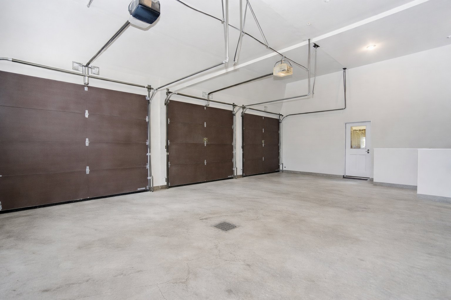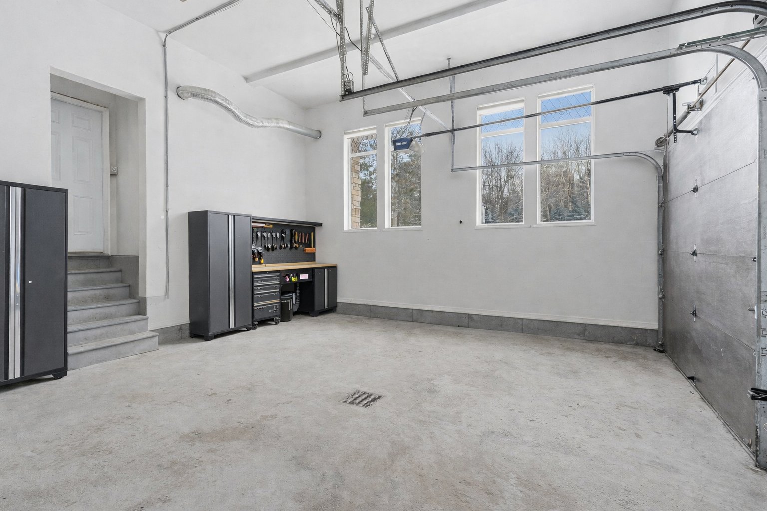 Le garage triple comprend deux espaces standards ainsi qu'un troisième pour petite voiture ou moto. Doté de plafonds de 14 pieds et de grandes fenêtres, il offre un potentiel d'aménagement intéressant.
