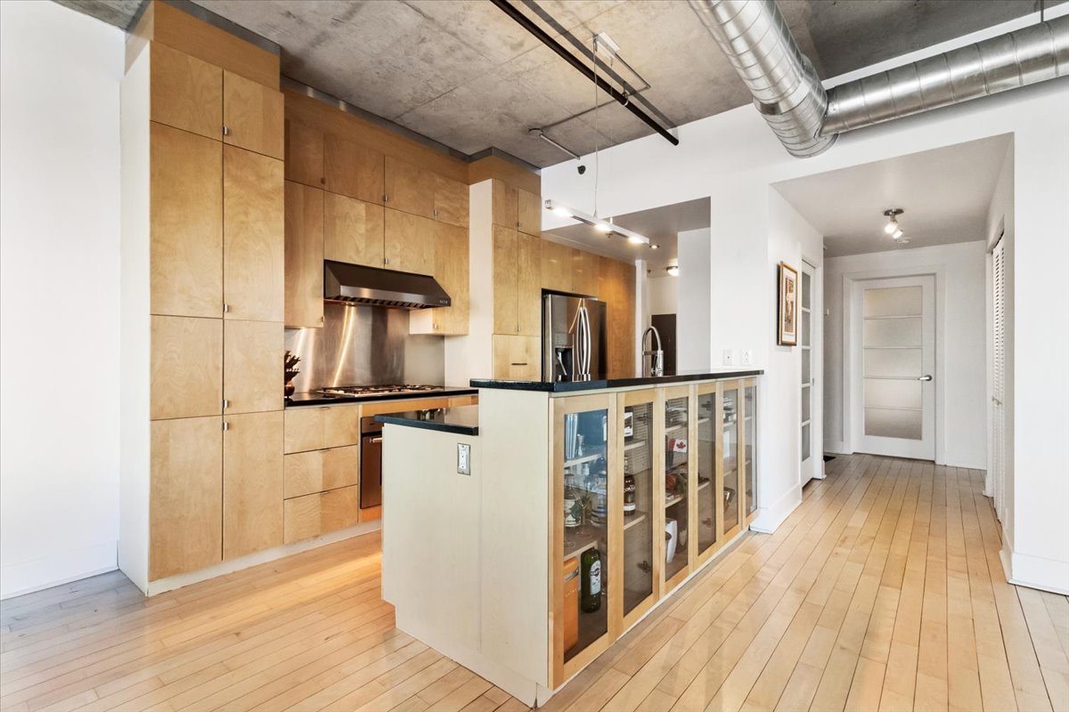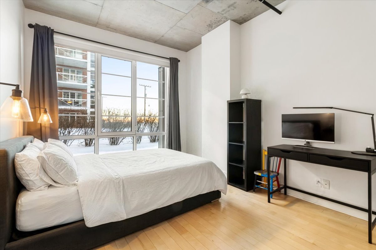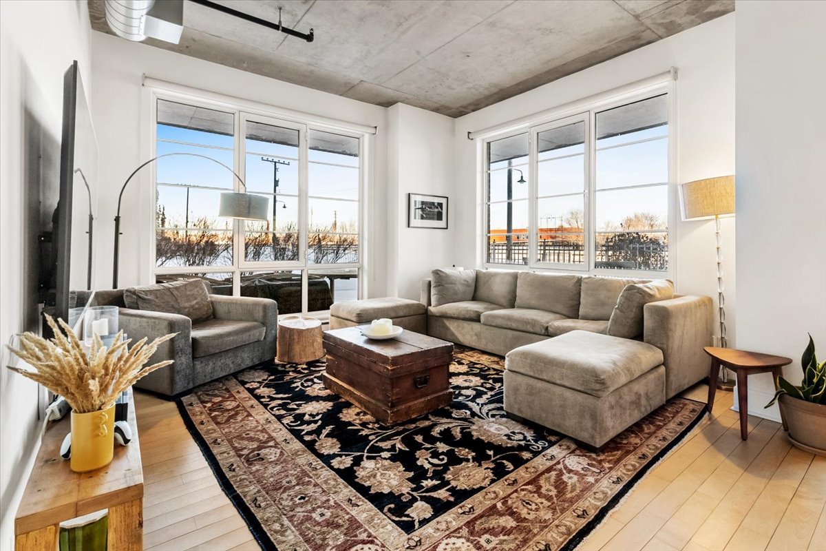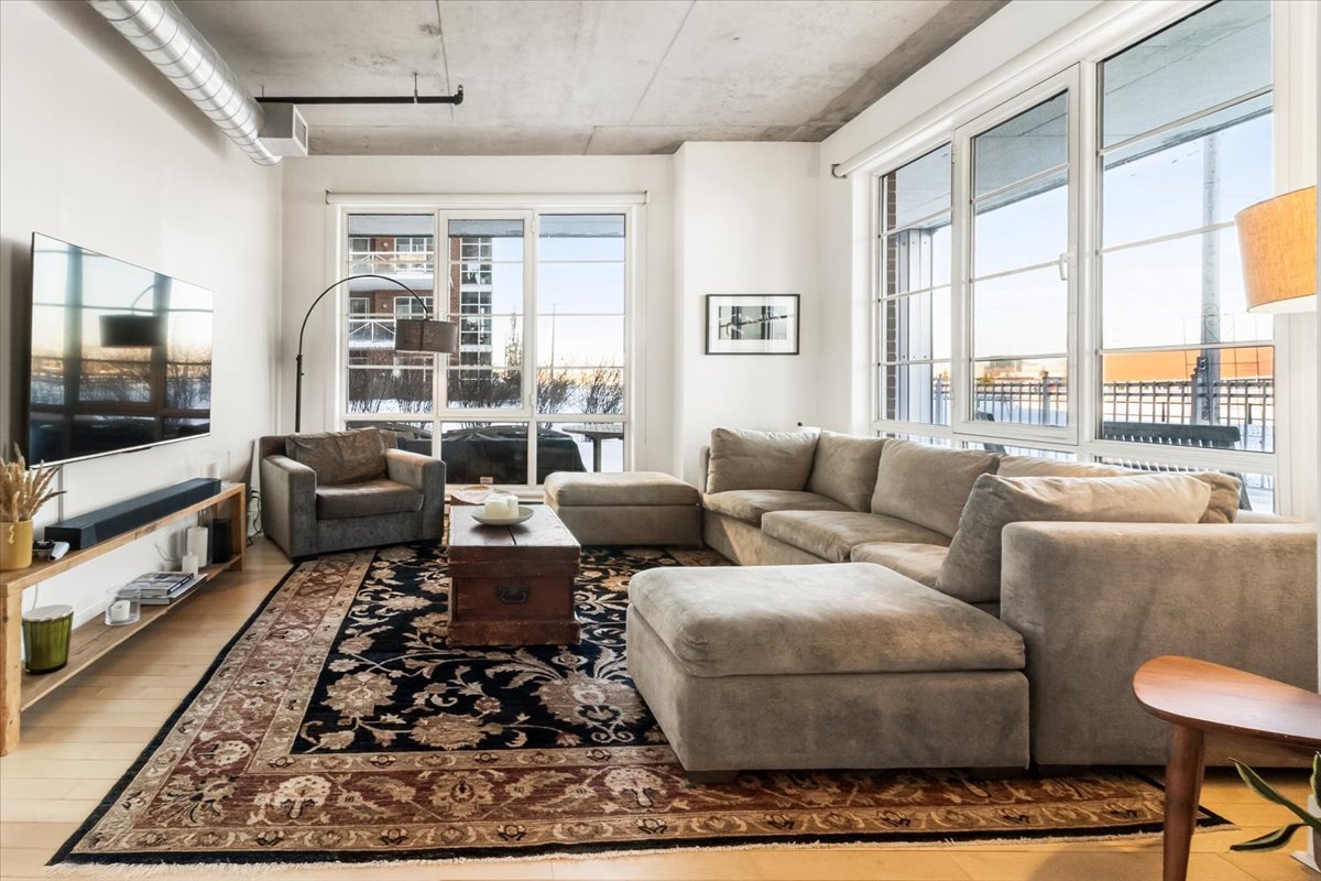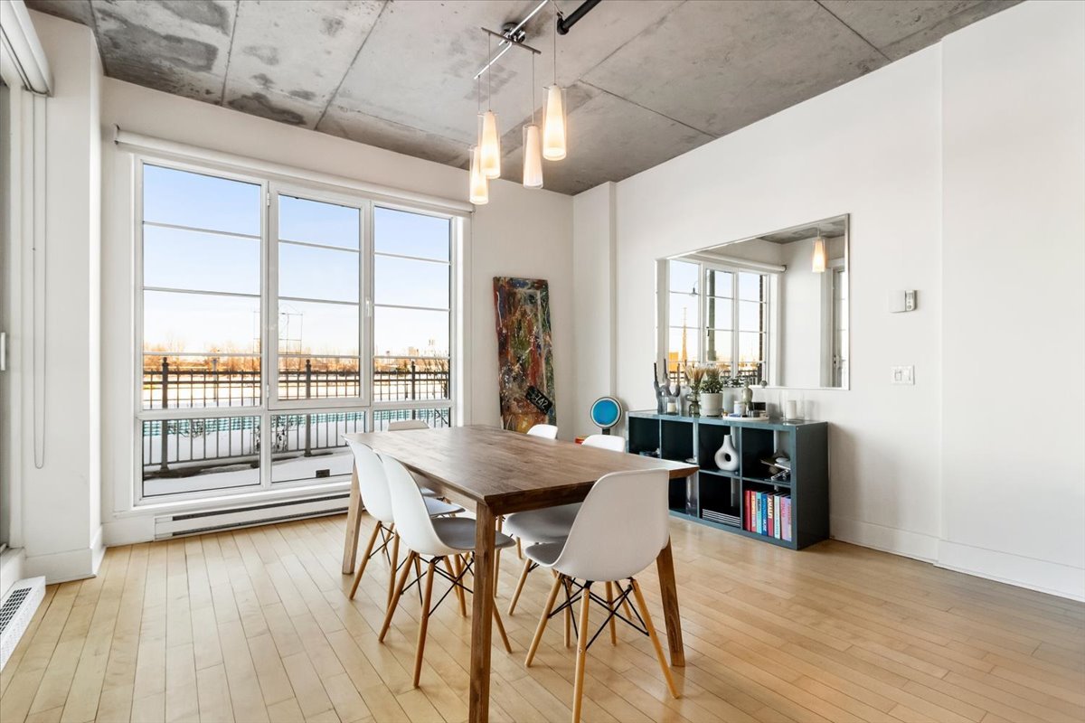 QUAI DES ÉCLUSIERS PHASE 2 | Superbe unité de coin en bordure du canal Lachine. Plafonds de béton de 10 pi, lattes de bois, fenestration abondante et vue sur l'eau. Deux chambres, 1 salle de bain et 1 salle d'eau. Cuisine avec comptoirs de granit et cuisinière au gaz. Grande terrasse privée de 735 pi2 avec vue sur le canal et le jardin. Thermopompe, garage et casier de rangement. Immeuble offrant piscine intérieure chauffée, sauna, salle d'exercice, cour intérieure et accès au quai.